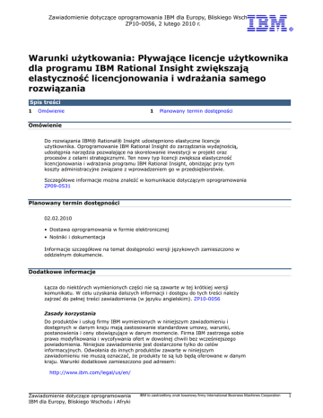 Zawiadomienie dotyczące oprogramowania IBM dla Europy, Bliskiego Wschodu i Afryki ZP10-0056, 2 lutego 2010 r. Warunki użytkowania: Pływające licencje użytkownika dla programu IBM Rational Insight zwiększają elastyczność licencjonowania i wdrażania samego rozwiązania Spis treści 1 Omówienie 1 Planowany termin dostępności Omówienie Do rozwiązania IBM® Rational® Insight udostępniono elastyczne licencje użytkownika. Oprogramowanie IBM Rational Insight do zarządzania wydajnością, udostępnia narzędzia pozwalające na skorelowanie inwestycji w projekt oraz procesów z celami strategicznymi. Ten nowy typ licencji zwiększa elastyczność licencjonowania i wdrażania programu IBM Rational Insight, obniżając przy tym koszty administracyjne związane z wprowadzeniem go w przedsiębiorstwie. Szczegółowe informacje można znaleźć w komunikacie dotyczącym oprogramowania ZP09-0531 Planowany termin dostępności 02.02.2010 • Dostawa oprogramowania w formie elektronicznej • Nośniki i dokumentacja Informacje szczegółowe na temat dostępności wersji językowych zamieszczono w oddzielnym dokumencie. Dodatkowe informacje Łącza do niektórych wymienionych części nie są zawarte w tej krótkiej wersji komunikatu. W celu uzyskania dalszych informacji i dostępu do tych treści należy zajrzeć do pełnej treści zawiadomienia (w języku angielskim). ZP10-0056 Zasady korzystania Do produktów i usług firmy IBM wymienionych w niniejszym zawiadomieniu i dostępnych w danym kraju mają zastosowanie standardowe umowy, warunki, postanowienia i ceny obowiązujące w danym momencie. Firma IBM zastrzega sobie prawo modyfikowania i wycofywania ofert w dowolnej chwili bez wcześniejszego powiadomienia. Niniejsze zawiadomienie jest dostarczone tylko do celów informacyjnych. Odwołania do innych produktów zawarte w niniejszym zawiadomieniu nie muszą oznaczać, że produkty te są lub będą oferowane w danym kraju. Warunki dodatkowe zamieszczono pod adresem: http://www.ibm.com/legal/us/en/ Zawiadomienie dotyczące oprogramowania IBM dla Europy, Bliskiego Wschodu i Afryki IBM to zastrze#ony znak towarowy firmy International Business Machines Corporation 1 Najnowsze informacje o produktach firmy IBM można uzyskać od przedstawiciela firmy IBM lub sprzedawcy jej produktów, a także na ogólnoświatowej stronie kontaktowej firmy IBM pod adresem http://www.ibm.com/planetwide/ Zawiadomienie dotyczące oprogramowania IBM Europa, Bliski Wschód i Afryka ZP10-0056 02.02.2010Spis treściOpcje dokumentuOpcje kontaktoweProszę o telefonWersja do drukuPowrót do początku, 8 grudnia 2009 r., 8 grudnia 2009 r., 8 grudnia 2009 r., 8 grudnia 2009 r., 8 grudnia 2009 r.Zawiadomienie dotyczące oprogramowania IBM dla Europy, Bliskiego Wschodu i AfrykiZP10-0056, 2 lutego 2010 r.IBM to zastrzeżony znak towarowy firmy International Business Machines Corporation Zawiadomienie dotyczące oprogramowania IBM dla Europy, Bliskiego Wschodu i Afryki IBM to zastrze#ony znak towarowy firmy International Business Machines Corporation 2