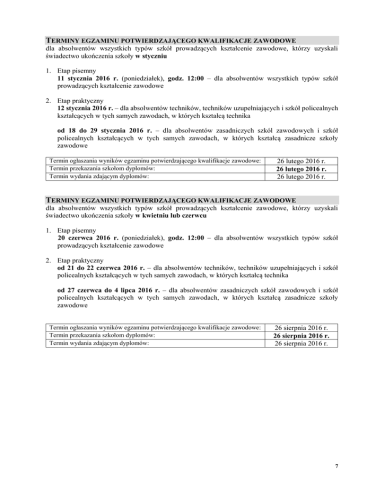 TERMINY EGZAMINU POTWIERDZAJĄCEGO KWALIFIKACJE ZAWODOWE dla absolwentów wszystkich typów szkół prowadzących kształcenie zawodowe, którzy uzyskali świadectwo ukończenia szkoły w styczniu 1. Etap pisemny 11 stycznia 2016 r. (poniedziałek), godz. 12:00 – dla absolwentów wszystkich typów szkół prowadzących kształcenie zawodowe 2. Etap praktyczny 12 stycznia 2016 r. – dla absolwentów techników, techników uzupełniających i szkół policealnych kształcących w tych samych zawodach, w których kształcą technika od 18 do 29 stycznia 2016 r. – dla absolwentów zasadniczych szkól zawodowych i szkół policealnych kształcących w tych samych zawodach, w których kształcą zasadnicze szkoły zawodowe Termin ogłaszania wyników egzaminu potwierdzającego kwalifikacje zawodowe: Termin przekazania szkołom dyplomów: Termin wydania zdającym dyplomów: 26 lutego 2016 r. 26 lutego 2016 r. 26 lutego 2016 r. TERMINY EGZAMINU POTWIERDZAJĄCEGO KWALIFIKACJE ZAWODOWE dla absolwentów wszystkich typów szkół prowadzących kształcenie zawodowe, którzy uzyskali świadectwo ukończenia szkoły w kwietniu lub czerwcu 1. Etap pisemny 20 czerwca 2016 r. (poniedziałek), godz. 12:00 – dla absolwentów wszystkich typów szkół prowadzących kształcenie zawodowe 2. Etap praktyczny od 21 do 22 czerwca 2016 r. – dla absolwentów techników, techników uzupełniających i szkół policealnych kształcących w tych samych zawodach, w których kształcą technika od 27 czerwca do 4 lipca 2016 r. – dla absolwentów zasadniczych szkół zawodowych i szkół policealnych kształcących w tych samych zawodach, w których kształcą zasadnicze szkoły zawodowe Termin ogłaszania wyników egzaminu potwierdzającego kwalifikacje zawodowe: Termin przekazania szkołom dyplomów: Termin wydania zdającym dyplomów: 26 sierpnia 2016 r. 26 sierpnia 2016 r. 26 sierpnia 2016 r. 7 TERMINY EGZAMINU POTWIERDZAJĄCEGO KWALIFIKACJE W ZAWODZIE W 2016 R. (kształcenie według nowej Podstawy programowej kształcenia w zawodach) Sesja 1.: styczeń – luty 2016 r. (z wyłączeniem Z.22 i Z.23) Część praktyczna Część pisemna w kwalifikacjach, w których jedynym w pozostałych kwalifikacjach rezultatem jest dokumentacja od 16 stycznia do 14 stycznia 2016 r. 15 stycznia 2016 r. 26 lutego 2016 r. Termin ogłaszania wyników egzaminu potwierdzającego kwalifikacje zawodowe: Termin przekazania szkołom, placówkom, pracodawcom oraz podmiotom prowadzącym kwalifikacyjne kursy zawodowe wyników egzaminu potwierdzającego kwalifikacje w zawodzie: Termin przekazania szkołom, placówkom i pracodawcom świadectw potwierdzających kwalifikacje w zawodzie oraz termin przekazania szkołom dyplomów potwierdzających kwalifikacje w zawodzie: 30 marca 2016 r. 30 marca 2016 r. 30 marca 2016 r. Sesja 2.: wyłącznie kwalifikacje Z.22 i Z.23 (technik pożarnictwa) Część praktyczna Część pisemna Z.22 11 kwietnia 2016 r. od 12 kwietnia do 29 kwietnia 2016 r. 7 czerwca 2016 r. Z.23 8 czerwca 2016 r. Termin ogłaszania wyników egzaminu potwierdzającego kwalifikacje zawodowe: Termin przekazania szkołom, placówkom, pracodawcom oraz podmiotom prowadzącym kwalifikacyjne kursy zawodowe wyników egzaminu potwierdzającego kwalifikacje w zawodzie: Termin przekazania szkołom, placówkom i pracodawcom świadectw potwierdzających kwalifikacje w zawodzie oraz termin przekazania szkołom dyplomów potwierdzających kwalifikacje w zawodzie: Z.22: 20 maja 2016 r. Z.23: 24 czerwca 2016 r. Z.22: 20 maja 2016 r. Z.23: 24 czerwca 2016 r. Z.22: 20 maja 2016 r. Z.23: 24 czerwca 2016 r. Sesja 3.: maj – lipiec 2016 r.* (z wyłączeniem Z.22 i Z.23) Część praktyczna Część pisemna w kwalifikacjach, w których jedynym w pozostałych kwalifikacjach rezultatem jest dokumentacja od 30 maja do 17 czerwca 2016 r. 23 czerwca 2016 r. 4 lipca 2016 r. * Egzaminy powinny zakończyć się do 30 czerwca 2016 r. W uzasadnionych przypadkach sesja może zostać przedłużona do 4 lipca 2016 r. Termin ogłaszania wyników egzaminu potwierdzającego kwalifikacje zawodowe: Termin przekazania szkołom, placówkom, pracodawcom oraz podmiotom prowadzącym kwalifikacyjne kursy zawodowe wyników egzaminu potwierdzającego kwalifikacje w zawodzie: Termin przekazania szkołom, placówkom i pracodawcom świadectw potwierdzających kwalifikacje w zawodzie oraz termin przekazania szkołom dyplomów potwierdzających kwalifikacje w zawodzie: 26 sierpnia 2016 r. 26 sierpnia 2016 r. 26 sierpnia 2016 r. 8 Sesja 4.: sierpień – październik 2016 r. Część pisemna 6 października 2016 r. 6 października 2016 r. Część praktyczna w kwalifikacjach, w których jedynym rezultatem jest w pozostałych kwalifikacjach dokumentacja od 16 sierpnia do 6 września – tylko M.11 i M.19 11 października 2016 r. od 6 września do 17 października 2016 r. – pozostałe kwalifikacje, w tym M.19 Z.22 od 6 października do 17 października 2016 r. Termin ogłaszania wyników egzaminu potwierdzającego kwalifikacje zawodowe: Termin przekazania szkołom, placówkom, pracodawcom oraz podmiotom prowadzącym kwalifikacyjne kursy zawodowe wyników egzaminu potwierdzającego kwalifikacje w zawodzie: Termin przekazania szkołom, placówkom i pracodawcom świadectw potwierdzających kwalifikacje w zawodzie oraz termin przekazania szkołom dyplomów potwierdzających kwalifikacje w zawodzie: 25 listopada 2016 r. 25 listopada 2016 r. 25 listopada 2016 r. dr Marcin Smolik dyrektor Centralnej Komisji Egzaminacyjnej 9