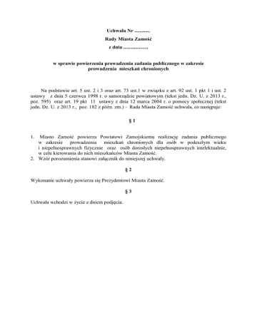 Uchwała Nr ............ Rady Miasta Zamość z dnia ................... w sprawie powierzenia prowadzenia zadania publicznego w zakresie prowadzenia mieszkań chronionych Na podstawie art. 5 ust. 2 i 3 oraz art. 73 ust.1 w związku z art. 92 ust. 1 pkt 1 i ust. 2 ustawy z dnia 5 czerwca 1998 r. o samorządzie powiatowym (tekst jedn. Dz. U. z 2013 r., poz. 595) oraz art. 19 pkt 11 ustawy z dnia 12 marca 2004 r. o pomocy społecznej (tekst jedn. Dz. U. z 2013 r., poz. 182 z późn. zm.) - Rada Miasta Zamość uchwala, co następuje: §1 Miasto Zamość powierza Powiatowi Zamojskiemu realizację zadania publicznego w zakresie prowadzenia mieszkań chronionych dla osób w podeszłym wieku i niepełnosprawnych fizycznie oraz osób dorosłych niepełnosprawnych intelektualnie, w celu kierowania do nich mieszkańców Miasta Zamość. 2. Wzór porozumienia stanowi załącznik do niniejszej uchwały. 1. §2 Wykonanie uchwały powierza się Prezydentowi Miasta Zamość. §3 Uchwała wchodzi w życie z dniem podjęcia. UZASADNIENIE do uchwały w sprawie prowadzenia mieszkań chronionych Mieszkanie chronione jest formą pomocy społecznej przygotowującą osoby tam przebywające, pod opieką specjalistów, do prowadzenia samodzielnego życia lub zastępującą pobyt w placówce zapewniającej całodobową opiekę. Mieszkanie chronione zapewnia warunki samodzielnego funkcjonowania w środowisku, w integracji ze społecznością lokalną. Ustawa o pomocy społecznej umożliwia pobyt w mieszkaniu chronionych osobom, które ze względu na trudną sytuację życiową, wiek, niepełnosprawność lub chorobę potrzebują wsparcia w funkcjonowaniu w codziennym życiu, ale nie wymagają usług w zakresie świadczonym przez jednostkę całodobowej opieki (jaką jest np. dom pomocy społecznej). Dotyczy to w szczególności: osób z zaburzeniami psychicznymi, opuszczających pieczę zaszepczą w rozumieniu przepisów o wspieraniu rodziny i systemie pieczy zastępczej, młodzieżowy ośrodek wychowawczy, zakład dla nieletnich, a także cudzoziemców, którzy uzyskali w Polsce status uchodźcy lub ochronę uzupełniającą. Celem mieszkania chronionego jest: usamodzielnienie osób tam przebywających, readaptacja do samodzielności życiowej i powrót do środowiska, godne samodzielne zamieszkiwanie, wsparcie i opieka, rehabilitacja społeczna, pomoc w uzyskaniu dostępu do podstawowej opieki lekarskiej i pielęgniarskiej, integracja ze środowiskiem, samorealizacja. Funkcjonujące na terenie Powiatu Zamojskiego mieszkania chronione prowadzone przez Domy Pomocy Społecznej w Krasnobrodzie i Szczebrzeszynie są przeznaczone dla osób zgodnie z typami domów, tj. dla osób w podeszłym wieku oraz osób niepełnosprawnych fizycznie w Krasnobrodzie oraz dla osób dorosłych niepełnosprawnych intelektualnie w Szczebrzeszynie. Na terenie Miasta Zamość funkcjonują dwa mieszkania chronione, prowadzone przez Ośrodek Interwencji Kryzysowej w Zamościu przeznaczone dla usamodzielnianych wychowanków kontynuujących naukę, dysponujące łącznie 10 miejscami – 6 miejsc dla dziewcząt i 4 miejsca dla chłopców. Wobec rosnącego zainteresowania (szczególnie osób starszych, niepełnosprawnych intelektualnie) tą formą pomocy zachodzi konieczność umożliwienia mieszkańcom Miasta Zamość korzystania z mieszkań chronionych prowadzonych przez jednostki organizacyjne pomocy społecznej na terenie Powiatu Zamojskiego.