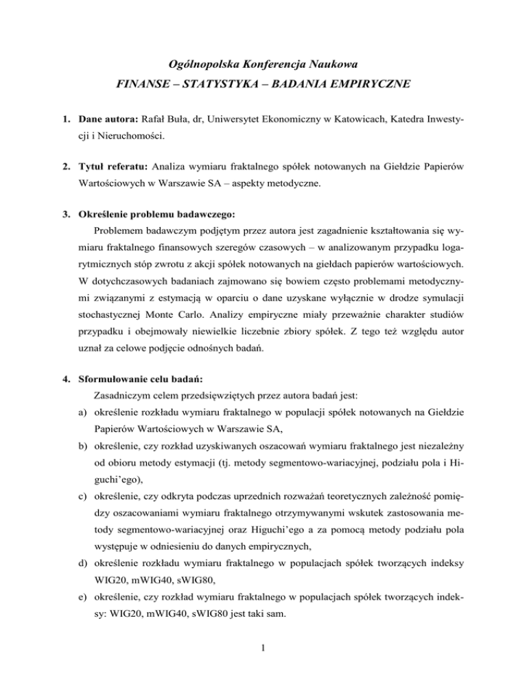 Ogólnopolska Konferencja Naukowa FINANSE – STATYSTYKA – BADANIA EMPIRYCZNE 1. Dane autora: Rafał Buła, dr, Uniwersytet Ekonomiczny w Katowicach, Katedra Inwestycji i Nieruchomości. 2. Tytuł referatu: Analiza wymiaru fraktalnego spółek notowanych na Giełdzie Papierów Wartościowych w Warszawie SA – aspekty metodyczne. 3. Określenie problemu badawczego: Problemem badawczym podjętym przez autora jest zagadnienie kształtowania się wymiaru fraktalnego finansowych szeregów czasowych – w analizowanym przypadku logarytmicznych stóp zwrotu z akcji spółek notowanych na giełdach papierów wartościowych. W dotychczasowych badaniach zajmowano się bowiem często problemami metodycznymi związanymi z estymacją w oparciu o dane uzyskane wyłącznie w drodze symulacji stochastycznej Monte Carlo. Analizy empiryczne miały przeważnie charakter studiów przypadku i obejmowały niewielkie liczebnie zbiory spółek. Z tego też względu autor uznał za celowe podjęcie odnośnych badań. 4. Sformułowanie celu badań: Zasadniczym celem przedsięwziętych przez autora badań jest: a) określenie rozkładu wymiaru fraktalnego w populacji spółek notowanych na Giełdzie Papierów Wartościowych w Warszawie SA, b) określenie, czy rozkład uzyskiwanych oszacowań wymiaru fraktalnego jest niezależny od obioru metody estymacji (tj. metody segmentowo-wariacyjnej, podziału pola i Higuchi’ego), c) określenie, czy odkryta podczas uprzednich rozważań teoretycznych zależność pomiędzy oszacowaniami wymiaru fraktalnego otrzymywanymi wskutek zastosowania metody segmentowo-wariacyjnej oraz Higuchi’ego a za pomocą metody podziału pola występuje w odniesieniu do danych empirycznych, d) określenie rozkładu wymiaru fraktalnego w populacjach spółek tworzących indeksy WIG20, mWIG40, sWIG80, e) określenie, czy rozkład wymiaru fraktalnego w populacjach spółek tworzących indeksy: WIG20, mWIG40, sWIG80 jest taki sam. 1 5. Sformułowanie pytań badawczych lub hipotez badawczych: Uwzględniając zakreślony cel badań autor postawił następujące hipotezy badawcze, poddawane następnie próbom falsyfikacji w oparciu o analizę danych empirycznych: a) rozkład wymiaru fraktalnego w populacji spółek notowanych na Giełdzie Papierów Wartościowych w Warszawie SA, jak również w populacjach spółek tworzących indeksy WIG20, mWIG40, sWIG80 jest rozkładem zbliżonym do rozkładu gaussowskiego, b) oszacowania uzyskiwane za pomocą metody podziału pola oraz pozostałych różnią się istotnie (zarówno typem rozkładu jak i parametrami), c) pomiędzy wymiarem fraktalnym szacowanym za pomocą metody podziału pola a pozostałymi występuje zależność potęgowa, d) rozkłady wymiaru fraktalnego w populacjach spółek tworzących indeksy: WIG20, mWIG40, sWIG80 różnią się co najmniej w odniesieniu do wartości średniej. 6. Opis danych i metodologii: W analizach prowadzonych przez autora wykorzystano ceny akcji notowanych na Giełdzie Papierów Wartościowych w Warszawie SA. Obliczając logarytmiczne stopy zwrotu posiłkowano się danymi udostępnionymi przez serwis stooq.pl. Zasadniczą przesłanką przemawiającą za wykorzystaniem owych kwotowań był fakt, że uwzględniają one odpowiednio przeliczone wypłacone pożytki z akcji, a zatem unika się tu skokowych zmian cen wywołanych wyłącznie ich wypłatą. Analiza miała objąć wszystkie spółki notowane na Giełdzie Papierów Wartościowych w Warszawie SA w dn. 31 lipca 2016 r. W obliczeniach posiłkowano się danymi dziennymi, dlatego też wykorzystano notowania począwszy od dn. 3 października 1994 r. (od kiedy to sesje na warszawskiej giełdzie mają miejsce codziennie). Tak określona populacja spółek liczy 482 elementy. Spośród nich postanowiono usunąć (przy założeniu, że w roku odbywa się 250 sesji): a) spółki, których historia notowań obejmowała mniej niż 1250 obserwacji (tj. mniej niż 5 lat), b) spółki, dla których przeciętna liczba notowań w ciągu roku była mniejsza niż 225 (tj. o więcej niż 10% teoretycznej liczby notowań), c) spółki, w przypadku których choć jeden odstęp pomiędzy notowaniami był dłuższy niż 21 dni. 2 W rezultacie posiłkowano się populacją 280 spółek spełniających wspomniane obostrzenia. Badaniu poddano skumulowane logarytmiczne stopy zwrotu. Wymiar fraktalny przedmiotowych szeregów czasowych oszacowano z wykorzystaniem czterech metod: a) metody segmentowo-wariacyjnej, b) metody podziału pola, c) metody Higuchi’ego, d) metody Higuchi’ego z wagami wykładniczymi. Uzyskane w powyższy sposób oszacowania wymiaru fraktalnego poddano następnie analizie z wykorzystaniem rozmaitych procedur i testów statystycznych mających na celu: a) zweryfikowanie hipotez o normalności rozkładu oszacowań wymiaru fraktalnego w badanych populacjach spółek (test zgodności χ2, test Jarque-Bera), b) zweryfikowanie hipotezy o identyczności rozkładów oszacowań wymiaru fraktalnego uzyskanych za pomocą odmiennych metod estymacji (test Kołmogorowa, klasyczne testy równości średnich i wariancji), c) zweryfikowanie hipotezy o liniowej bądź nieliniowej zależności pomiędzy oszacowaniami wymiaru fraktalnego uzyskanymi za pomocą metody podziału pola oraz pozostałych metod (analiza regresji), d) zweryfikowanie hipotezy o identyczności rozkładów oszacowań wymiaru fraktalnego w populacjach spółek tworzących indeksy: WIG20, mWIG40, sWIG80. 7. Wyniki: Przeprowadziwszy wspomniane badania uzyskano następujące rezultaty: a) brak jest przesłanek by odrzucić hipotezę o normalności rozkładu wymiaru fraktalnego oszacowanego za pomocą metody segmentowo-wariacyjnej oraz Higuchi’ego, natomiast hipotezę tę należy odrzucić (poziom istotności 5%) dla metody podziału pola, b) metoda podziału pola dostarcza zdecydowanie niższych oszacowań wymiaru fraktalnego niż pozostałe metody, a empiryczna wariancja jest istotnie większa, c) procedura w
