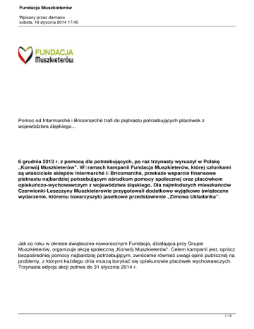 Fundacja Muszkieterów Wpisany przez damiano sobota, 18 stycznia 2014 17:45 Pomoc od Intermarché i Bricomarché trafi do piętnastu potrzebujących placówek z województwa śląskiego... 6 grudnia 2013 r. z pomocą dla potrzebujących, po raz trzynasty wyruszył w Polskę „Konwój Muszkieterów”. W ramach kampanii Fundacja Muszkieterów, której członkami są właściciele sklepów Intermarché i Bricomarché, przekaże wsparcie finansowe pietnastu najbardziej potrzebującym ośrodkom pomocy społecznej oraz placówkom opiekuńczo-wychowawczym z województwa śląskiego. Dla najmłodszych mieszkańców Czerwionki-Leszczyny Muszkieterowie przygotowali dodatkowo wyjątkowe świąteczne wydarzenie, któremu towarzyszyło jasełkowe przedstawienie „Zimowa Układanka”. Jak co roku w okresie świąteczno-noworocznym Fundacja, działająca przy Grupie Muszkieterów, organizuje akcję społeczną „Konwój Muszkieterów”. Celem kampanii jest, oprócz bezpośredniej pomocy najbardziej potrzebującym, zwrócenie również uwagi opinii publicznej na problemy, z którymi każdego dnia muszą borykać się opiekunowie placówek wychowawczych. Trzynasta edycja akcji potrwa do 31 stycznia 2014 r. 1/9 Fundacja Muszkieterów Wpisany przez damiano sobota, 18 stycznia 2014 17:45 Pomoc finansowa od Muszkieterów trafi do najbardziej potrzebujących placówek i ośrodków z miast, w których działają supermarkety Intermarché i Bricomarché, takich jak domy dziecka, placówki opiekuńczo-wychowawcze, parafialne zespoły Caritas czy ośrodki dla młodzieży angażujące się w rozwój swoich wychowanków. Fundacja wraz z właścicielami sklepów obu sieci dotrze z pomocą do około 300 instytucji z różnych zakątków Polski, w tym do pietnastu ze Ś ląsk a . Supermarkety Intermarché i Bricomarché działające na terenie województwa śląskiego wytypowały placówki ze swojej miejscowości lub okolicy, które otrzymają wsparcie finansowe od Fundacji w wysokości 3.500 złotych. Łączna pomoc, jaka trafi do placówek z województwa śląskiego, wyniesie 59.500 złotych. MIASTO SUPERMARKET NAZWA PLACÓWKI Bytom Intermarché Przedszkole Miejskie nr 24 w Bytomiu Chybie Intermarché Diakonia Kościoła Ewangelicko-Augsburskiego w Drogomyślu Czerwionka-Leszczyny Intermarché Stowarzyszenie „jestem” w Czerwionce-Leszczynach Częstochowa Intermarché 2/9 Fundacja Muszkieterów Wpisany przez damiano sobota, 18 stycznia 2014 17:45 Katolickie Ognisko Wychowawcze Św. Melchiora Dabrowa Górnicza Intermarché Dom Pomocy Społecznej Dla Dzieci Prowadzony Przez Zgromadzenie Sióstr Opa Knurów Intermarché Towarzystwo Krzewienia Kultury Fizycznej w Szygłowicach Lubliniec Intermarché Specjalistyczny Ośrodek Szkolno-Wychowawczy w Lublińcu Pawłowice Intermarché Ochronka Sióstr Służebniczek Najświętszej Maryi Panny Piekary Śląskie Intermarché Stowarzyszenie na rzecz pomocy wychowankom i byłym wychowankom Domu Dziecka w Pieka Pszczyna Bricomarché Centrum Wsparcia Dziecka i Rodziny „Przystań” 3/9 Fundacja Muszkieterów Wpisany przez damiano sobota, 18 stycznia 2014 17:45 Pszczyna Intermarché Polskie Stowarzyszenie na rzecz Osób z Upośledzeniem Umysłowym Radlin Intermarché Parafia Rzymskokatolicka p.w. Wniebowzięcia N.M.P Ruda Śląska Intermarché Stowarzyszenie św. Filipa Nereusza w Rudzie Śląskiej Strumień Intermarché 4/9 Fundacja Muszkieterów Wpisany przez damiano sobota, 18 stycznia 2014 17:45 Diakonia Kościoła Ewangelicko-Augsburskiego w Drogomyślu Zawiercie Bricomarché Ośrodek Usług Opiekuńczo-Wychowawczych w Zawierciu Zawiercie Intermarché Ośrodek Usług Opiekuńczo-Wychowawczych w Zawierciu Żywiec Intermarché Fundacja Dzieciom „Zdążyć z Pomocą” 5/9 Fundacja Muszkieterów Wpisany przez damiano sobota, 18 stycznia 2014 17:45 Otrzymane fundusze przeznaczone zostaną przez wsparte ośrodki na najważniejsze i najpilniejsze potrzeby statutowe, ale także na organizację wyjazdów dla ich podopiecznych czy zakup sprzętu rehabilitacyjnego. - W całym kraju, w tym także w województwie śląskim, działa wiele ośrodków, pomagających biednym, pokrzywdzonym przez los dzieciom czy rodzinom żyjącym w ciężkich warunkach. Misja, która przyświeca nam jako Muszkieterom, to pomoc najbardziej potrzebującym wśród naszych najbliższych sąsiadów. Chcemy uczestniczyć zatem w życiu lokalnych społeczności, wśród których jesteśmy obecni, wspierać je i pomagać w rozwiązywaniu trapiących je problemów. Cieszymy się, że dzięki naszemu wsparciu placówki z całej Polski, w tym także ze Śląska mogą nadal spełniać w swoich regionach ważne społeczne misje, a pomoc bliźnim ma szczególną wartość i znaczenie w okresie świąteczno-noworocznym – podkreśla Marek Feruga, Prezes Fundacji Muszkieterów. Do akcji mogą bezpośrednio przyłączyć się klienci supermarketów Intermarché i Bricomarché. W tym celu za symboliczną złotówkę mogą kupić specjalne torby zakupowe dostępne w sklepach obu sieci, z których dochód przekazany zostanie w całości na pomoc dla wspieranych placówek. - Każdy może stać się członkiem „Konwoju Muszkieterów” i mieć swoją cegiełkę we wsparciu najbardziej potrzebujących placówek ze swojej okolicy – dodaje Marek Feruga . W „Konwój Muszkieterów” zaangażują się również znane postaci, w tym artyści estradowi. Wśród ambasadorów poprzednich edycji kampanii znaleźli się m.in. Halina Mlynkova, Krzysztof Krawczyk, Natalia Kukulska, Stanisław Soyka, Bracia Golcowie oraz Ania Wyszkoni, a w tym roku twarzą kampanii jest zespół Pectus, który odwiedzi z programem noworocznym placówki z Bolesławca oraz Białej Podlaskiej. Podobnie jak w latach poprzednich, w ramach inicjatywy 6/9 Fundacja Muszkieterów Wpisany przez damiano sobota, 18 stycznia 2014 17:45 Muszkieterowie organizują wyjątkowe wydarzenia dla najmłodszych mieszkańców 15 miejscowości, którym towarzyszą w