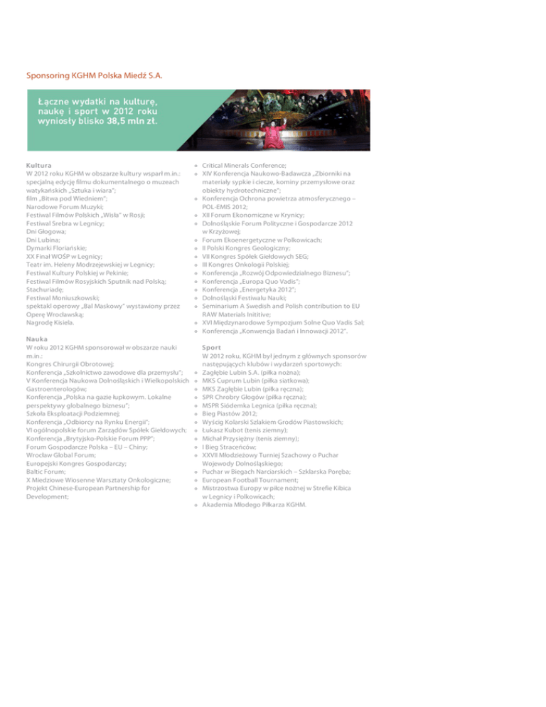 Sponsoring KGHM Polska Miedź S.A. K ult ur a W 2012 roku KGHM w obszarze kultury wsparł m.in.: specjalną edycję filmu dokumentalnego o muzeach watykańskich „Sztuka i wiara”; film „Bitwa pod Wiedniem”; Narodowe Forum Muzyki; Festiwal Filmów Polskich „Wisła” w Rosji; Festiwal Srebra w Legnicy; Dni Głogowa; Dni Lubina; Dymarki Floriańskie; XX Finał WOŚP w Legnicy; Teatr im. Heleny Modrzejewskiej w Legnicy; Festiwal Kultury Polskiej w Pekinie; Festiwal Filmów Rosyjskich Sputnik nad Polską; Stachuriadę; Festiwal Moniuszkowski; spektakl operowy „Bal Maskowy” wystawiony przez Operę Wrocławską; Nagrodę Kisiela. Nauk a W roku 2012 KGHM sponsorował w obszarze nauki m.in.: Kongres Chirurgii Obrotowej; Konferencja „Szkolnictwo zawodowe dla przemysłu”; V Konferencja Naukowa Dolnośląskich i Wielkopolskich Gastroenterologów; Konferencja „Polska na gazie łupkowym. Lokalne perspektywy globalnego biznesu”; Szkoła Eksploatacji Podziemnej; Konferencja „Odbiorcy na Rynku Energii”; VI ogólnopolskie forum Zarządów Spółek Giełdowych; Konferencja „Brytyjsko-Polskie Forum PPP”; Forum Gospodarcze Polska – EU – Chiny; Wrocław Global Forum; Europejski Kongres Gospodarczy; Baltic Forum; X Miedziowe Wiosenne Warsztaty Onkologiczne; Projekt Chinese-European Partnership for Development; Critical Minerals Conference; XIV Konferencja Naukowo-Badawcza „Zbiorniki na materiały sypkie i ciecze, kominy przemysłowe oraz obiekty hydrotechniczne”; Konferencja Ochrona powietrza atmosferycznego – POL-EMIS 2012; XII Forum Ekonomiczne w Krynicy; Dolnośląskie Forum Polityczne i Gospodarcze 2012 w Krzyżowej; Forum Ekoenergetyczne w Polkowicach; II Polski Kongres Geologiczny; VII Kongres Spółek Giełdowych SEG; III Kongres Onkologii Polskiej; Konferencja „Rozwój Odpowiedzialnego Biznesu”; Konferencja „Europa Quo Vadis”; Konferencja „Energetyka 2012”; Dolnośląski Festiwalu Nauki; Seminarium A Swedish and Polish contribution to EU RAW Materials Inititive; XVI Międzynarodowe Sympozjum Solne Quo Vadis Sal; Konferencja „Konwencja Badań i Innowacji 2012”. Spor t W 2012 roku, KGHM był jednym z głównych sponsorów następujących klubów i wydarzeń sportowych: Zagłębie Lubin S.A. (piłka nożna); MKS Cuprum Lubin (piłka siatkowa); MKS Zagłębie Lubin (piłka ręczna); SPR Chrobry Głogów (piłka ręczna); MSPR Siódemka Legnica (piłka ręczna); Bieg Piastów 2012; Wyścig Kolarski Szlakiem Grodów Piastowskich; Łukasz Kubot (tenis ziemny); Michał Przysiężny (tenis ziemny); I Bieg Straceńców; XXVII Młodzieżowy Turniej Szachowy o Puchar Wojewody Dolnośląskiego; Puchar w Biegach Narciarskich – Szklarska Poręba; European Football Tournament; Mistrzostwa Europy w piłce nożnej w Strefie Kibica w Legnicy i Polkowicach; Akademia Młodego Piłkarza KGHM.