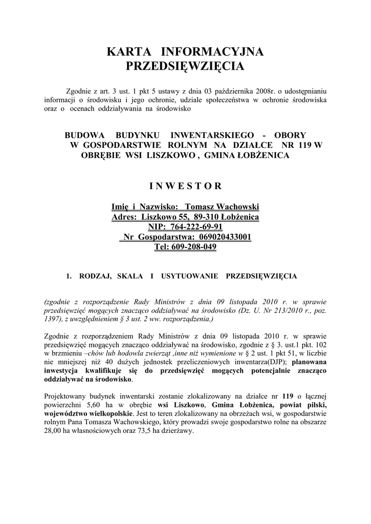 KARTA INFORMACYJNA PRZEDSIĘWZIĘCIA Zgodnie z art. 3 ust. 1 pkt 5 ustawy z dnia 03 października 2008r. o udostępnianiu informacji o środowisku i jego ochronie, udziale społeczeństwa w ochronie środowiska oraz o ocenach oddziaływania na środowisko BUDOWA BUDYNKU INWENTARSKIEGO - OBORY W GOSPODARSTWIE ROLNYM NA DZIAŁCE NR 119 W OBRĘBIE WSI LISZKOWO , GMINA ŁOBŻENICA INWESTOR Imię i Nazwisko: Tomasz Wachowski Adres: Liszkowo 55, 89-310 Łobżenica NIP: 764-222-69-91 Nr Gospodarstwa: 069020433001 Tel: 609-208-049 1. RODZAJ, SKALA I USYTUOWANIE PRZEDSIĘWZIĘCIA (zgodnie z rozporządzenie Rady Ministrów z dnia 09 listopada 2010 r. w sprawie przedsięwzięć mogących znacząco oddziaływać na środowisko (Dz. U. Nr 213/2010 r., poz. 1397), z uwzględnieniem § 3 ust. 2 ww. rozporządzenia.) Zgodnie z rozporządzeniem Rady Ministrów z dnia 09 listopada 2010 r. w sprawie przedsięwzięć mogących znacząco oddziaływać na środowisko, zgodnie z § 3. ust.1 pkt. 102 w brzmieniu –chów lub hodowla zwierząt ,inne niż wymienione w § 2 ust. 1 pkt 51, w liczbie nie mniejszej niż 40 dużych jednostek przeliczeniowych inwentarza(DJP); planowana inwestycja kwalifikuje się do przedsięwzięć mogących potencjalnie znacząco oddziaływać na środowisko. Projektowany budynek inwentarski zostanie zlokalizowany na działce nr 119 o łącznej powierzchni 5,60 ha w obrębie wsi Liszkowo, Gmina Łobżenica, powiat pilski, województwo wielkopolskie. Jest to teren zlokalizowany na obrzeżach wsi, w gospodarstwie rolnym Pana Tomasza Wachowskiego, który prowadzi swoje gospodarstwo rolne na obszarze 28,00 ha własnościowych oraz 73,5 ha dzierżawy. Przedsięwzięcie: Planowane przedsięwzięcie polegać będzie na budowie budynku inwentarskiego – obory ( oznaczonej na mapie literą A ) o wymiarach 50m x 14,6 m = 730,00 m2 magazynu paszowego o wymiarach 5m x 8m (oznaczony na mapie literą A1), silosu na kukurydzę 25m x 2,5m (oznaczony na mapie literą B) oraz płyty obornikowej (oznaczonej na mapie literą C) 14m x 20m oraz zamkniętych zbiorników na gnojówkę (oznaczony na mapie literą C1) na działce nr 119 w Liszkowie. Projektowany budynek będzie przeznaczony do chowu bydła opasowego na maksymalnie 70 stanowisk dla byków i cieląt, w systemie utrzymanie płytkiej ściółki; budynek dwuspadowy, wyposażony w wentylację grawitacyjną; ściany budynku ocieplane. Szkic projektu zał nr 1. Realizacja tego przedsięwzięcia odbywać się będzie zgodnie z wymaganymi obecnie standardami dobrostanu zwierząt i ochrony środowiska i tym samym przyczyni się do obniżenia jednostki pracy na wyprodukowanie jednego opasa. Na w /w działce nie występują obszary wodno-błotne, oraz inne obszary o płytkim zaleganiu wód podziemnych oraz obszarów objętych ochroną w tym stref ochronnych ujęć wody i obszarów ochronnych zbiorników wód śródlądowych, cieków i zbiorników wód powierzchniowych w tym stref ochronnych. Spływ wód opadowych następuje zgodnie ze spadkiem terenu, dla tego oceniając warunki gruntowo-wodne należy stwierdzić, że w granicach projektowanego przedsięwzięcia występują korzystne dla zabudowy warunki gruntowo -wodne. Obszar objęty opracowaniem położony jest na terenie wiejskim. Rolniczy krajobraz otoczenia inwestycji stanowią pola uprawne, oraz sąsiadujące zabudowy zagrodowe. Parcelę planowaną pod realizację inwestycji stanowi teren niezadrzewiony, zatem nie planuje się tam wycinki drzew i krzewów. Nie nastąpi również ingerencja w miejsca bytowania ptaków, nietoperzy, owadów czy grzybów podlegających ochronie. Fauna występująca na omawianym terenie związana jest głównie ze środowiskiem polnym oraz gatunkami towarzyszącymi osiedlom ludzkim. Są to m.in. pospolite gatunki ptaków, gryzonie, żaby. Teren ten nie jest objęty żadną formą ochrony przyrody. . 2. POWIERZCHNIA ZAJMOWANEJ NIERUCHOMOŚCI I OBIEKTÓW BUDOWLANYCH ORAZ DOTYCHCZASOWY SPOSÓB ICH WYKORZYSTANIA I POKRYCIA SZATĄ ROŚLINNĄ Na działce siedliskowej nr 119 o łącznej powierzchni 5,60 ha, występuje obecnie, należąca do Inwestora, zabudowa inwentarsko–gospodarcza oraz urządzenia infrastruktury rolniczej, w skład, w której wchodzą następujące obiekty ( Załącznik nr 1): D - Dom mieszkalny o wym. 14,55 m x 11,60 m =168,78 m2 E - Chlewnia F - Stodoła i chlewnia G - Chlewnia o wym. 20,05 m x 6,40 m = 128,32 m2 o wym. 36,73 m x 12,69 m = 466,10 m2 o wym. 8,76 m x 6,14 m = 53,78 m2 Łączna powierzchnia w/w nieruchomości, w obrębie, których będzie realizowane przedsięwzięcie wynosi 816,96m2. Natomiast planowany budynek chlewni wynosi 730,00 m2 A- Obora A1-Magazyn na paszę B- Silos na kiszonkę C- Płyta obornikowa C1- Zbiornik na gnojówkę 2. RODZAJ TECHNOLOGII Planowana inwestycja to obora dla byków i cieląt powyżej poł roku, które będą utrzymywane na uwięzi w systemie utrzymania płytkiej ściółki . Cielęta do poł roku będą utrzymywane luźno w jednym z obecnych budynków inwentarskich w gospodarstwie rolnym Inwestora. Rodzaj technologii dotyczącej prowadzenia hodowli bydła nie ulegnie zmianie będzie prowadzony tak jak dotychczas, zmianie ulegną jedynie warunki w jakich ta hodowla będzie prowadzona, czyli polepszy się dobrostan zwierząt. Planowana budowa ma na celu zwiększenie obsady dotychczas utrzymywanego stada do 70 sztuk bydła. . Rozbudowa gospodarstwa, polegająca na budowie budynku obory pozwoli na poprawę warunków dobrostanu zwierząt oraz ochronę środowiska. Dojazd do planowanej inwestycji będzie odbywał się przez posesję Inwestora. W chlewni planuje się 2 szerokie ganki technologiczne do sprawnego przemieszczania się zwierząt, wywozu obornika oraz 1 ganek w celu przejazdu ciągnika dowożącego paszę dla bydła. Bydło pojone będzie z poideł automatycznych. Budynek będzie wyposażony w system wentylacji grawitacyjnej, który będzie regulował temperaturę oraz wilgotność powietrza. Nawiew do