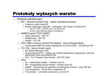 Protokoły wyższych warstw Protokoły pośredniczące: RPC – Remote Procedure Call – zdalne wywołanie procedury 4 bajtowe numery usług RPC Serwery lokalizujące usługi RPC – portmapper i RPC Lokator ( Windows NT) NetBIOS ponad TCP/IP (NetBT) Zwykle ponad NetBT lub czasem bezpośrednio na TCP/IP (CIFS) – TCP/UDP port 445 TLS i SSL ( Secure Socket Layer) Usługi nazewnicze – UDP 137 Datagramowe - UDP 138 Sesyjne – TCP 139 CIFS i SMB ( Common Internet File Systems , Server Message Block) Port TCP i UDP 111 dla RPC Suna i 135 dla RPC MS Serwery usług rejestrują usługę w portmapperze SSL produkt Netscape’a 1993 Do przenoszenia HTTP – wydajny przy krótkich bezstanowych połączeniach, może być podtrzymany przez serię połączeń http. SSL3 , TLS ( Transport Layer Security – IETF RFC 2246) IPsec AH – Authentication Header – Protokół numer 51 ESP – Encapsulating Security Payload – Protokół numer 50 ISAKMP – Internet Security Association Key Managment Protocol – przez UDP 500 Tryb transportowy – AH lub ESP za nagłówkiem IP Tryb tunelowy – cały pakiet umieszczony w nowym IP Bezpieczeństwo IPv4 i IPv6 IPSec Bezpieczne łączenie filii firmy przez Internet Bezpieczny zdalny dostęp przez Internet Łączność extranet (zewnętrzna) i intranet (wewnętrzna) Wzbogacone bezpieczeństwo działalności komercyjnej Obszar IPSec Nagłówek poświadczenia (AH) Kapsułkowanie zabezpieczonych danych (ESP) Wymiana kluczy RFC 2401,2402,2406,2408 Security Association (Bezpieczne Połączenie) Jednostronna relacja między nadawcą a odbiorcą Dla obustronnej, dwa połączenia (skojarzenia) są wymagane Trzy parametry identyfikacji SA Współczynnik bezpieczeństwa Docelowy adres IP Identyfikator protokołu bezpieczeństwa Parametry SA Licznik numerów sekwencyjnych Limit licznika Okna anty-odpowiedzi Informacja AH (nagłówek poświadczenia) Informacja ESP (Kapsułkowanie zabezpieczonych danych) Czas trwania SA Tryb protokołu IPSec Tunelowy, transportowy lub „wildcard” (mieszany) Ścieżka MTU Tryby transportu i tunelu Tryb transportu Ochrona dla protokołów wyższej warstwy Ogranicza się do pola danych w pakiecie IP End-to-end pomiędzy hostami Tryb tunelu Ochrona dla IP Cały pakiet traktowany jako dane do zewnętrznego pakietu Żaden ruter nie rozszyfrowuje pakietu Może mieć inne adresy źródłowe i docelowe Może być zaimplementowany w firewall’u Nagłówek Poświadczenia (AH) IPsec The IPsec authentication header in transport mode for IPv4. Kapsułkowanie zabezpieczonych danych ESP(Encapsulating Security Payload) Usługi wymagające poufności Pakiet ESP Zakres ESP Zarządzanie Kluczami Ręczne Automatyczne ISAKMP/Oakley ⌧Protokół Oakley do wyznaczania kluczy ⌧Internetowy protokół bezpiecznego połączenia i zarządzania kluczami (Internet security association and key management protocol) Bezpieczeństwo w stosie protokołów TCP/IP SSL ( Secure Socket Layer) SSL produkt Netscape’a 1993 Do przenoszenia HTTP – wydajny przy krótkich bezstanowych połączeniach, może być podtrzymany przez serię połączeń http. SSL3 , TLS ( Transport Layer Security – IETF RFC 2246) Grupa robocza TLS w ramach IETF Pierwsza wersja TLS rozpoznawana jako SSLv3.1Transport Layer Security Ten sam format rekordu jak w SSL Zdefiniowany w RFC 2246 Podobny do SSLv3. Różnice: ⌧ ⌧ ⌧ ⌧ ⌧ ⌧ ⌧ ⌧ ⌧ version number message authentication code pseudorandom function alert codes cipher suites client certificate types certificate_verify and finished message cryptographic computations padding SSL—The Secure Sockets Layer Warstwy (i protokoły) dla przeglądania WWW z SSL Architektura SSL SSL – przesył danych Transmisja danych z wykorzystaniem SSL. Operacje protokołu SSL Record Protocol Format protokołu SSL Record Content Type – typ danych 20 - Change CipherSpec, 21 – Alert Protocol, 22 –Handshake, 23 – Application Wersja SSLv3 – 3,0 TLSv1 – 3,1 SSL Record Protocol Payload Handshake Protocol Najbardziej skomplikowana i rozbudowana część SSL. Pozwala na autentykację serwera i klienta (opcjonalnie) względem siebie Negocjuje szyfrowawanie, algorytmy interalności (MAC), wymiana i ustalenie kluczy kryptograficznych Używany przed transmisją danych aplikacji SSL – protokół Handshake Uproszczona wersja nawiązania połączenia SSL. Składowe protokołu Handshake Client Hello Wersja protokołu ⌧ Jak w protokole Record Wartość losowa ⌧ 32 bajtowa wartość losowa • w tym 4 bajty czas ( w sekundach od Unixowej epoki –0:00,1.01.1970) ID sesji ⌧ Łańcuch do 32 bajtów – 0 dla nowej sesji • Wykorzystanie informacji z poprzedniej sesji Lista proponowanych algorytmów kryptograficznych ⌧ Od najbardziej preferowanych Lista proponowanych algorytmów kompresji Server Hello Składnia jak w Client Hello ⌧ Ale algorytmy wybrane przez z server z listy proponowanych ⌧ ID sesji może być ustawione, jeśli server dopuszcza wznawianie sesji Certificate Jedno pole – łańcuch certyfikatów – X.509 ( v3) Server Hello Done Komunikat bez pól – ale niezbędny Składowe protokołu Handshake ClientKeyExchange Do przekazania pre_master_secret ⌧ 48 bajtów ( w tym 2 wersja protokołu) Składnia ⌧ Rodzaj algorytmu ( RSA, DH) ⌧ Zakodowana wartość pre_master_secret ( dla RSA) • Kluczem publicznym servera ( z łańcucha certyfikatów) ⌧ Wartość publiczna algorytmu Diffie-Hellmana ( dla DH) Finished Pierwszy zaszyfrowany komunikat MD5 (16 bajtów) i SHA_hash (20) (dla SSLv3) wszystkich dotychczasowych komunikatów + wartość master_secret Dane potwierdzające dla TLSv1 ⌧ Też skróty MD5 i SHA-1 – konkatenowane i obcięte do 12 bajtów ChangeCipherSpec Komunikat protokołu CipherSpec Wysyłany przez Klienta i server ⌧ Po jego przesłaniu dane są szyfrowane kluczami wygenerowanymi w oparciu o master_secret i liczby losowe Handshake Protocol Action Protokół Alert Status błędu Jednobajtowe pole ⌧1 – o