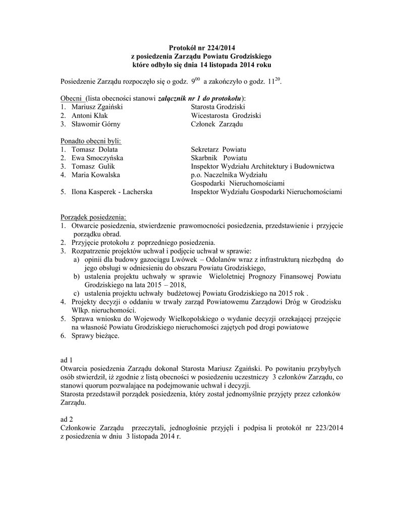 Protokół nr 224/2014 z posiedzenia Zarządu Powiatu Grodziskiego które odbyło się dnia 14 listopada 2014 roku Posiedzenie Zarządu rozpoczęło się o godz. 900 a zakończyło o godz. 1120. Obecni (lista obecności stanowi załącznik nr 1 do protokołu): 1. Mariusz Zgaiński Starosta Grodziski 2. Antoni Kłak Wicestarosta Grodziski 3. Sławomir Górny Członek Zarządu Ponadto obecni byli: 1. Tomasz Dolata 2. Ewa Smoczyńska 3. Tomasz Gulik 4. Maria Kowalska 5. Ilona Kasperek - Lacherska Sekretarz Powiatu Skarbnik Powiatu Inspektor Wydziału Architektury i Budownictwa p.o. Naczelnika Wydziału Gospodarki Nieruchomościami Inspektor Wydziału Gospodarki Nieruchomościami Porządek posiedzenia: 1. Otwarcie posiedzenia, stwierdzenie prawomocności posiedzenia, przedstawienie i przyjęcie porządku obrad. 2. Przyjęcie protokołu z poprzedniego posiedzenia. 3. Rozpatrzenie projektów uchwał i podjęcie uchwał w sprawie: a) opinii dla budowy gazociągu Lwówek – Odolanów wraz z infrastrukturą niezbędną do jego obsługi w odniesieniu do obszaru Powiatu Grodziskiego, b) ustalenia projektu uchwały w sprawie Wieloletniej Prognozy Finansowej Powiatu Grodziskiego na lata 2015 – 2018, c) ustalenia projektu uchwały budżetowej Powiatu Grodziskiego na 2015 rok . 4. Projekty decyzji o oddaniu w trwały zarząd Powiatowemu Zarządowi Dróg w Grodzisku Wlkp. nieruchomości. 5. Sprawa wniosku do Wojewody Wielkopolskiego o wydanie decyzji orzekającej przejęcie na własność Powiatu Grodziskiego nieruchomości zajętych pod drogi powiatowe 6. Sprawy bieżące. ad 1 Otwarcia posiedzenia Zarządu dokonał Starosta Mariusz Zgaiński. Po powitaniu przybyłych osób stwierdził, iż zgodnie z listą obecności w posiedzeniu uczestniczy 3 członków Zarządu, co stanowi quorum pozwalające na podejmowanie uchwał i decyzji. Starosta przedstawił porządek posiedzenia, który został jednomyślnie przyjęty przez członków Zarządu. ad 2 Członkowie Zarządu przeczytali, jednogłośnie przyjęli i podpisa li protokół nr 223/2014 z posiedzenia w dniu 3 listopada 2014 r. 2 Przy omawianiu punktu 3 lit. a, byli obecni: p.o. Naczelnika Wydziału Gospodarki Nieruchomościami (GN) Maria Kowalska oraz Inspektor Wydziału Architektury i Budownictwa (AB) Tomasz Gulik. ad 3 lit. a Inspektor Wydziału AB przedstawił projekt uchwały w sprawie opinii dla budowy gazociągu Lwówek – Odolanów wraz z infrastrukturą niezbędną do jego obsługi w odniesieniu do obszaru Powiatu Grodziskiego wraz z uzasadnieniem. Inspektor Wydziału AB poinformował, że pismem nr G429-ILFWs-AS-1081 z dnia 29 października 2014 roku ILF Consulting Engineers Polska Sp. z o.o. zwrócił się z prośbą o wyrażenie opinii w sprawie przebiegu projektowanego gazociągu wysokiego ciśnienia DN 1000 relacji Lwówek – Odolanów wraz z infrastrukturą niezbędną do jego obsługi w odniesieniu do obszaru Powiatu Grodziskiego . Zgodnie z art. 6 ust. 3 pkt 11 ustawy z dnia 24 kwietnia 2009r. o inwestycjach w zakresie terminalu regazyfikacyjnego skroplonego gazu ziemnego w Świnoujściu przed złożeniem wniosku o wydanie decyzji o ustaleniu lokalizacji inwestycji w zakresie terminalu inwestor występuje o opinie właściwego miejscowo zarządu powiatu. W projekcie uchwały proponuje się opinię pozytywną o przebiegu projektowanego gazociągu wysokiego ciśnienia DN 1000 relacji Lwówek – Odolanów wraz z infrastrukturą niezbędną do jego obsługi w odniesieniu do obszaru Powiatu Grodziskiego. Wskazuje się, że projekt budowlany inwestycji winien posiadać opinie, uzgodnienia, pozwolenia or az inne dokumenty wymagane przepisami szczególnymi. Ponadto projekt winien spełniać warunki ochrony interesów osób trzecich. W/w wynikają z ustawy z dnia 07 lipca 1994r. – Prawo budowlane (Dz. U. z 2013r., poz. 1409 ze zmianami) Starosta poprosił p.o. Naczelnika Wydziału GN o informację na temat opinii wydanej już w tej sprawie przez Starostę. P.o. Naczelnika Wydziału GN poinformowała, że Starosta wydał opinię w odniesieniu do gruntów wykorzystywanych na cele rolne i leśne oraz zagro żonych osuwaniem się mas ziemnych. P.o. Naczelnika Wydziału GN poinformowała, że o pinia Zarządu i opinia wydana przez Starostę są wymagane na podstawie art. 6 ust. 3 ww. ustawy . Są to dwie niezależne od siebie opinie. Więcej uwag nie było, wobec czego Starosta z arządził głosowanie. Zarząd w obecności 3 członków podjął jednogłośnie uchwałę nr 5 68/2014 w sprawie opinii dla budowy gazociągu Lwówek – Odolanów wraz z infrastrukturą niezbędną do jego obsługi w odniesieniu do obszaru Powiatu Grodziskiego , która wraz z uzasadnieniem stanowi załącznik nr 2 do protokołu. Uchwała została przekazana Wydziałowi Architektury i Budownictwa . ad 3 lit. b Skarbnik Powiatu odczytała projekt uchwały Zarządu w sprawie ustalenia projektu uchwały w sprawie Wieloletniej Prognozy Finansowej Powiatu Grodziskiego na lata 201 5-2018. 3 Następnie Skarbnik Powiatu przedstawiła projekt uchwały Rady Powiatu w sprawie uchwalenia Wieloletniej Prognozy Finansowej Powiatu Grodziskiego na lata 201 5 - 2018. Załącznikami do projektu uc hwały są: - Wieloletnia Prognoza Finansowa Powiatu Grodziskiego na lata 201 5-2018, - wykaz przedsięwzięć doWPF. Do projektu uchwały Rady Powiatu dołączono również objaśnienia do Wieloletniej Prognozy Finansowej. Pytań i uwag nie było, wobec czego Starosta zarządził głosowanie. Zarząd w obecności 3 członków podjął jednogłośnie uchwałę nr 569/2014 w sprawie ustalenia projektu uchwały w sprawie Wieloletniej Prognozy Finansowej Powiatu Grodziskiego na lata 2015-2018, która wraz z projektem uchwały Rad y Powiatu w sprawie Wieloletniej Prognozy Finansowej, stanowi załącznik nr 3 do protokołu. Projekt uchwały w sprawie Wieloletniej Prognozy Finansowej Powiatu przekazuje się wraz z projektem uchwały budżetowej regionalnej izbie obrachunkowej – celem zaopinio