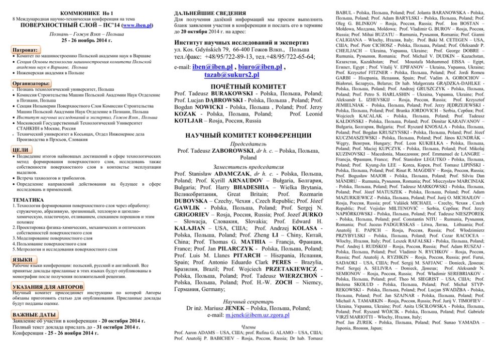 КОММЮНИКЕ Но 1 8 Международная научно-техническая конференция на тема ПОВЕРХНОСТНЫЙ СЛОЙ – ПС’14 (www.iben.pl) Познань – Гожув Влкп – Польша 25 - 26 ноябрь 2014 г. Патронат: Комитет по машиностроению Польской академии наук в Варшаве Секция Основы технологии машиностроения комитета Польской академии наук в Варшаве, Польша Инженерская академия в Польше Организаторы: Познань технологический университет, Польша Комиссия Строительства Машин Польской Акадэмии Наук Отделение в Познани, Польша Секция Инзынерии Поверхностного Слоя Комиссии Строительства Машин Польской Акадэмии Наук Отделение в Познани, Польша Институт научных исследований и экспертиз, Гожов Влкп., Польша Московский Государственный Технологический Университет СТАНКИН в Москве, Россия Технический университет в Косьицах, Отдел Инженерное дела Производства в Прэсьов, Словакия ЦЕЛИ Подведение итогов найновшых достишений в сфере технологических метод формирования поверхностного слоя, исследовань также собственности поверхностного слоя в контекстье эксплуатации выделков. Встреча тахнологов и трибологов. Определение направлений действования на будущее в сфере исследовань и применений. ТЕМАТИКА 1. Технология формирования поверхностного слоя через обработку: стружечную, абразивную, эрозионный, тепловую и циэплнохимическую, пластичную, отливанием, спеканием порошков и этим похожее 2. Проектировка физика-химических, механических и оптических собственностей поверхностного слоя 3. Моделирование поверхностного слоя 4. Пользование поверхностного слоя 5. Метрология и исследования поверхностного слоя ЯЗЫКИ Рабочие языки конференции: польский, русский и английский. Все принятые доклады присланные в этих языках будут опубликованы в монографии после получения положительной рецензии. УКАЗАНИЯ ДЛЯ АВТОРОВ Научный комитет присоединяет инструкцию по которой Авторы обязаны приготовить статью для опубликования. Присланные доклады будут подданы оценке. ВАЖНЫЕ ДАТЫ Заявление об участии в конференции - 20 октября 2014 г. Полный текст доклада прислать до - 31 октября 2014 г. Конференция - 25 - 26 ноября 2014 г. ДАЛЬНЕЙШИЕ СВЕДЕНИЯ Для получения далёкий информаций мы просим выполнить бланк заявления участия в конференции и послать его в термине до 20 октября 2014 г. на адрес: Институт научных исследований и экспертиз ул. Kos. Gdyńskich 79, 66-400 Гожoв Влкп., Польша тел./факс: +48/95/722-89-13, тел.+48/95/722-65-64; e-mail: [email protected] , [email protected] , [email protected] ПОЧЁТНЫЙ КОМИТЕТ Prof. Tadeusz BURAKOWSKI - Polska, Польша, Poland; Prof. Lucjan DĄBROWSKI - Polska, Польша , Poland; Prof. Bogdan NOWICKI - Polska, Польша , Poland; Prof. Jerzy KOZAK - Polska, Польша, Poland; Prof. Leonid KOTLJAR – Rosja, Россия, Russia НАУЧНЫЙ КОМИТЕТ КОНФЕРЕНЦИИ Председатель Prof. Tadeusz ZABOROWSKI, dr h. c. – Polska, Польша, Poland Заместитель председателя Prof. Stanisław ADAMCZAK, dr h. c. - Polska, Польша, Poland; Prof. Kyrill ARNAUDOV – Bułgaria, Болгария, Bulgaria; Prof. Harry BHADESHIA – Wielka Brytania, Великобритания, Great Britain; Prof. Rozmarin DUBOVSKA – Czechy, Чехия , Czech Republic; Prof. Józef GAWLIK - Polska, Польша, Poland; Prof. Sergej N. GRIGORIEV – Rosja, Россия, Russia; Prof. Jozef JURKO – Słowacja, Словакия, Slovakia; Prof. Edward H. KALAJIAN – USA, США; Prof. Andrzej KOLASA Polska, Польша, Poland; Prof. Zheng LI – Chiny, Китай, China; Prof. Thomas G. MATHIA – Francja, Франция, France; Prof. Jan PILARCZYK - Polska, Польша, Poland; Prof. Luis M. Llanes PITARCH – Hiszpania, Испания, Spain; Prof. Antonio Eduardo Clark PERES – Brazylia, Бразилия, Brazil; Prof. Wojciech PRZETAKIEWICZ Polska, Польша, Poland; Prof. Tadeusz WIERZCHOŃ Polska, Польша, Poland; Prof. H.-W. ZOCH – Niemcy, Германия, Germany; Научный секретарь Dr inż. Mariusz JENEK – Polska, Польша, Poland; e-mail: [email prote