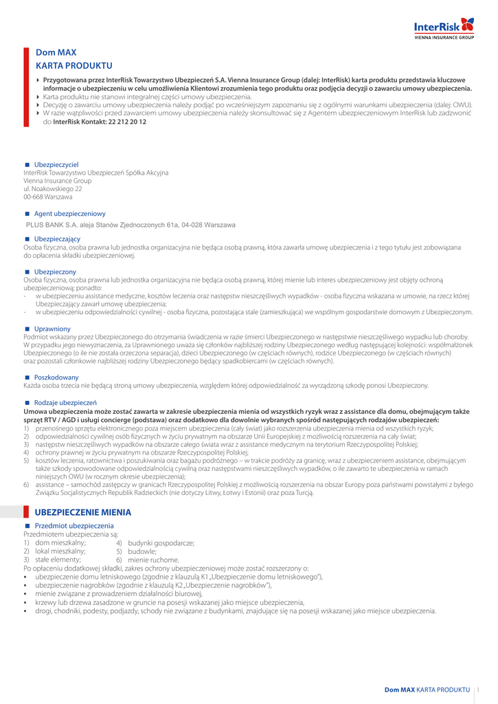 Dom MAX KARTA PRODUKTU Przygotowana przez InterRisk Towarzystwo Ubezpieczeń S.A. Vienna Insurance Group (dalej: InterRisk) karta produktu przedstawia kluczowe } informacje o ubezpieczeniu w celu umożliwienia Klientowi zrozumienia tego produktu oraz podjęcia decyzji o zawarciu umowy ubezpieczenia. } Karta produktu nie stanowi integralnej części umowy ubezpieczenia. } Decyzję o zawarciu umowy ubezpieczenia należy podjąć po wcześniejszym zapoznaniu się z ogólnymi warunkami ubezpieczenia (dalej: OWU). } W razie wątpliwości przed zawarciem umowy ubezpieczenia należy skonsultować się z Agentem ubezpieczeniowym InterRisk lub zadzwonić do InterRisk Kontakt: 22 212 20 12 < Ubezpieczyciel InterRisk Towarzystwo Ubezpieczeń Spółka Akcyjna Vienna Insurance Group ul. Noakowskiego 22 00-668 Warszawa < Agent ubezpieczeniowy PLUS BANK S.A. aleja Stanów Zjednoczonych 61a, 04-028 Warszawa < Ubezpieczający Osoba fizyczna, osoba prawna lub jednostka organizacyjna nie będąca osobą prawną, która zawarła umowę ubezpieczenia i z tego tytułu jest zobowiązana do opłacenia składki ubezpieczeniowej. < Ubezpieczony Osoba fizyczna, osoba prawna lub jednostka organizacyjna nie będąca osobą prawną, której mienie lub interes ubezpieczeniowy jest objęty ochroną ubezpieczeniową; ponadto: - w ubezpieczeniu assistance medyczne, kosztów leczenia oraz następstw nieszczęśliwych wypadków - osoba fizyczna wskazana w umowie, na rzecz której Ubezpieczający zawarł umowę ubezpieczenia; - w ubezpieczeniu odpowiedzialności cywilnej - osoba fizyczna, pozostająca stale (zamieszkująca) we wspólnym gospodarstwie domowym z Ubezpieczonym. < Uprawniony Podmiot wskazany przez Ubezpieczonego do otrzymania świadczenia w razie śmierci Ubezpieczonego w następstwie nieszczęśliwego wypadku lub choroby. W przypadku jego niewyznaczenia, za Uprawnionego uważa się członków najbliższej rodziny Ubezpieczonego według następującej kolejności: współmałżonek Ubezpieczonego (o ile nie została orzeczona separacja), dzieci Ubezpieczonego (w częściach równych), rodzice Ubezpieczonego (w częściach równych) oraz pozostali członkowie najbliższej rodziny Ubezpieczonego będący spadkobiercami (w częściach równych). < Poszkodowany Każda osoba trzecia nie będącą stroną umowy ubezpieczenia, względem której odpowiedzialność za wyrządzoną szkodę ponosi Ubezpieczony. < Rodzaje ubezpieczeń Umowa ubezpieczenia może zostać zawarta w zakresie ubezpieczenia mienia od wszystkich ryzyk wraz z assistance dla domu, obejmującym także sprzęt RTV / AGD i usługi concierge (podstawa) oraz dodatkowo dla dowolnie wybranych spośród następujących rodzajów ubezpieczeń: 1) przenośnego sprzętu elektronicznego poza miejscem ubezpieczenia (cały świat) jako rozszerzenia ubezpieczenia mienia od wszystkich ryzyk; 2) odpowiedzialności cywilnej osób fizycznych w życiu prywatnym na obszarze Unii Europejskiej z możliwością rozszerzenia na cały świat; 3) następstw nieszczęśliwych wypadków na obszarze całego świata wraz z assistance medycznym na terytorium Rzeczypospolitej Polskiej; 4) ochrony prawnej w życiu prywatnym na obszarze Rzeczypospolitej Polskiej; 5) kosztów leczenia, ratownictwa i poszukiwania oraz bagażu podróżnego – w trakcie podróży za granicę, wraz z ubezpieczeniem assistance, obejmującym także szkody spowodowane odpowiedzialnością cywilną oraz następstwami nieszczęśliwych wypadków, o ile zawarto te ubezpieczenia w ramach niniejszych OWU (w rocznym okresie ubezpieczenia); 6) assistance – samochód zastępczy w granicach Rzeczypospolitej Polskiej z możliwością rozszerzenia na obszar Europy poza państwami powstałymi z byłego Związku Socjalistycznych Republik Radzieckich (nie dotyczy Litwy, Łotwy i Estonii) oraz poza Turcją. UBEZPIECZENIE MIENIA < Przedmiot ubezpieczenia Przedmiotem ubezpieczenia są: 1) dom mieszkalny; 4) budynki gospodarcze; 2) lokal mieszkalny; 5) budowle; 3) stałe elementy; 6) mienie ruchome. Po opłaceniu dodatkowej składki, zakres ochrony ubezpieczeniowej może zostać rozszerzony o: § ubezpieczenie domu letniskowego (zgodnie z klauzulą K1 „Ubezpieczenie domu letniskowego”), § ubezpieczenie nagrobków (zgodnie z klauzulą K2 „Ubezpieczenie nagrobków”), § mienie związane z prowadzeniem działalności biurowej, § krzewy lub drzewa zasadzone w gruncie na posesji wskazanej jako miejsce ubezpieczenia, § drogi, chodniki, podesty, podjazdy, schody nie związane z budynkami, znajdujące się na posesji wskazanej jako miejsce ubezpieczenia. Dom MAX KARTA PRODUKTU 1 < Zakres ubezpieczenia Ochroną ubezpieczeniową objęte są następujące zdarzenia: 1) Wskazane w umowie i znajdujące się w miejscu ubezpieczenia mienie, objęte jest ochroną ubezpieczeniową od wszelkich nagłych i nieprzewidzianych zdarzeń powstałych niezależnie od woli Ubezpieczającego lub Ubezpieczonego, za wyjątkiem wypadków wyłączonych w OWU oraz postanowieniach dodatkowych uzgodnionych przez strony (np. aneksach lub klauzulach), z zastrzeżeniem pkt. 2. 2) W odniesieniu do mienia: a) rybki akwariowe, konie, psy i koty (ubezpieczanych w ramach sumy ubezpieczenia mienia ruchomego); b) krzewy lub drzewa zasadzone w gruncie na posesji wskazanej jako miejsce ubezpieczenia; c) drogi, chodniki, podesty, schody znajdujące się na posesji wskazanej jako miejsce ubezpieczenia; ochrona ubezpieczeniowa ograniczona jest wyłącznie do następujących wypadków ubezpieczeniowych: deszcz nawalny, grad, huragan, katastrofa budowlana, kradzież z włamaniem do pomieszczenia (wyłącznie w odniesieniu do lit. a powyżej), lawina, opad atmosferyczny, powódź, pożar, przewrócenie się drzew lub zawalenie budowli, rabunek, trzęsienie ziemi, uderzenie pioruna, upadek statku powietrznego, wybuch. Ponadto ubezpieczenie obejmuje również – w granicach sum ubezpieczenia z zastrzeżeniem limitów, o których mowa w § 15 i 18 OWU: 1) szkody w p