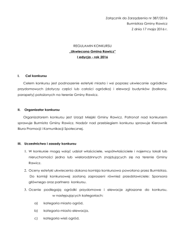 Załącznik do Zarządzenia nr 387/2016 Burmistrza Gminy Rawicz Z dnia 17 maja 2016 r. REGULAMIN KONKURSU „Ukwiecona Gmina Rawicz” I edycja - rok 2016 I. Cel konkursu Celem konkursu jest podnoszenie estetyki miasta i wsi poprzez ukwiecanie ogródków przydomowych (dotyczy części lub całości ogródka) i elewacji budynków (balkony, parapety) położonych na terenie Gminy Rawicz. II. Organizator konkursu Organizatorem konkursu jest Urząd Miejski Gminy Rawicz. Patronat nad konkursem sprawuje Burmistrz Gminy Rawicz. Nadzór nad przebiegiem konkursu sprawuje Kierownik Biura Promocji i Komunikacji Społecznej. III. Uczestnictwo i zasady konkursu 1. W konkursie mogą wziąć udział właściciele, współwłaściciele i najemcy lokali lub nieruchomości jedno lub wielorodzinnych znajdujących się na terenie Gminy Rawicz. 2. Oceny estetyki ukwiecenia dokona komisja konkursowa powołana przez Burmistrza. Do komisji konkursowej zostaną zaproszeni również przedstawiciele: Sponsora głównego oraz partnera konkursu. 3. Ocenie podlegają ogródki przydomowe i elewacje zgłoszone do konkursu, w następujących kategoriach: a) kategoria miasto ogród, b) kategoria miasto elewacja, c) kategoria wieś ogród, d) kategoria wieś elewacja. 4. Dokumentację konkursową stanowić będą zdjęcia wykonane przez organizatora podczas wizytacji zgłoszonych obiektów. 5. O terminie wizytacji uczestnicy zostaną powiadomieni pisemnie. 6. Komisja dokona oceny w skali od 0 do 10 punktów. Przedmiotem oceny będzie głównie: a) kompozycja roślinna i nowatorskie aranżacje, a także inne elementy dekoracyjne w przypadku elewacji budynku zgłoszonej do konkursu, b) kompozycja i ład przestrzenny w nasadach, estetyka ogródka oraz zastosowanie innych elementów dekoracyjnych, w przypadku ogródka przydomowego zgłoszonego do konkursu. 7. Warunkiem uczestnictwa w konkursie jest wypełnienie karty zgłoszenia zawierającej: • imię i nazwisko, • adres posesji, • numer telefonu, adres e-mail • zdjęcie lub zdjęcia zgłoszonej kompozycji, • zgodę na sfotografowanie posesji (w tym upowszechnianie zdjęć) i podanie wyników konkursu do publicznej wiadomości. 8. Zgłoszenia do konkursu można dokonać tylko w jednej, wybranej kategorii. 9. Wzór karty zgłoszeniowej stanowi załącznik do regulaminu i jest dostępny na stronie www.rawicz.pl w zakładce „Ukwiecona Gmina Rawicz” oraz w Biurze Obsługi Klienta Urzędu Miejskiego Gminy Rawicz, ul. Piłsudskiego 21. 10.Zgłoszenia do osobiście konkursu można składać na kartach zgłoszeniowych w Urzędzie Miejskim Gminy Rawicz w Biurze Obsługi Klienta, wysłać pocztą na adres Urząd Miejski Gminy Rawicz, ul. Piłsudskiego 21, 63-900 Rawicz lub na adres e-mail: [email protected] w terminie do 14 lipca 2016 r. 11.Komisja konkursowa dokona wizji zgłoszonych obiektów w terminie od 18 do 22 lipca 2016 r. 12.Spośród zgłoszeń konkursowych komisja wyłoni 3 najładniej ukwiecone elewacje budynków ukwiecone z podziałem na kategorie: miasto i wieś oraz 3 najładniej i zagospodarowane przydomowe ogródki z podziałem na kategorie: miasto i wieś, które zostaną nagrodzone. Pozostali uczestnicy konkursu otrzymają dyplomy za uczestnictwo. 13.Wszyscy uczestnicy tegorocznej edycji zostaną pisemnie zawiadomieni o wynikach konkursu oraz terminie i miejscu wręczenia nagród. 14.Z konkursu wyłączeni są pracownicy Urzędu Miejskiego Gminy Rawicz, Radni Gminy Rawicz, Przewodniczący Rad Osiedlowych oraz Sołtysi Gminy Rawicz. 15.Informacji w sprawie konkursu udzielają pracownicy Urzędu: Anna Hamrol tel. 65 546 76 69 oraz Urszula Duda tel. 65 546 54 26. IV. Nagrody Nagrody zostaną ufundowane przez sponsorów, w szczególności firmy handlowo usługowe działające na terenie objętym konkursem. V. Postanowienia końcowe 1. Komisja kończy swoją pracę po ogłoszeniu wyników konkursu. 2. W kolejnych edycjach nagrody za miejsca I-III w kategorii: miasto i wieś mogą być przyznane temu samemu nagrodzonemu raz na dwa lata. WSZYSTKIM UCZESTNIKOM KONKURSU ŻYCZYMY WIELU WRAŻEŃ I SATYSFAKCJI Z PODJĘTYCH DZIAŁAŃ NA RZECZ UPIĘKSZANIA NASZEGO OTOCZENIA. Burmistrz Gminy Rawicz KARTA ZGŁOSZENIA udziału w konkursie „Ukwiecona Gmina Rawicz” I edycja - rok 2016 Imię i nazwisko: ........................................................................................................................... Adres do korespondencji: ............................................................................................................ Adres budynku / ogródka zgłaszanego do konkursu: ...................................................................................................................................................... Nr telefonu: .................................................................................................................................. Adres e-mail: ……………………………………………… Zgłaszam do konkursu (odpowiednie zaznaczyć): MIASTO* Elewację budynku* Przydomowy ogródek * WIEŚ* Przydomowy ogródek* Elewację budynku * Oświadczam, że: • • zapoznałem/am się z regulaminem konkursu wyrażam zgodę na sfotografowanie wizerunku zgłoszonej do konkursu fasady budynku lub przydomowego ogródka oraz zamieszczenie fotografii wraz z danymi osobowymi do publicznej wiadomości do celów promocyjnych organizatora ......................................................... Data i podpis zgłaszającego Wyrażam zgodę na przetwarzanie przez organizatora moich danych osobowych w rozumieniu ustawy o ochronie danych osobowych (tj. Dz. U. z 2014 r. poz. 1182; ze zm.). ......................................................... Data i podpis zgłaszającego * NIEPOTRZEBNE SKREŚLIĆ Warunkiem udziału w konkursie jest złożenie karty zgłoszenia w Urzędzie Miejskim Gminy Rawicz do dnia 14 lipca 2016 r.