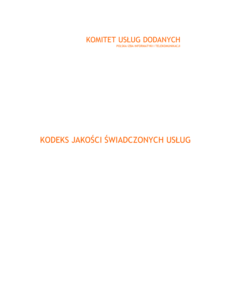 KOMITET USŁUG DODANYCH POLSKA IZBA INFORMATYKI I TELEKOMUNIKACJI KODEKS JAKOŚCI ŚWIADCZONYCH USŁUG SPIS TREŚCI 1. INFORMACJE O KUD ............................................................................................................. 4 1.1. KUD ............................................................................................................................. 4 1.2. CEL .............................................................................................................................. 4 1.3. MISJA .......................................................................................................................... 4 1.6. KOMPETENCJE .......................................................................................................... 4 1.5. SANKCJE .................................................................................................................... 5 1.6. FINANSOWANIE ......................................................................................................... 5 1.7. ZASIĘG TERYTORIALNY............................................................................................ 5 2. Wstęp ...................................................................................................................................... 6 2.1. Definicje ....................................................................................................................... 6 3. Postanowienia ogólne – dostawcy usług dodanych ................................................................. 8 3.1. Obowiązki .................................................................................................................... 8 3.2. Jakość techniczna ........................................................................................................ 8 3.3. Czytelna definicja usługi o podwyższonej płatności ...................................................... 8 3.4. Informacje o cenach ..................................................................................................... 8 3.5. Dane kontaktowe ......................................................................................................... 8 3.6. Reklamacje i skargi ...................................................................................................... 8 3.7. Dobre obyczaje ............................................................................................................ 8 3.8. Ochrona danych osobowych ........................................................................................ 9 3.9. Zgodność z obowiązującym ustawodawstwem ............................................................ 9 4. Postanowienia szczególne – usługi premium SMS/MMS ....................................................... 10 4.1. Reklamowanie usług na bazie Premium MO i Premium MT ....................................... 10 4.2. Informacja o cenie ...................................................................................................... 10 4.3. Aktywacja oraz rezygnacja z usługi ............................................................................ 10 4.4. Legalność udostępnianych materiałów ....................................................................... 10 4.5. Kompatybilność telefonów komórkowych ................................................................... 11 4.6. Dostępność usługi ...................................................................................................... 11 4.7. Akcje charytatywne i dobroczynne ............................................................................ 11 4.8. Masowa wysyłka wiadomości w formie reklamy ......................................................... 11 4.9. Serwisy rozrywkowe o charakterze erotycznym ......................................................... 11 5. Postanowienia szczególne – usługi Premium voice ............................................................... 12 5.1. Reklamowanie usług na bazie Pay Per Call i Pay Per Minute .................................... 12 5.2. Materiały promocyjne ................................................................................................. 12 5.3. Informacja o cenie ...................................................................................................... 12 5.4. Usługi rozrywkowe na żywo o charakterze erotycznym .............................................. 13 5.5. Usługi linii towarzyskiej .............................................................................................. 13 5.6. Udzielanie porad telefonicznych ................................................................................. 13 5.7. Konkursy i inne gry z nagrodami ................................................................................ 13 6. Postanowienia szczególne – usługi dialerowe ....................................................................... 14 6.1. Reklamowanie usług na bazie dialera ........................................................................ 14 6.2. Informacja o cenie ...................................................................................................... 14 6.3. Funkcje dialera........................................................................................................... 14 6.4. Instalowanie dialera ................................................................................................... 15 6.5. Odinstalowanie dialera ............................................................................................... 15 6.6. Korzystanie z programu dialerowego ......................................................................... 15 6.7. Dokonywanie zmian w dialerze .................................................................................. 15 7. Postanowienia szczególne - kategorie usług Premium .......................................................... 16 7.1. 7.2. 7.3. Usługi dla dzieci ..