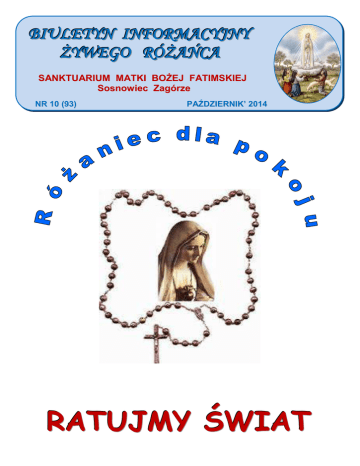 BIULETYN INFORMACYJNY ŻYWEGO RÓŻAŃCA SANKTUARIUM MATKI BOŻEJ FATIMSKIEJ Sosnowiec Zagórze NR 10 (93) PAŹDZIERNIK’ 2014 RATUJMY ŚWIAT WEZWANIE DO MODLITWY O POKÓJ Kiedy piszę te słowa, świat jest w stanie wojny. W krajach Bliskiego Wschodu, na Ukrainie i w wielu zakątkach ziemi toczą się walki i giną nie tylko żołnierze, ale również cywile – kobiety i dzieci. Papież Franciszek zapytany przez dziennikarzy, czy wspólna modlitwa o pokój z patriarchą Konstantynopola, prezydentem Izraela i prezydentem Palestyny miała sens w obliczu toczącej się nadal wojny, odpowiedział, że „została otwarta brama modlitwy”. Przypomniał też, że „pokój jest darem, darem, na który zasługujemy naszą pracą”, i dodał, że obok „drogi dialogu, który jest ważny, istnieje również droga modlitwy”. Siostry i Bracia Żywego Różańca! Zwracam się do Was z apelem o dar modlitwy w intencji pokoju na świecie. Kiedy dziś pokój jest wciąż zagrożony, proszę, aby wszyscy członkowie Żywego Różańca w Polsce przez cały październik do wyznaczonej tajemnicy różańcowej dołączyli każdego dnia jeden dziesiątek różańca – tajemnicę ukoronowania Matki Bożej na Królową nieba i ziemi – i ofiarowali swoją modlitwę w intencji pokoju. Tyle razy w historii świata modlitwa różańcowa ratowała od wojny i przynosiła pokój. Matka Boża w Fatimie bardzo konkretnie prosi: „Odmawiajcie codziennie różaniec, aby wyprosić pokój dla świata”, a św. Jan Paweł II w Liście o różańcu zaznacza, że „odmawiając (…) różaniec, nie można nie czuć się wyraźnie zobowiązanym do służby sprawie pokoju” (nr 6). Rozumiejąc powagę sytuacji, bierzemy „ufnie do rąk koronkę różańca” – jak zachęcał Papież Polak – i błagamy Jezusa, Księcia Pokoju, o ten upragniony dar dla świata, uciekając się pod płaszcz matczynej opieki Królowej Pokoju. ks. Szymon Mucha Krajowy Moderator Żywego Różańca P PA AP PIIE ES SK KIIE E IIN NT TE EN NC CJ JE E A APPO OS ST TO OLLS ST TW WA A M MO OD DLLIIT TW WY Y OGÓLNA Aby Pan dał pokój najbardziej udręczonym przez wojnę i przemoc regionom świata. „Pokój wam” (J 20, 21) – to pierwsze słowa Chrystusa Zmartwychwstałego skierowane do Apostołów. On pragnie obdarzać nas pokojem, którego świat dać nam nie może. Nie wolno nam się przyzwyczajać do tego, że wciąż gdzieś na świecie toczą się bratobójcze wojny. Nie wolno nam się godzić na przemoc, zabijanie niewinnych. Człowiek może się normalnie rozwijać, żyć i pracować tylko w warunkach pokoju. Błagajmy więc o tak wielki dar pokoju dla regionów świata udręczonych przez wojnę i przemoc. ks. Szymon Mucha - „Różaniec” nr 10/2014 MISYJNA Aby Światowy Dzień Misyjny rozbudził w każdym wierzącym pasję i gorliwość, by nieść Ewangelię całemu światu. Kościół z natury jest misyjny. Chrystus nie tylko Apostołów, ale każdego, kto w Niego uwierzy, wzywa, by nieść Ewangelię całemu światu. Okazją do tego, aby przypomnieć sobie to zadanie, jest przeżywany co roku w październiku Tydzień Misyjny i Światowy Dzień Misyjny. Niech organizowane z tej okazji katechezy i czuwania modlitewne pomogą rozbudzić na nowo w każdym z nas pasję i gorliwość, aby zanieść Ewangelię tym, którzy o niej jeszcze nie słyszeli, albo tym, którzy jeszcze nie poznali Jezusa i nie przyjęli Jego nauczania. Módlmy się o to szczególnie podczas nabożeństw różańcowych. ks. Szymon Mucha - „Różaniec” nr 10/2014 IIN NT TE EN NC CJ JA A K KR RU UC CJ JA AT TY Y R RÓ ÓŻ ŻA AŃ ŃC CO OW WE EJ J zzaa O OJ JC CZ ZY YZ ZN NĘ Ę Z Maryją Królową Polski módlmy się o Polskę wierną Bogu, Krzyżowi i Ewangelii, o wypełnienie Jasnogórskich Ślubów Narodu. IIN NT TE EN NCCJ JE E PPA AR RA AFFIIA ALLN NE E Módlmy się: o Boże wspomożenie, dary Ducha Świętego oraz zdrowie i siły dla Ojca Świętego Franciszka; o Światło Ducha Świętego dla Biskupów oraz pomyślny przebieg III Nadzwyczajnego Zgromadzenia Ogólnego Synodu Biskupów; o pokój na świecie; o nowe i święte powołania kapłańskie, zakonne i misyjne, zwłaszcza z naszej parafii; dziękując Panu Bogu za dar powołania zakonnego z naszej parafii, prośmy o Światło Ducha Świętego i umocnienie w powołaniu dla Patrycji, która rozpoczęła postulat u Sióstr Albertynek w Krakowie; o rozwój Żywego Różańca w Polsce i na świecie, a zwłaszcza w naszej parafii; o nowych członków do Róż Różańcowych, a zwłaszcza do Róży św. Moniki; dziękczynnie za dzieło Żywego Różańca w Polsce oraz o potrzebne łaski i dary Ducha Świętego dla ks. Szymona Muchy, krajowego moderatora Żywego Różańca, a także o Boże błogosławieństwo, potrzebne łaski i opiekę Matki Najświętszej dla Sióstr Loretanek; o Boże błogosławieństwo, dary Ducha Świętego i potrzebne łaski oraz opiekę Matki Bożej Fatimskiej dla ks. kan. Stanisława Łypa, parafialnego moderatora Żywego Różańca, z podziękowaniem za duszpasterską troskę o naszą wspólnotę; o rychłą beatyfikację sługi Bożej Pauliny Marii Jaricot; o Bożą pomoc w zgromadzeniu odpowiednich środków materialnych na zakup nowych organów do naszego Sanktuarium; o Boże błogosławieństwo, opiekę Matki Bożej Fatimskiej, potrzebne łaski a w sposób szczególny o łagodny przebieg i skuteczne zadziałanie chemioterapii w chorobie nowotworowej dla Marii Kieraś; o Boże błogosławieństwo, opiekę Matki Bożej Fatimskiej oraz pomyślny przebieg radioterapii w leczeniu choroby nowotworowej dla Danuty Płonka; o Boże błogosławieństwo, opiekę Matki Bożej Fatimskiej, a w sposób szczególny o łaskę szybkiego powrotu do zdrowia dla Ewy; o Boże błogosławieństwo, opiekę Matki Bożej Fatimskiej oraz pomyślne leczenie i szybki powrót do zdrowia po wypadku dla Heleny Wysockiej; o łaskę zdrowia i pomyślny przebieg leczenia tętniaka dla Adama; o B