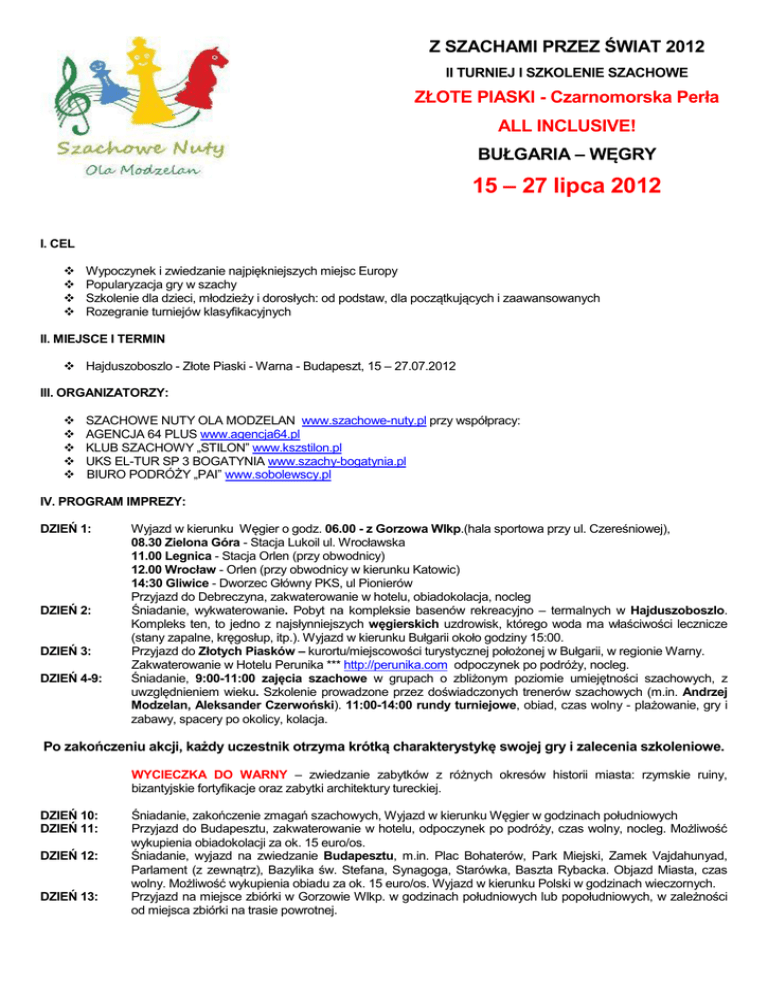 Z SZACHAMI PRZEZ ŚWIAT 2012 II TURNIEJ I SZKOLENIE SZACHOWE ZŁOTE PIASKI - Czarnomorska Perła ALL INCLUSIVE! BUŁGARIA – WĘGRY 15 – 27 lipca 2012 I. CEL Wypoczynek i zwiedzanie najpiękniejszych miejsc Europy Popularyzacja gry w szachy Szkolenie dla dzieci, młodzieży i dorosłych: od podstaw, dla początkujących i zaawansowanych Rozegranie turniejów klasyfikacyjnych II. MIEJSCE I TERMIN Hajduszoboszlo - Złote Piaski - Warna - Budapeszt, 15 – 27.07.2012 III. ORGANIZATORZY: SZACHOWE NUTY OLA MODZELAN www.szachowe-nuty.pl przy współpracy: AGENCJA 64 PLUS www.agencja64.pl KLUB SZACHOWY „STILON” www.kszstilon.pl UKS EL-TUR SP 3 BOGATYNIA www.szachy-bogatynia.pl BIURO PODRÓŻY „PAI” www.sobolewscy.pl IV. PROGRAM IMPREZY: DZIEŃ 1: DZIEŃ 2: DZIEŃ 3: DZIEŃ 4-9: Wyjazd w kierunku Węgier o godz. 06.00 - z Gorzowa Wlkp.(hala sportowa przy ul. Czereśniowej), 08.30 Zielona Góra - Stacja Lukoil ul. Wrocławska 11.00 Legnica - Stacja Orlen (przy obwodnicy) 12.00 Wrocław - Orlen (przy obwodnicy w kierunku Katowic) 14:30 Gliwice - Dworzec Główny PKS, ul Pionierów Przyjazd do Debreczyna, zakwaterowanie w hotelu, obiadokolacja, nocleg Śniadanie, wykwaterowanie. Pobyt na kompleksie basenów rekreacyjno – termalnych w Hajduszoboszlo. Kompleks ten, to jedno z najsłynniejszych węgierskich uzdrowisk, którego woda ma właściwości lecznicze (stany zapalne, kręgosłup, itp.). Wyjazd w kierunku Bułgarii około godziny 15:00. Przyjazd do Złotych Piasków – kurortu/miejscowości turystycznej położonej w Bułgarii, w regionie Warny. Zakwaterowanie w Hotelu Perunika *** http://perunika.com odpoczynek po podróży, nocleg. Śniadanie, 9:00-11:00 zajęcia szachowe w grupach o zbliżonym poziomie umiejętności szachowych, z uwzględnieniem wieku. Szkolenie prowadzone przez doświadczonych trenerów szachowych (m.in. Andrzej Modzelan, Aleksander Czerwoński). 11:00-14:00 rundy turniejowe, obiad, czas wolny - plażowanie, gry i zabawy, spacery po okolicy, kolacja. Po zakończeniu akcji, każdy uczestnik otrzyma krótką charakterystykę swojej gry i zalecenia szkoleniowe. WYCIECZKA DO WARNY – zwiedzanie zabytków z różnych okresów historii miasta: rzymskie ruiny, bizantyjskie fortyfikacje oraz zabytki architektury tureckiej. DZIEŃ 10: DZIEŃ 11: DZIEŃ 12: DZIEŃ 13: Śniadanie, zakończenie zmagań szachowych, Wyjazd w kierunku Węgier w godzinach południowych Przyjazd do Budapesztu, zakwaterowanie w hotelu, odpoczynek po podróży, czas wolny, nocleg. Możliwość wykupienia obiadokolacji za ok. 15 euro/os. Śniadanie, wyjazd na zwiedzanie Budapesztu, m.in. Plac Bohaterów, Park Miejski, Zamek Vajdahunyad, Parlament (z zewnątrz), Bazylika św. Stefana, Synagoga, Starówka, Baszta Rybacka. Objazd Miasta, czas wolny. Możliwość wykupienia obiadu za ok. 15 euro/os. Wyjazd w kierunku Polski w godzinach wieczornych. Przyjazd na miejsce zbiórki w Gorzowie Wlkp. w godzinach południowych lub popołudniowych, w zależności od miejsca zbiórki na trasie powrotnej. V. NAGRODY W TURNIEJACH: Puchary, dyplomy (dla wszystkich) i nagrody rzeczowe VI. FINANSOWANIE Koszt imprezy wynosi 2.099 zł. + 50 zł. (ubezpieczenie KL i NNW). Całą kwotę należy wpłacić do dnia 15.06.2012. Koszt imprezy obejmuje: przejazd autokarem klasy LUX, wyposażonym w klimatyzację, barek, TV, WC, 7 noclegów w Hotelu Perunika *** http://perunika.com w Złotych Piaskach, pokoje 2/3 osobowe, wyposażone w klimatyzację, telewizję satelitarną, telefon, lodówkę, łazienkę z prysznicem, balkon. sport i rekreacja: basen zewnętrzny - leżaki i parasole przy basenie bezpłatne, tenis stołowy, plac zabaw dla dzieci. wyżywienie podczas pobytu w Złotych Piaskach - All Inclusive: 07.30 – 10.00: śniadanie bufetowe – restauracja główna. 11.00 – 12.00: lody i napoje bezalkoholowe. 12.00 – 14.00: lunch w formie bufetu w restauracji głównej, potrawy bułgarskie oraz międzynarodowe. 15.00 – 17.00: snack bar: kanapki, ciastka, kawa. 18.00 – 20.30: obiadokolacja w formie bufetu w restauracji głównej, potrawy bułgarskie oraz międzynarodowe W godzinach 10.30 - 22.30 napoje: Coca – Cola, Fanta, Sprite, woda mineralna, woda gazowana, soki lokalne, piwo lokalne, drinki alkoholowe; bilet wstępu na baseny termalne w Hajduszoboszlo na Węgrzech, wycieczkę do Warny, zwiedzanie Budapesztu, 1 nocleg w hotelu w Debreczynie + obiadokolacja i śniadanie 1 nocleg w hotelu w Budapeszcie + śniadanie opiekę pilota/przewodnika, podatek VAT, szkolenie szachowe dla dzieci i chętnych dorosłych, wpisowe do turnieju Do dyspozycji gości: restauracja główna, lobby-bar, sejf, kantor wymiany walut, sauna, masaże, konsultacje medyczne (za opłatą). Koszt imprezy nie obejmuje: biletów wstępu do obiektów turystycznych, ubezpieczenie KL i NNW – 50 zł./os.(w przypadku zachorowań przewlekłych należy ubezpieczyć się dodatkowo), wydatków własnych, świadczeń nie wymienionych w komunikacie imprezy. VII. TERMIN ZGŁOSZEŃ Termin zgłoszeń – do wyczerpania miejsc Zgłoszenia należy nadsyłać e-mailem: Aleksandra Modzelan: [email protected] tel. kom. 666-303-869, tel./fax 95 7370003 Zaliczkę w kwocie 300 zł. należy wpłacić do dnia 31.05.2012 na konto: nr 50 1020 5558 1111 1814 1740 0038 - Szachowe Nuty Ola Modzelan, ul. Grabskiego 13/7, 66-400 Gorzów Wlkp. Organizator zastrzega sobie prawo do ostatecznej interpretacji i ewentualnych zmian w komunikacie Hotelu Perunika *** http://perunika.com/