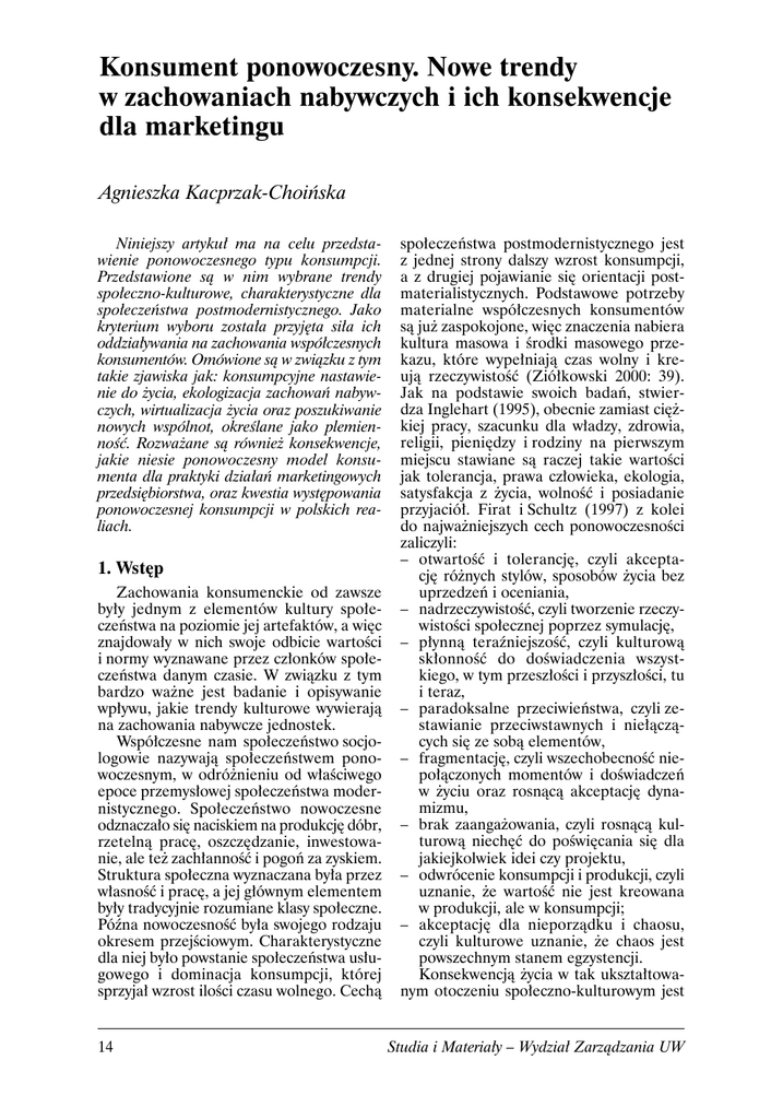 Konsument ponowoczesny. Nowe trendy w zachowaniach nabywczych i ich konsekwencje dla marketingu Agnieszka Kacprzak-Choiñska Niniejszy artykuï ma na celu przedstawienie ponowoczesnego typu konsumpcji. Przedstawione sÈ w nim wybrane trendy spoïeczno-kulturowe, charakterystyczne dla spoïeczeñstwa postmodernistycznego. Jako kryterium wyboru zostaïa przyjÚta siïa ich oddziaïywania na zachowania wspóïczesnych konsumentów. Omówione sÈ w zwiÈzku z tym takie zjawiska jak: konsumpcyjne nastawienie do ĝycia, ekologizacja zachowañ nabywczych, wirtualizacja ĝycia oraz poszukiwanie nowych wspólnot, okreĂlane jako plemiennoĂÊ. Rozwaĝane sÈ równieĝ konsekwencje, jakie niesie ponowoczesny model konsumenta dla praktyki dziaïañ marketingowych przedsiÚbiorstwa, oraz kwestia wystÚpowania ponowoczesnej konsumpcji w polskich realiach. 1. WstÚp Zachowania konsumenckie od zawsze byïy jednym z elementów kultury spoïeczeñstwa na poziomie jej artefaktów, a wiÚc znajdowaïy w nich swoje odbicie wartoĂci i normy wyznawane przez czïonków spoïeczeñstwa danym czasie. W zwiÈzku z tym bardzo waĝne jest badanie i opisywanie wpïywu, jakie trendy kulturowe wywierajÈ na zachowania nabywcze jednostek. Wspóïczesne nam spoïeczeñstwo socjologowie nazywajÈ spoïeczeñstwem ponowoczesnym, w odróĝnieniu od wïaĂciwego epoce przemysïowej spoïeczeñstwa modernistycznego. Spoïeczeñstwo nowoczesne odznaczaïo siÚ naciskiem na produkcjÚ dóbr, rzetelnÈ pracÚ, oszczÚdzanie, inwestowanie, ale teĝ zachïannoĂÊ i pogoñ za zyskiem. Struktura spoïeczna wyznaczana byïa przez wïasnoĂÊ i pracÚ, a jej gïównym elementem byïy tradycyjnie rozumiane klasy spoïeczne. Póěna nowoczesnoĂÊ byïa swojego rodzaju okresem przejĂciowym. Charakterystyczne dla niej byïo powstanie spoïeczeñstwa usïugowego i dominacja konsumpcji, której sprzyjaï wzrost iloĂci czasu wolnego. CechÈ 14 spoïeczeñstwa postmodernistycznego jest z jednej strony dalszy wzrost konsumpcji, a z drugiej pojawianie siÚ orientacji postmaterialistycznych. Podstawowe potrzeby materialne wspóïczesnych konsumentów sÈ juĝ zaspokojone, wiÚc znaczenia nabiera kultura masowa i Ărodki masowego przekazu, które wypeïniajÈ czas wolny i kreujÈ rzeczywistoĂÊ (Zióïkowski 2000: 39). Jak na podstawie swoich badañ, stwierdza Inglehart (1995), obecnie zamiast ciÚĝkiej pracy, szacunku dla wïadzy, zdrowia, religii, pieniÚdzy i rodziny na pierwszym miejscu stawiane sÈ raczej takie wartoĂci jak tolerancja, prawa czïowieka, ekologia, satysfakcja z ĝycia, wolnoĂÊ i posiadanie przyjacióï. Firat i Schultz (1997) z kolei do najwaĝniejszych cech ponowoczesnoĂci zaliczyli: – otwartoĂÊ i tolerancjÚ, czyli akceptacjÚ róĝnych stylów, sposobów ĝycia bez uprzedzeñ i oceniania, – nadrzeczywistoĂÊ, czyli tworzenie rzeczywistoĂci spoïecznej poprzez symulacjÚ, – pïynnÈ teraěniejszoĂÊ, czyli kulturowÈ skïonnoĂÊ do doĂwiadczenia wszystkiego, w tym przeszïoĂci i przyszïoĂci, tu i teraz, – paradoksalne przeciwieñstwa, czyli zestawianie przeciwstawnych i nieïÈczÈcych siÚ ze sobÈ elementów, – fragmentacjÚ, czyli wszechobecnoĂÊ niepoïÈczonych momentów i doĂwiadczeñ w ĝyciu oraz rosnÈcÈ akceptacjÚ dynamizmu, – brak zaangaĝowania, czyli rosnÈcÈ kulturowÈ niechÚÊ do poĂwiÚcania siÚ dla jakiejkolwiek idei czy projektu, – odwrócenie konsumpcji i produkcji, czyli uznanie, ĝe wartoĂÊ nie jest kreowana w produkcji, ale w konsumpcji; – akceptacjÚ dla nieporzÈdku i chaosu, czyli kulturowe uznanie, ĝe chaos jest powszechnym stanem egzystencji. KonsekwencjÈ ĝycia w tak uksztaïtowanym otoczeniu spoïeczno-kulturowym jest Studia i Materiaïy – Wydziaï ZarzÈdzania UW pojawienie siÚ tak zwanego konsumenta ponowoczesnego. 2. Cechy konsumenta ponowoczesnego Konsument ponowoczesny najczÚĂciej bywa okreĂlany jako osoba, dla której kupowane przedmioty nie stanowiÈ jedynie zaspokojenia potrzeb, ale przede wszystkim sÈ demonstracjÈ przekonañ, postaw i stylu ĝycia. Ponadto konsument taki jest Ăwietnie poinformowany, przez co decyzje o zakupie podejmuje nie tylko przez pryzmat wïasnych korzyĂci, ale teĝ skutki uboczne spoĝywanych dóbr. Doceniana jest takĝe przez niego waga zwiÈzków miÚdzy czïowiekiem a naturÈ, czego efektem jest popieranie dziaïañ na rzecz ochrony Ărodowiska oraz dÈĝenie do nabywania i konsumowania produktów ekologicznych. Ponowoczesny konsument posiada takĝe wyraěnÈ potrzebÚ wiÚzi spoïecznej, majÈcej jednak inny charakter niĝ w tradycyjnych wspólnotach, gdyĝ znajduje ona swój wyraz w mniejszych gronach, zaspokajajÈcych potrzebÚ odnalezienia siÚ otoczeniu. W zwiÈzku z tym, docenia on produkty i usïugi, które majÈ wartoĂÊ ïÈczenia ludzi i uïatwiajÈ interakcje spoïeczne. PïaszczyznÈ, na której dochodzi do odnawiania wiÚzi spoïecznych, jest Ăwiat wirtualny, dostÚpny poprzez Internet, którego wpïywu na zachowania konsumenckie nie sposób pominÈÊ. PodsumowujÈc, moĝna wymieniÊ nastÚpujÈce, najwaĝniejsze trendy spoïeczno-kulturowe, które wpïywajÈ na zachowanie ponowoczesnych konsumentów: – z jednej strony nasilajÈcy siÚ konsumpcjonizm, bÚdÈcy spadkiem epoki nowoczesnej, a z drugiej coraz wyraěniejszy trend ekologizacji konsumpcji, – wirtualizacja ĝycia, której konsekwencjÈ jest domocentryzm, – odwrócenie od indywidualizmu w stronÚ tworzenia nowych wspólnot (plemiennoĂÊ). 2.1. Konsumpcjonizm Samuel Strauss ukuï w 1924 r. pojÚcie konsumpcjonizmu. Polega on na rosnÈcym zaangaĝowaniu w produkcjÚ i konsumpcjÚ rzeczy, któremu podporzÈdkowuje siÚ wszystkie inne wartoĂci. OczywiĂcie kaĝdy czïonek spoïeczeñstwa dysponuje innÈ iloĂciÈ Ărodków, ale fakt, iĝ wszyscy tkwiÈ w kulturze konsumowania, powoduje, ĝe 2/2007 ludzie sÈ skïonni wydawaÊ na dobra konsumpcyjne wiÚkszoĂÊ dostÚpnych Ărodków (Ritzer 2001: 72). Konsumpcjonizm moĝna ró