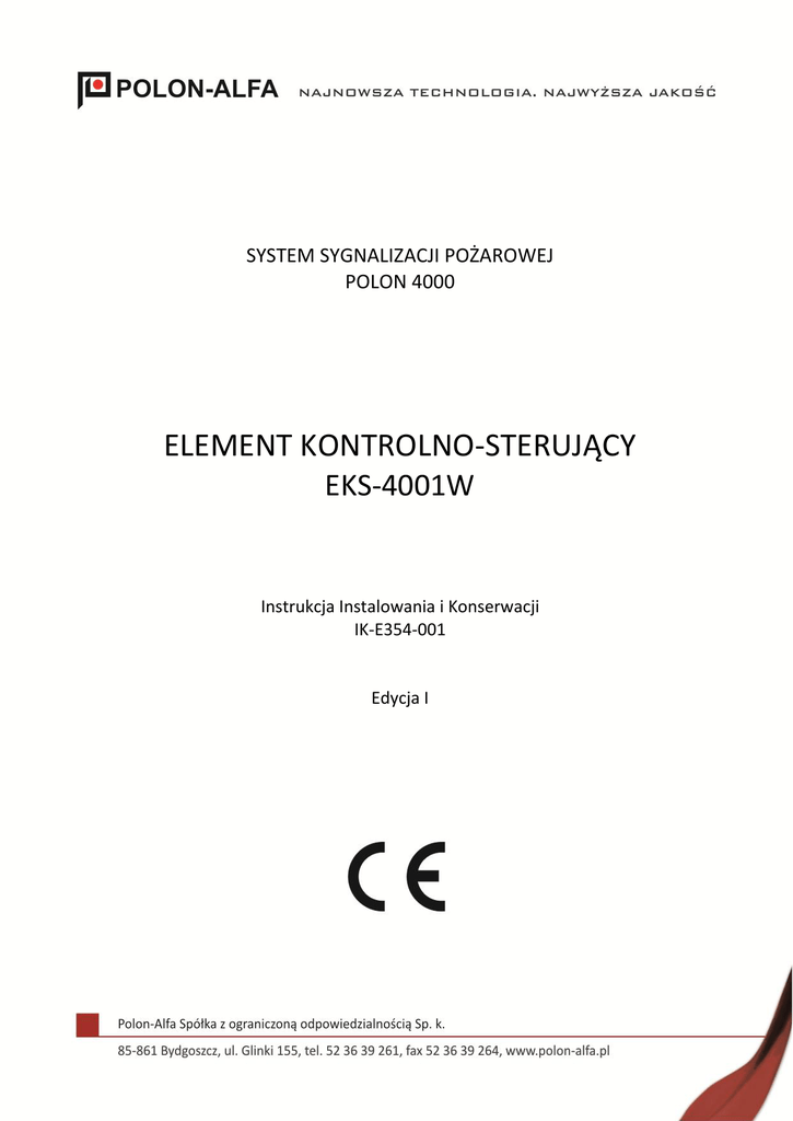 IK-E354-001 SYSTEM SYGNALIZACJI POŻAROWEJ POLON 4000 ELEMENT KONTROLNO-STERUJĄCY EKS-4001W Instrukcja Instalowania i Konserwacji IK-E354-001 Edycja I 1 2 IK-E354-001 Element kontrolno-sterujący EKS-4001W, będący przedmiotem niniejszej instrukcji spełnia zasadnicze wymagania następujących rozporządzeń Parlamentu Europejskiego i Rady (UE) oraz dyrektyw Unii Europejskiej: CPR LVD EMC CPR/305/2011 Rozporządzenie Parlamentu Europejskiego i Rady (UE) z dnia 9 marca 2011r. ustanawiające zharmonizowane warunki wprowadzania do obrotu wyrobów budowlanych i uchylające dyrektywę Rady 89/106/EWG; Dyrektywa 2006/95/WE dotycząca wyposażenia elektrycznego, przewidzianego do stosowania w pewnych granicach napięcia; Dyrektywa (UE) 2004/108/WE dotycząca kompatybilności elektromagnetycznej. Na element kontrolno-sterujący EKS-4001W została wydana Deklaracja Właściwości Użytkowych Nr 1/E354/2013/PL. Na element kontrolno-sterujący EKS-4001W wydany został przez CNBOP-PIB w Józefowie, jednostkę notyfikowaną nr 1438 w UE, Certyfikat Stałości Właściwości Użytkowych nr xxxx/CPR/xxxx, potwierdzający zgodność urządzeń z wymaganiami norm: PN-EN 54-18:2007, PN-EN 54-17:2007. Certyfikat oraz Deklarację Właściwości Użytkowych można pobrać ze strony internetowej www.polon-alfa.pl Przed przystąpieniem do montażu i eksploatacji należy zapoznać się z treścią niniejszej instrukcji. Nieprzestrzeganie zaleceń zawartych w tej instrukcji może okazać się niebezpieczne lub spowodować naruszenie obowiązujących przepisów. Producent Polon-Alfa nie ponosi odpowiedzialności za szkody powstałe w wyniku użytkowania niezgodnego z niniejszą instrukcją. Wyeksploatowany wyrób, nie nadający się do dalszego użytkowania, należy przekazać do jednego z punktów, zajmujących się zbiórką zużytego sprzętu elektrycznego i elektronicznego. Uwaga - Zastrzega się prawo do wprowadzania zmian IK-E354-001 3 13 Polon-Alfa Spółka z ograniczoną odpowiedzialnością Sp.k. 85-861 Bydgoszcz, ul. Glinki 155 1438 1438/CPR/xxxx Element kontrolno-sterujący EKS-4001W EN 54-18, EN 54-17 Deklaracja właściwości użytkowych Nr 1/E354/2013/PL Za sad n i cz e ch a rakt e ry st y ki wyr ob u Wła śc i wo śc i u żytko w e Zh ar mon izo w an a sp ecy f ika cja te ch n i czn a E N 54 - 18 : 20 05 Rozd z iał Sp ełn ia 5. 2 Op óźn i en i e r e akc ji Wła ś ci wo ś ci i od p orn o ś ć n a z m ian y p ara m et ró w z a sil an i a Dzi ał an i e ( sku t e czn oś ć ) w wa ru n ka ch p oża ro wyc h Bad an ia f u n kc jon a ln e Sp ełn ia 5. 1.4 Tr wał o ść n i eza w od n o ś ci d ział a n ia i o p óźn ie n i e r eak cj i: od p o rn o ść n a d zi ałan i e ci ep ła Od p o rn o ś ć n a su c h e go rąc o Sp ełn ia 5. 3 Od p o rn o ś ć n a zi mn o Sp ełn ia 5. 4 Tr wał o ść n i eza w od n o ś ci d ziała n ia : o d p orn o ść n a w ib ra cj e Od p o rn o ś ć n a u d ary p o jed y n cz e Sp ełn ia 5. 8 Od p o rn o ś ć n a u d e rz en i e Sp ełn ia 5. 9 Od p o rn o ś ć n a w ib r acj e Sp ełn ia 5. 10 Wyt rzy mał o ś ć n a w ib r a cj e Sp ełn ia 5. 11 Tr wał o ść n i eza w od n o ś ci d ziała n ia : o d p orn o ść n a w il goć Od p o rn o ś ć n a w il gotn e gor ąc o cy kli czn e Sp ełn ia 5. 5 Wyt rzy mał o ś ć n a w il go tn e go rąc o stał e Sp ełn ia 5. 6 Tr wał o ść n i eza w od n o ś ci d ziała n ia : o d p orn o ść n a koro zj ę Wyt rzy mał o ś ć n a kor oz ję sp ow od o wan ą d ział an i e m d wu tl en ku si ark i ( S O 2 ) Sp ełn ia 5. 7 4 IK-E354-001 Za sad n i cz e ch a rakt e ry st y ki wyr ob u Wła śc i wo śc i u żytko w e Zh ar mon izo w an a sp ecy f ika cja te ch n i czn a E N 54 - 18 : 20 05 Rozd z iał Tr wał o ść n i eza w od n o ś ci d ziała n ia : st ab i ln o ś ć e l ekt ryc zn a Wła ś ci wo ś ci i od p orn o ś ć n a z m ian y p ara m et ró w z a sil an i a Sp ełn ia Od p o rn o ś ć n a zakł ó c en ia el ekt ro ma gn ety czn e Sp ełn ia Wła śc i wo śc i u żytko w e Za sad n i cz e ch a rakt e ry st y ki wyr ob u 5. 2 5. 12 Zharmonizowana specyfikacja techniczna E N 54 - 17 : 20 05 Rozd z iał Sku t e czn o ś ć w wa ru n ka c h p oża ro wyc h Od t war zal n o ść Sp ełn ia 5. 2 Sp ełn ia 4 N ie za wod n o ść ek sp loa ta cji Wym ag an ia Tr wał o ść n i eza w od n o ś ci d ziała n ia : o d p orn o ść n a d ziała n i e ci ep ła Od p or n o ść n a su ch e g or ąco Sp ełn ia 5. 4 Od p or n o ść n a z i mn o Sp ełn ia 5. 5 Tr wał o ść n i eza w od n o ś ci d ziała n ia : o d p orn o ść n a w ib ra cj e Od p or n o ść n a u d ary p oj ed y n cz e Sp ełn ia 5. 9 Od p or n o ść n a u d er z en i e Sp ełn ia 5. 10 Od p or n o ść n a wi b ra cj e si n u soid aln e Sp ełn ia 5. 11 Wytrzy m ało ść n a wi b ra c je s in u so id al n e Sp ełn ia 5. 12 Tr wał o ść n i eza w od n o ś ci d zia ła n ia : o d p orn o ść n a w il goć Od p or n o ść n a wi lg otn e gorą co cy k li czn e Sp ełn ia 5. 6 Wytrzy m ało ść n a wi l got n e gor ąco stał e Sp ełn ia 5. 7 Tr wał o ść n i eza w od n o ś ci d ziała n ia : o d p orn o ść n a koro zj ę Wytrzy m ało ść n a k oro zj ę sp o wo d o wan ą d zi ałan i e m ( S O 2 ) Sp ełn ia 5. 8 Tr wał o ść n i eza w od n o ś ci d ziała n ia : st ab i ln o ś ć e l ekt ryc zn a Zm ian y n ap i ę cia za si lan i a Ko mp at yb i ln o ść od p orn o śc i el ekt r oma gn ety czn a (E M C), b ad an ie Sp ełn ia 5. 3 Sp ełn ia 5. 13 Zamierzone zastosowanie: Bezpieczeństwo pożarowe – element do sterowania urządzeń zabezpieczających, przeciwpożaro wych i ich kontroli Dane techniczne - patrz instrukcja: IK-E354-001 IK-E354-001 5 Spis treści 1. 2. 3. 4. 5. 6. 7. 8. 8.1. 8.2. 8.3. 9. 9.1. 9.2. Przeznaczenie ...................................................................................................................... 6 Dane techniczne ................................