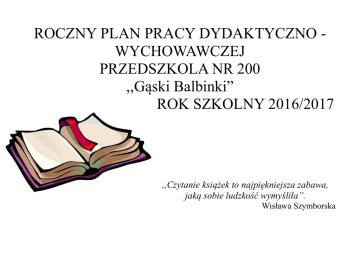 ROCZNY PLAN PRACY DYDAKTYCZNO WYCHOWAWCZEJ PRZEDSZKOLA NR 200 ,,Gąski Balbinki” ROK SZKOLNY 2016/2017 ,,Czytanie książek to najpiękniejsza zabawa, jaką sobie ludzkość wymyśliła”. Wisława Szymborska Plan pracy został opracowany na podstawie Koncepcji Pracy Przedszkola uwzględniając zagadnienia wynikające z Podstawy Programowej, wnioski sformułowane przez Radę Pedagogiczną, a także diagnozę potrzeb i zainteresowań dzieci. Cel priotytetowy: Rozbudzanie u dzieci zainteresowania książką jako źródłem wiedzy, wartości i przyjemności. Cele szczegółowe: - kształtowanie nawyków czytelniczych, -uwrażliwianie na piękno literatury, wprowadzenie dziecka w świat literatury, -przekazanie dzieciom podstawowych widomości dotyczących powstawania książki ,,Od autora do czytelnika”, - wdrażanie do dbałości o czysty i estetyczny wygląd książek, -budowanie świata wartości poprzez obcowanie z bohaterami literackimi, -rozwijanie poprawnej wymowy oraz swobodnego wypowiadanie się przez dzieci, -zapoznanie dzieci z zasadami korzystania z biblioteki, -rozwijanie wyobraźni i pomysłowości, angażowanie różnych sfer aktywności dla zrozumienia tekstu, Oczekiwane efekty i rezultaty – standardy osiągnięć Dzieci: - rozwijają pamięć, wyobraźnię i wrażliwość, - wzbogacają swoje słownictwo, - doskonalą umiejętność uważnego słuchania, -wyrabiają nawyk dbania o książki i wykorzystania ich we właściwy sposób, - doskonalą myślenie i koncentrację uwagi, - rozwijają percepcję słuchową i wzrokową -wiedzą, ze każdy musi nauczyć się czytać i że książka jest źródłem wiedzy, Kryteria sukcesu – wskaźniki standardów Dzieci: - słuchają opowiadań, bajek, baśni, wierszy związanych z omawianą tematyką, -odgrywają role teatralne, scenki rodzajowe, dramy rozwijające osobowość dziecka, przygotowujące do życia, pełnienia określonych ról i zadań -uczestniczą w konkursach, -uczestniczą w zajęciach plastycznych i muzycznych związanych z poznaną literaturą, rozwijających koordynację wzrokowo-ruchową, - uczą się wierszy i rymowanek i krótkich tekstów, - biorą udział w grach i zabawach z elementami dramy, PRACA DYDAKTYCZNO – WYCHOWAWCZA Z WYCHOWANKAMI L.P ZADANIA SZCZEGÓŁOWE OSOBA TERMIN ODPOWIEDZIALNA REALIZACJI Ustalenie, przypomninie, aktualizacja zasad Wszystkie nauczycielki kozystania z książek. Umieszczenie regulaminu w kąciku. Czytanie dzieciom utworów literackich, baśni, Wszystkie nauczycielki bajek, opowiadań o różnych porach dnia. Zapoznanie z różnymi gatunkami literackimi Wszystkie nauczycielki ( bajka, baśń, legenda, opowiadanie). Wrzesień Konkurs wewnętrzny w grupie Maki ,,Moja wakacyjna książka”. Rozwijanie wyobraźni i fantazji przy tworzeniu samodzielnych opowiadań. Ania Grązka Wrzesień Wszystkie nauczycielki Cały rok 6. Zapoznanie dzieci z polskimi autorami książek: J.Tuwim, W.Chotomska…. Wszystkie nauczycielki Miesiąc o autorze. 7. ,,Jak powstaje książka” - zapoznanie z etapami powstawania książki. Wszystkie nauczycielki W zależności od zapisu w planie 1. 2. 3. 4. 5. Cały rok Cały rok miesięcznym. 8. Cykliczny udział dzieci w słuchaniu utworów literackich czytanych przez rodziców i inne zaproszone osoby z cyklu „CAŁA POLSKA CZYTA DZIECIOM” Wszystkie nauczycielki Cały rok 9. Zorganizowanie konkursu pt. ,,Ktoś” – konkurs plastyczny z udziałem rodziców ( pomysł na książkę z własnym tekstem i ilustracjami) Agnieszka Gajewska luty 10. Pomaganie dzieciom w osiąganiu gotowości do nauki czytania i pisania na podstawie literatury dziecięcej: - ćwiczenia percepcji wzrokowej -ćwiczenie percepcji słuchowej -ćwiczenia sprawności manualnej i graficznej -gry i zabawy sprzyjające dojrzałości operacyjnej Wszystkie nauczycielki Cały rok 11. ,,Projekt plecaczkowy” - wędrujący plecak z książkami. ( plecak dla każdej grupy). Wszystkie nauczycielki Od poździernika 12. ,,Bajkowy bal karnawałowy” - przebranie dzieci za postacie z bajek ( rodzice). Styczeń 13. Przygotowanie dla rodziców uroczystości z okazji ich święta w formie inscenizacji wybranej bajki. Wszystkie nauczycielki Maj 14. ,,Smacznie, zdrowo, kolorowo” - wspólne tworzenie z dziećmi przepisów na zdrowe potrawy. Zebranie wszystkich do jednej książki. Dzień Pluszowego Misia Wszystkie nauczycielki Cały rok zbieranie przepisów, dokumentowanie. Listopad 15. 16. 17. Obchody Międzynarodowego Dnia Książki w przedszkolu – oglądanie filmu jak powst.książka? - prezentacja multimedialna. ,Spotkania z teatrem”-umożliwienie dzieciom udziału w profesjonalnych i amatorskich przedstawieniach teatralnych związanych z dziecięcą literaturą. Wszystkie nauczycielki Kwiecień Cały rok DOSKONALENIE WARSZTATU NAUCZYCIELA L.P. ZADANIA SZCZEGÓŁOWE OSOBA TERMIN ODPOWIEDZIALNA REALIZACJI 1. Wzajemna pomoc i współpraca koleżeńska-wymiana doświadczeń, pomocy dydaktycznych, literatury fachowej i scenariuszy zajęć. Wszystkie nauczycielki Cały rok 2. Poszukiwanie nowych, ciekawych metod i form pracy z dziećmi, przybliżających im literaturę oraz umożliwiających rozwijanie zainteresowań czytaniem i pisaniem (czasopisma, Internet, literatura metodyczna Wzbogacanie ,,kącika książki” i dbanie o jego estetykę i funkcjonalnść Współpraca z biblioteką, wypożyczanie książek, udział w zajęciach - ustalenie tematyki i terminów. Bal karnawałowy ,,W świecie baśni” - wspólne tworzenie dekoracji. Wszystkie nauczycielki Cały rok Wszystkie nauczycielki Cały rok 3. 4. 5. Cały rok Wszystkie nauczycielki Styczeń 6. 7. 8. 9. Udział w konkursach, przeglądach teatralnych i literackich ( promowanie osiągnięć przedszkolaków). Współpraca z rodzicami ( teatr, czytanie dzieciom). Propagowanie akcji ,,wędrujący plecak z książkami”. Doskonalenie warsztatu pracy poprzez udział w doskonaleniu zawodowym. Cały rok Wszystkie nauczycielki Cały rok W