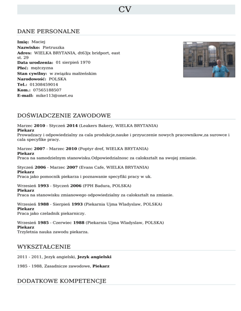 CV DANE PERSONALNE Imię: Maciej Nazwisko: Pietruszka Adres: WIELKA BRYTANIA, dt63jx bridport, east st. 29 Data urodzenia: 01 sierpień 1970 Płeć: mężczyzna Stan cywilny: w związku małżeńskim Narodowość: POLSKA Tel.: 01308459014 Kom.: 07565188507 E-mail: [email protected] DOŚWIADCZENIE ZAWODOWE Marzec 2010 - Styczeń 2014 (Leakers Bakery, WIELKA BRYTANIA) Piekarz Prowadzacy i odpowiedzialny za cala produkcje,nauke i przyuczenie nowych pracownikow,za surowce i cala specyfike pracy. Marzec 2007 - Marzec 2010 (Poptyr dref, WIELKA BRYTANIA) Piekarz Praca na samodzielnym stanowisku.Odpowiedzialnosc za caloksztalt na swojej zmianie. Styczeń 2006 - Marzec 2007 (Evans Cafe, WIELKA BRYTANIA) Piekarz Praca jako pomocnik piekarza i poznawanie specyfiki pracy w uk. Wrzesień 1993 - Styczeń 2006 (FPH Badura, POLSKA) Piekarz Praca na stanowisku zmianowego odpowiedzialny za caloksztalt na zmianie. Wrzesień 1988 - Sierpień 1993 (Piekarnia Ujma Wladyslaw, POLSKA) Piekarz Praca jako czeladnik piekarniczy. Wrzesień 1985 - Czerwiec 1988 (Piekarnia Ujma Wladyslaw, POLSKA) Piekarz Trzyletnia nauka zawodu piekarza. WYKSZTAŁCENIE 2011 - 2011, Jezyk angielski, Jezyk angielski 1985 - 1988, Zasadnicze zawodowe, Piekarz DODATKOWE KOMPETENCJE Znajomość języka: polski - biegle Znajomość języka: angielski - komunikatywnie Znajomość języka: rosyjski - podstawy Wyrażam zgodę na przetwarzanie moich danych osobowych w celach rekrutacji, zgodnie z Ustawą z dn. 29 sierpnia 1997 r. o ochronie danych osobowych (Dz. U. z 2002 r. Nr 101, poz. 926 z późniejszymi zmianami). Powered by TCPDF (www.tcpdf.org)