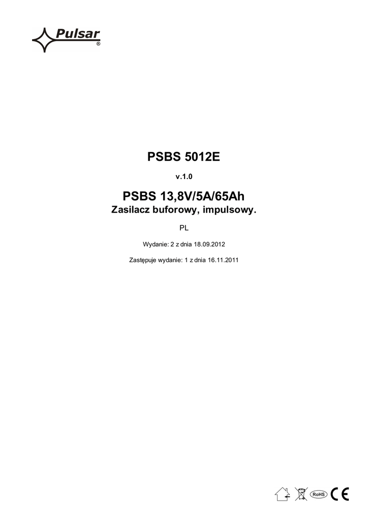 PSBS 5012E v.1.0 PSBS 13,8V/5A/65Ah Zasilacz buforowy, impulsowy. PL Wydanie: 2 z dnia 18.09.2012 Zastępuje wydanie: 1 z dnia 16.11.2011 www.pulsar.pl PSBS5012E Cechy zasilacza: • • • • • • • • • bezprzerwowe zasilanie DC 13,8V/5A miejsce na akumulator 65Ah/12V wysoka sprawność 72% kontrola ładowania i konserwacji akumulatora ochrona akumulatora przed nadmiernym rozładowaniem (UVP) zabezpieczenie wyjścia akumulatora przed zwarciem i odwrotnym podłączeniem prąd ładowania akumulatora 0,5A/1A/1,5A/2A przełączany zworką funkcja START manualnego załączenia akumulatora kontrola stanu bezpiecznika wyjścia AUX • sygnalizacja optyczna LED • wyjście techniczne FAC sygnalizacji zaniku sieci 230V • wyjście techniczne FPS awarii zasilacza wyzwalane przez: • zwarcie wyjścia (SCP) • przeciążenie wyjścia (OLP) • awarię przetwornicy napięcia DC/DC • zabezpieczenia: • przeciwzwarciowe SCP • przeciążeniowe OLP • termiczne OHP • przepięciowe • antysabotażowe SPIS TREŚCI: 1. Opis techniczny. 1.1. Opis ogólny 1.2. Schemat blokowy 1.3. Opis elementów i złącz zasilacza 1.4. Parametry techniczne 2. Instalacja. 2.1. Wymagania 2.2. Procedura instalacji 3. Sygnalizacja pracy zasilacza. 3.1. Sygnalizacja optyczna 3.2. Wyjścia techniczne 4. Obsługa oraz eksploatacja. 4.1. Przeciążenie lub zwarcie wyjścia zasilacza 4.2. Praca bateryjna 4.3. Konserwacja 1. Opis techniczny. 1.1. Opis ogólny. Zasilacz buforowy przeznaczony jest do nieprzerwanego zasilania urządzeń systemów alarmowych wymagających stabilizowanego napięcia 12V/DC (+/-15%). Zasilacz dostarcza napięcia 13,8 V DC o wydajności prądowej: 1. Prąd wyjściowy 5,0A (bez akumulatora) 2. Prąd wyjściowy 4,5A + 0,5A ładowanie akumulatora 3. Prąd wyjściowy 4,0A + 1,0A ładowanie akumulatora 4. Prąd wyjściowy 3,5A + 1,5A ładowanie akumulatora 5. Prąd wyjściowy 3,0A + 2,0A ładowanie akumulatora Sumaryczny prąd odbiorników + akumulator wynosi max 5A W przypadku zaniku napięcia sieciowego następuje natychmiastowe przełączenie na zasilanie akumulatorowe. Prąd ładowania akumulatora ustawiono fabrycznie na 1A. Zasilacz umieszczony jest w obudowie metalowej (kolor RAL 9003) z miejscem na akumulator 65Ah/12V. Obudowa wyposażona jest w mikroprzełącznik sygnalizujący otwarcie drzwiczek (czołówki) i oderwanie od podłoża. OPCJONALNE KONFIGURACJE ZASILACZA: (wizualizacja dostępna na www.pulsar.pl) PSBS 5012E z akumulatorem 65Ah. 1. Zasilacz buforowy PSBS 13,8V/4x1A/65Ah - PSBS 5012E + LB4 4x1A (AWZ575 lub AWZ576) + 65Ah 2. Zasilacz buforowy PSBS 13,8V/8x0,5A/65Ah - PSBS 5012E + LB8 8x0,5A (AWZ578 lub AWZ580) + 65Ah - PSBS 5012E + 2xLB4 2x4x0,5A (AWZ574 lub AWZ576) + 65Ah 2 www.pulsar.pl PSBS5012E 3. Zasilacz buforowy PSBS 13,8V/16x0,3A/65Ah - PSBS 5012E + 2xLB8 2x8x0,3A (AWZ577 lub AWZ580) + 65Ah 4. Zasilacz buforowy PSBS 13,8V/12V/5A/65Ah - PSBS 5012E + RN500 (13,8V/12V) + 65Ah 5. Zasilacz buforowy PSBS 13,8V/2x12V/2x2,5A/65Ah - PSBS 5012E + 2xRN250 (13,8V/12V) + 65Ah 6. Zasilacz buforowy PSBS 13,8V/12V/16x0,3A/65Ah - PSBS 5012E + RN500 (13,8V/12V) + 2xLB8 2x8x0,3A (AWZ577 lub AWZ580) + 65Ah 7. Zasilacz buforowy PSBS 13,8V/12V/8x0,5A/65Ah - PSBS 5012E + RN500 (13,8V/12V) + LB8 8x0,5A (AWZ578 lub AWZ580) + 65Ah 8. Zasilacz buforowy PSBS 13,8V/12V/4x1A/65Ah - PSBS 5012E + RN500 (13,8V/12V) + LB4 4x1A (AWZ575 lub AWZ576) + 65Ah 9. Zasilacz buforowy PSBS 13,8V/3x5V÷7,4V/3x2A/65Ah - PSBS 5012E + 3xDCDC20(3x5V÷7,4V/3x2A) + 65Ah 1.2. Schemat blokowy (rys.1). Rys.1. Schemat blokowy zasilacza. 3 www.pulsar.pl PSBS5012E 1.3. Opis elementów i złącz zasilacza. Tabela 1. Elementy płyty pcb zasilacza (patrz rys. 2). Element nr Opis [1] FBAT bezpiecznik w obwodzie akumulatora [2] START przycisk (uruchomienie zasilacza z akumulatora) PBAT; zworka - konfiguracja funkcji ochrony akumulatora UVP • PBAT = funkcja ochrony (odłączenia) akumulatora wyłączona [3] • PBAT = funkcja ochrony (odłączenia) akumulatora włączona zworka założona, zworka zdjęta Opis: [4] VADJ potencjometr, regulacja napięcia DC Złącza: +BAT- Wyjście zasilania DC akumulatora (+BAT= czerwony, -BAT = czarny) +AUX- Wyjście zasilania DC (+AUX= +U, -AUX=GND) FAC - wyjście techniczne braku sieci AC – typu OC (open collector) [5] poziom hi-Z = stan: awaria zasilania AC poziom L = stan: zasilanie AC FPS - wyjście techniczne stanu pracy zasilacza – typu OC (open collector) poziom hi-Z = stan: awaria poziom L = stan: praca poprawna Sygnalizacja optyczna LED: AC – dioda LED sygnalizująca obecność napięcia AC [6] LB – dioda LED sygnalizująca ładowanie akumulatora AUX – dioda LED sygnalizująca obecność napięcia wyjściowego DC IBAT; zworki- konfiguracja prądu ładowania akumulatora • J1= J2= Ibat =0,5 A • J1= J2= Ibat =1,0 A [7] J2= Ibat =1,5 A • J1= • J1= J2= Ibat =2,0 A Opis: zworka założona, zworka zdjęta [8] Złącze wyjścia dodatkowej zewnętrznej sygnalizacji optycznej AC i AUX. Rys. 2. Widok płyty pcb zasilacza. 4 www.pulsar.pl PSBS5012E Tabela 2. Elementy zasilacza (patrz rys. 3). Element nr Opis [1] Transformator separacyjny [2] Płyta zasilacza (tab. 1, rys. 2) [3] TAMPER x2; mikrowyłączniki (styki) ochrony antysabotażowej (NC) [4] FMAIN bezpiecznik w obwodzie zasilania (230V/AC) [5] [6] L-N złącze zasilania 230V/AC, Złącze ochrony PE Konektory akumulatora: +BAT = czerwony, - BAT = czarny Rys.3. Widok zasilacza. 5 www.pulsar.pl PSBS5012E 1.4. Parametry techniczne: - parametry elektryczne (tab.3) - parametry mechaniczne (tab.4) - bezpieczeństwo użytkowania (tab.5) - parametry eksploatacyjne (tab.6) Parametry elektryczne (tab. 3). Napięcie zasilania Pobór prądu Częstotliwość zasilania Moc zasilacza Sprawność Napięcie wyjściowe Prąd wyjściowy Czas narastania, opadania i podtrzymania napięcia wyjściowego Zakres regulacji napięcia wyjściowego Napięcie tętnienia Pobór prądu przez układy zasilacza Prąd ładowania akumulatora Zabezpiecze