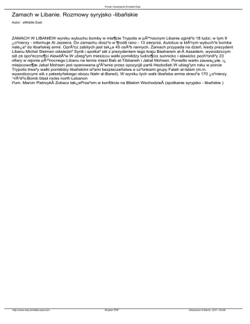 Portal i Kwartalnik Emiddle East Zamach w Libanie. Rozmowy syryjsko -libañskie Autor: eMiddle East ZAMACH W LIBANIEW wyniku wybuchu bomby w mie¶cie Trypolis w pó³nocnym Libanie zginê³o 18 ludzi, w tym 9 ¿o³nierzy - informuje Al Jazeera. Do zamachu dosz³o w ¶rodê rano - 13 sierpnia. Autobus w którym wybuch³a bomba nale¿a³ do libañskiej armii. Oprócz zabitych jest tak¿e 45 osób rannych. Zamach przypada na dzieñ, kiedy prezydent Libanu Michel Sleiman odwiedzi³ Syriê i spotka³ siê z prezydentem tego kraju Basharem al- Assadem, wywodz±cym siê ze spo³eczno¶ci Alawitów.W ubieg³ym miesi±cu walki pomiêdzy ludno¶ci± sunnick± i alawick± poch³onê³y 23 ofiary w rejonie pó³nocnego Libanu na ternie miast Bab al-Tibbaneh i Jabal Mohsen. Ponadto warto zauwa¿yæ, i¿ miejscowo¶æ Jabal Mohsen jest opanowana g³Ã³wnie przez opozycjê partii Hezbollah.W ubieg³ym roku w porcie Trypolis trwa³y walki pomiêdzy libañskimi si³ami bezpieczeñstwa a cz³onkami grupy Fatah al-Islam (m.in. wywodz±cymi siê z palestyñskiego obozu Nahr al-Bared). W wyniku tych walk libañska armia straci³a 170 ¿o³nierzy. ¬ród³o:Bomb blast rocks north Lebanon t³um. Marcin Pietrzyk Zobacz tak¿ePrze³om w konflikcie na Bliskim Wschodzie (spotkanie syryjsko - libañskie ) http://www.test.emiddle-east.com Kreator PDF Utworzono 4 March, 2017, 04:08
