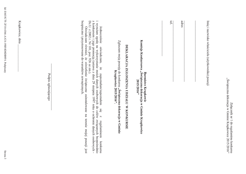 Zał cznik nr 1 do regulaminu konkursu „ wi teczna dekoracja w Gminie Krapkowice 2015/2016” Imi i nazwisko wła ciciela (u ytkownika) posesji ______________________________________ ______________________________________ adres ______________________________________ tel. ______________________ Burmistrz Krapkowic Komisja Konkursowa „ wi teczna dekoracja w Gminie Krapkowice 2015/2016” DEKLARACJA ZGŁOSZENIA UDZIAŁU W KONKURSIE Zgłaszam moj posesj do konkursu „ wi teczna dekoracja w Gminie Krapkowice 2015/2016”. Strona 3 Jednocze nie o wiadczam, e zapoznałam/zapoznałem si z regulaminem konkursu i wyra am zgod na wykorzystanie moich danych osobowych do celów zwi zanych bezpo rednio z konkursem i jego promocj (ustawa z dnia 29 sierpnia 1997 roku o ochronie danych osobowych Dz.U. z 2002 r. Nr 101, poz. 926 ze zm.). O wiadczam równie , e o wietlenie wi teczne zainstalowane na terenie mojej posesji jest bezpieczne i przystosowane do warunków zewn trznych. _____________________________ Podpis zgłaszaj cego Krapkowice, dnia _________________ Id: E8435C7F-2F10-4366-A1C4-19B54D8DB9F4. Podpisany