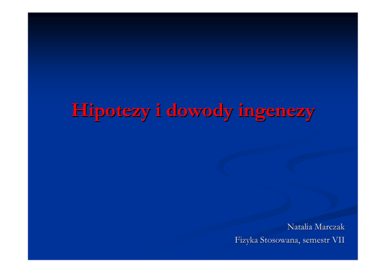 Hipotezy i dowody ingenezy Natalia Marczak Fizyka Stosowana, semestr VII Trochę historii… ¾ hipoteza powstała w 1993 r ¾ autor – Tadeusz Teller ¾ badania trwały kilkadziesiąt lat ¾ publikacja: „Człowiek, Kosmos i Kanon piękna”, rok wydania – 1994 INGENEZA - jest to pierwotna informacja genetyczna, kodowana zestawami konfiguracji cząstek elementarnych w jądrach atomów. Ingeneza organizuje życie działając od wewnątrz. Atomy zawierają, przenoszą i transformują Ingenezę (informacje). 1. Nośnikami ingenezy są atomy. Posłańcy ingenezy: ¾ fonony ¾ fotony 2. Ingeneza (informacja) jest czynnikiem niematerialnym. „Informacja jest informacją, a nie materią ani energią” (N. Wiener, 1948r.) Informacja jest czynnikiem niematerialnym przenoszonym przez materię i energię. Dowód: informacja zapisana na papierze (materia) → odczytana głosem (fala akustyczna) → zapisana na taśmę magnetofonową → odtworzona i przesłana → ponownie przetworzona na falę akustyczną → przyjęta przez organ słuchu → przeniesiona na neurony mózgu Przykład: setki tysięcy mikroorganizmów śluzowców (Myxomycophyta) → jeden żywy 120 000 żyć = 1 życie po wydaniu milionów nasion: 120 000 żyć = 0 lub miliony żyć 3. Informacja (ingeneza) może celowo oddziaływać na procesy biofizyczne i fizyczne. Przykłady: Rozkaz (informacja - program) „marsz !” lub „stój !” ¾ Widok lecącego ku nam kamienia (informacja) wywołuje odruch, pozwalający uniknąć skutków zadziałania praw fizyki. ¾ 4. Ingeneza tworzy niematerialny program kształtu płatka śniegu, a następnie steruje procesem jego materialnej realizacji. W przyrodzie taka dysharmonia nie występuje!!! Wyniki badań: ¾ każdy płatek śniegu ma niepowtarzalny kształt „spadochronu” ¾ różnorodność wzorów płatków jest nieograniczona Pytanie: gdzie rodzi się program kształtów oraz gdzie jest szybko działający „mechanizm” sterujący procesem ich budowy zgodnie z programem? Proces budowy płatka ¾ tryliony cząsteczek wody ¾ tryliony kwantów energii / s (dokładnie i celowo sterowane) ¾ każdy płatek rozwija się koncentrycznie Struktura kryształów lodu (heksagonalny układ atomów) atomy tlenu - kolor czarny atomy wodoru - kolor biały Atom tlenu Heksagonalny zarys płatka - sześć osi symetrii. Trygonalny zarys płatka trzy osie symetrii. Powstaje pytanie: Czy program tworzą protony, czy też neutrony atomu? Powstaje pytanie: Czy program tworzą protony, czy też neutrony atomu? Neutrony – projektodawcy programów Protony – realizują program Wnioski: 1. Program kształtu płatka powstaje wewnątrz atomu tlenu- inicjatora 2. Każdy rosnący płatek, możemy traktować jako organizm, który sam siebie programuje i buduje. 3. Ingeneza cząsteczki wody pełni tu rolę genu. Programuje ona i organizuje materię. 4. Niepowtarzalne kształty płatków są programowane i tworzone skokowo. 5. Skokowy rozwój przyrody wynika z działania programów ingenezy. 5. Procesy regeneracji uszkodzeń płatków są sterowane przez ingenezę. Przykład regeneracji: Co jest potrzebne do regeneracji aerostatyki płatka? pamięć kształtu ¾ niematerialny program ¾ „ręce” – narzędzia fizyczne służące do naprawy ¾ 6. Ingeneza steruje skokową metamorfozą i kreacją gatunków . Schemat odwracalnej metamorfozy owada i żaby: tworzenie nowych gatunków: Podsumowanie ¾ działa niematerialny czynnik organizujący celowe układy energii i materii (ingeneza – pierwotna informacja genetyczna, kodowana w atomach) nowa opcja filozofii nauki dotychczas: powstanie życia jest dziełem przypadku ¾ Bibliografia http://www.ingeneza.com/pl_ingeneza1.html http://www.ingeneza.com/pl_ingeneza.html http://encyklopedia.pwn.pl