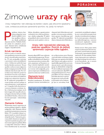 PORADNIK Zimowe urazy rąk NASZ EKSPERT dr n. med. Jarosław Strychar, specjalista ortopedii i traumatologii narządu ruchu, Szpital LUX MED Urazy nadgarstka i ręki zdarzają się bardzo często, gdy aktywnie spędzamy czas, zwłaszcza podczas uprawiania sportów, np. jazdy na nartach. P opularną zimową kontuzją są niegroźne urazy tkanek miękkich wywołane upadkiem (stłuczenia tkanki podskórnej, skręcenia stawów). Niekiedy dochodzi jednak do uszkodzeń poważnych: złamania kości, uszkodzenia ścięgien i więzadeł stawów. Kciuk narciarza Podczas jazdy na nartach najczęściej spotykanym urazem jest uszkodzenie więzadeł pobocznych kciuka. W tym przypadku mówimy o powstaniu ostrej niestabilności stawu śródręczno-paliczkowego kciuka (kciuku narciarza). Tuż po upadku z jednoczesnym odgięciem kciuka występują mocny ból, obrzęk, osłabienie siły chwytu ręki. Nie wolno lekceważyć objawów, ponieważ niewłaściwe leczenie często doprowadza do utrwalonej niestabilności kciuka oraz zaburzenia chwytu ręki. W większości przypadków leczenie kciuka narciarza polega na unieruchomieniu w szynie gipsowej na 5–6 tygodni. Jeśli schorzeniu towarzyszą złamanie awulsyjne (takie, w którym przyczepiające się do kości ścięgno lub więzadło odrywają fragment kostny) lub przewlekła niestabilność kciuka, wskazane jest leczenie operacyjne – rekonstrukcja więzadeł. bólem, obrzękiem, ograniczeniem ruchomości oraz widoczną deformacją w okolicy nadgarstka. W takich przypadkach zaleca się niezwłoczne zgłoszenie się do szpitala w celu wy- złamanie kości łódeczkowatej nadgarstka z towarzyszącym uszkodzeniem aparatu więzadłowego nadgarstka. W większości przypadków objawy złamania kości łódeczkowa- Urazy ręki najczęściej zdarzają się podczas upadków. Powrót do pełnej sprawności zajmuje kilka tygodni. konania zdjęcia RTG oraz założenia unieruchomienia gipsowego. W przypadku wieloodłamowych złamań ze znacznym przemieszczeniem odłamów proponuje się Pacjentowi zabieg z użyciem implantów metalowych. Leczenie operacyjne pozwala na wczesny ruch nadgarstka, przyspiesza rozpoczęcie rehabilitacji oraz poprawia ostateczny wynik leczenia. Złamanie kości łódeczkowatej Rzadziej spotykanym, ale bardzo groźnym urazem narciarskim jest tej są lekceważone przez Pacjenta z powodu braku wyraźnego zespołu bólowego oraz ograniczenia funkcji ręki. Pacjent często zgłasza się do ortopedy kilka tygodni lub nawet miesięcy po urazie z powodu utrzymującego się dyskomfortu nadgarstka. W celu weryfikacji rozpoznania wskazane jest wykonanie zdjęć RTG oraz tomografii komputerowej. Nawet prawidłowo leczone złamanie kości łódeczkowatej w opatrunku gipsowym często powoduje powstanie stawu rzekomego (jest to utrwalony brak zrostu kości), niestabilności nadgarstka oraz w przyszłości przyspieszenie choroby zwyrodnieniowej nadgarstka. Leczenie operacyjne z rekonstrukcją mikrochirurgiczną i użyciem metalowych implantów istotnie zmniejsza procent powikłań. Istnieje jeszcze duża grupa mniej rozpowszechnionych schorzeń ścięgien, kości i stawów kończyny górnej związanych z uprawianiem sportów zimowych. W celu ustalenia właściwego rozpoznania oraz zaplanowania odpowiedniego leczenia zalecana jest konsultacja, np. w naszym Centrum Chirurgii Ręki. Złamanie Collesa Wymieniając zimowe zagrożenia, nie można pominąć złamań w obrębie nadgarstka i ręki. Złamania dalszej nasady kości promieniowej stanowią blisko 17% wszystkich złamań zaopatrywanych na ostrych dyżurach ortopedycznych. Najczęstszą przyczyną takich złamań jest upadek na wyprostowaną kończynę górną z jednoczesnym zgięciem grzbietu dłoni w nadgarstku (złamanie Collesa). Uraz charakteryzuje się znacznym Podczas jazdy na nartach najczęściej spotykanym urazem ręki jest uszkodzenie więzadeł pobocznych kciuka. 1/2014 zima blisko zdrowia 7