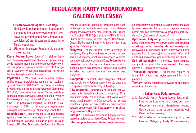 REGULAMIN KARTY PODARUNKOWEJ GALERIA WILEŃSKA I. Postanowienia ogólne i Definicje 1.1. Niniejszy Regulamin (dalej „Regulamin”) określa ogólne zasady wydawania i użytkowania przedpłaconej Karty Podarunkowej MasterCard dostarczanej przez firmę Flex-e-vouchers. 1.2. Użyte w niniejszym Regulaminie określenia oznaczają: Karta Podarunkowa („Karta”) – elektroniczny bon towarowy wydany na okaziciela, upoważniający do jednokrotnego lub wielokrotnego dokonywania zakupów w centrum handlowym, dla którego został wydany, w zakresie ustalonego na Karcie Podarunkowej limitu kwotowego. Wydawca – Wirecard Card Solution będąca spółką prawa brytyjskiego, wpisana do ewidencji pod numerem 07875693 z siedzibą w Wielkiej Brytanii przy 3-5 Hood Street, Grainger Chambers, NE1 6JQ, Newcastle upon Tyne. Nadzór nad działalnością banku sprawuje Urząd Regulacji Rynków Finansowych (ang. Financial Conduct Authority (FCA) ) na podstawie Regulacji o Pieniądzu Elektronicznym z 2011 r. dotyczących wydawania pieniądza elektronicznego. Numer rejestru 900051. Administrator – Flex-e-vouchers Limited będąca spółką prawa brytyjskiego, wpisana do ewidencji pod numerem 03983439 z siedzibą przy 28 West Street, LU6 1TA, Dunstable Bedfordshire. Flex-e -vouchers Limited obsługuje program Kart Podarunkowych w centrach handlowych na podstawie licencji Wydawcy Karty oraz, wraz z Global Processing Services FZ LLC (z siedzibą w Office 3214, Al Shatha Tower, Dubaj, Internet City, PO Box 502677, Dubaj, Zjednoczone Emiraty Arabskie), dostarcza systemy technologiczne. Nabywca – osoba fizyczna, która otrzymuje od Wydawcy Kartę Podarunkową w zamian za przekazanie Wydawcy środków pieniężnych w wysokości równej kwocie zasilenia Karty Podarunkowej. Posiadacz – osoba fizyczna, która weszła w posiadanie karty przedpłaconej MasterCard poprzez jej zakup lub została mu ona przekazana przez Nabywcę. Akceptant – podmiot, który przyjmuje płatność przy użyciu Karty Podarunkowej i wyraża zgodę na ten sposób zapłaty za towary i/lub usługi. Oświadczenie – deklaracja określająca cel wykorzystania danych osobowych Nabywcy. Przed wydaniem Karty Podarunkowej, Nabywca winien złożyć swój podpis na Oświadczeniu co oznacza udzielenie zgody na wykorzystanie i przetwarzanie danych osobowych Administratorowi oraz akceptację warunków Regulaminu. Paragon – niefiskalny dokument, będący potwierdzeniem zapłaty za zasilenie Karty Podarunkowej. Informacja o Karcie – zaświadczenie, zawierają- ce szczegółowe informacje o Karcie Podarunkowej tj. okres ważności Karty, kwoty zdeponowane na Karcie oraz kod aktywacyjny w przypadku kart wydanych z „Opóźnioną aktywacją”. Opóźniona Aktywacja – sposób wydawania Karty Podarunkowej, w którym Karta jest zasilona określoną kwotą pieniędzy ale jest nieaktywna. Nabywca lub Posiadacz może aktywować Kartę poprzez Kod Aktywacyjny w punkcie informacji centrum handlowego, poprzez infolinię lub online. Kod Aktywacyjny – 6-cyfrowy ciąg znaków służący do aktywacji Karty w przypadku Kart wydanych z „Opóźnioną aktywacją”. Transakcja łączona – transakcja zapłaty za towar lub usługi, przy wykorzystaniu kilku form płatności. Towary – rzeczy ruchome oferowane do sprzedaży w centrum handlowym. II. Zakup Karty Podarunkowej 2.1. Nabycie Karty Podarunkowej jest możliwe w punkcie informacji centrum handlowego na stronie internetowej www. flex-e-card.pl oraz stronie internetowej Centrum Handlowego. 2.2. Administrator zobowiązuje się do przekazania Nabywcy Karty Podarunkowej, 2.3. 2.4. 2.5. 2.6. a następnie do przyjmowania jej do realizacji w Centrum Handlowym, dla którego została wydana. Nabywca zobowiązuje się do przekazania Administratorowi środków pieniężnych w kwocie równej wysokości zasilenia Karty Podarunkowej oraz do realizacji Karty Podarunkowej w oznaczonym terminie ważności Karty. Deklarowana kwota zasilenia Karty Podarunkowej może być opłacana za pomocą gotówki, karty płatniczej lub przelewu. W przypadku płatności przelewem Nabywca zobowiązany jest do dokonania przelewu na wskazany przez Administratora rachunek bankowy a Karty Podarunkowe zostaną wydane Nabywcy najpóźniej następnego dnia po dniu zaksięgowania środków na rachunku bankowym. Maksymalna wartość zasilenia w przypadku kart zakupionych w centrum handlowym to 4000 PLN a minimalna to 30 PLN. Maksymalna wartość zasilenia w przypadku kart zakupionych przez Internet to 1000 PLN a minimalna to 50 PLN. Karta Podarunkowa zakupiona w centrum handlowym zostanie aktywowana najpóźniej w ciągu 30 minut od jej zakupu. W przypadku Kart wydanych z „Opóźnio- ną Aktywacją”, Karty są aktywowane za pomocą kodu aktywacyjnego przez Posiadacza w dowolnym czasie, nie później niż 12 miesięcy od jej zakupu i są aktywne w ciągu 30 minut od aktywacji. 2.7. Karta Podarunkowa zakupiona przez Internet jest aktywowana przez Posiadacza za pomocą kodu aktywacyjnego, który zostanie wysłany na adres email podany podczas zakupu Karty i aktywowana najpóźniej w ciągu 30 minut od jej aktywacji. 2.8. Wraz z Kartą Nabywca otrzyma: -- Paragon; -- Informacje o Karcie; 2.9. Saldo dostępnych środków na Karcie Podarunkowej nie może być zwiększone poprzez ponowne jej zasilenie. Po wykorzystaniu dostępnego limitu kwotowego Kartę Podarunkową należy zniszczyć. 2.10.Przed wydaniem Karty Podarunkowej Nabywca jest zobowiązany podać swoje dane osobowe, tj. imię, nazwisko oraz adres zamieszkania oraz podpisać Oświadczenie. Administrator zastrzega prawo weryfikacji podanych danych osobowych Nabywcy z danymi znajdującymi się w dowodzie tożsamości. 2.11.Niewyrażenie zgody na podanie danych osobowych lub okazanie dowodu tożsa- mości skutkuje odmówieniem wydania Karty Podarunkowej. 2.12.Nabywca zakupujący Karty w centrum handlowym zobowiązany jest do: •okazania dowodu tożsamości jeśli kwota transakcji przy zaku
