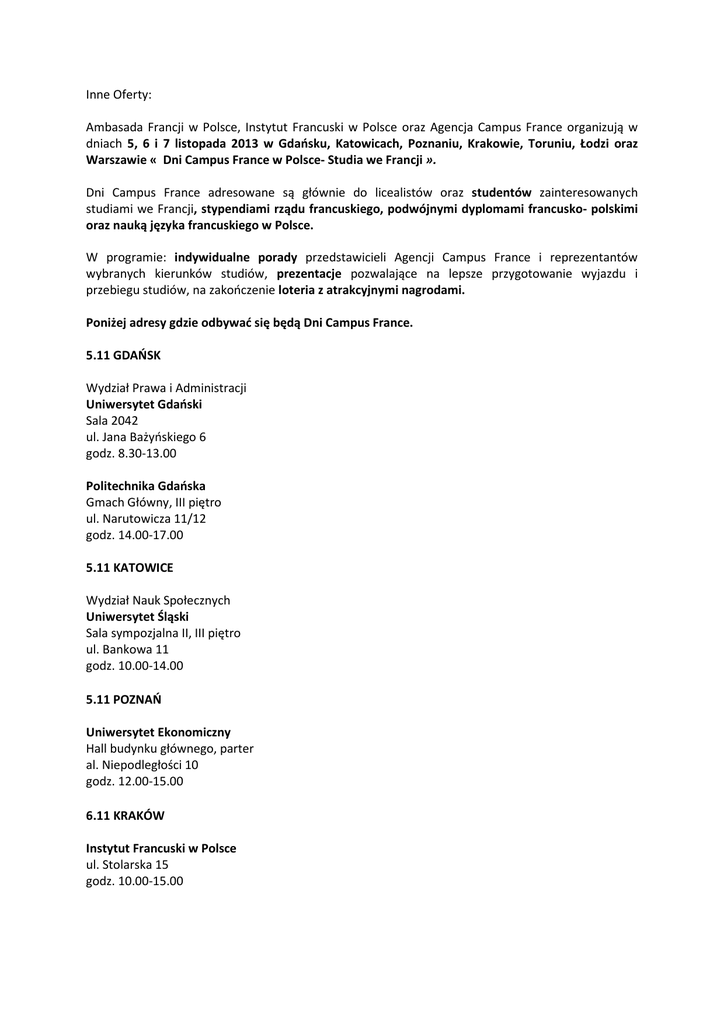 Inne Oferty: Ambasada Francji w Polsce, Instytut Francuski w Polsce oraz Agencja Campus France organizują w dniach 5, 6 i 7 listopada 2013 w Gdańsku, Katowicach, Poznaniu, Krakowie, Toruniu, Łodzi oraz Warszawie « Dni Campus France w Polsce- Studia we Francji ». Dni Campus France adresowane są głównie do licealistów oraz studentów zainteresowanych studiami we Francji, stypendiami rządu francuskiego, podwójnymi dyplomami francusko- polskimi oraz nauką języka francuskiego w Polsce. W programie: indywidualne porady przedstawicieli Agencji Campus France i reprezentantów wybranych kierunków studiów, prezentacje pozwalające na lepsze przygotowanie wyjazdu i przebiegu studiów, na zakończenie loteria z atrakcyjnymi nagrodami. Poniżej adresy gdzie odbywać się będą Dni Campus France. 5.11 GDAŃSK Wydział Prawa i Administracji Uniwersytet Gdański Sala 2042 ul. Jana Bażyńskiego 6 godz. 8.30-13.00 Politechnika Gdańska Gmach Główny, III piętro ul. Narutowicza 11/12 godz. 14.00-17.00 5.11 KATOWICE Wydział Nauk Społecznych Uniwersytet Śląski Sala sympozjalna II, III piętro ul. Bankowa 11 godz. 10.00-14.00 5.11 POZNAŃ Uniwersytet Ekonomiczny Hall budynku głównego, parter al. Niepodległości 10 godz. 12.00-15.00 6.11 KRAKÓW Instytut Francuski w Polsce ul. Stolarska 15 godz. 10.00-15.00 6.11 TORUŃ Wydział Nauk Ekonomicznych i Zarządzania Uniwersytet Mikołaja Kopernika ul. Gagarina 13a godz. 10.30-14.30 6.11 ŁÓDŹ Centrum Kształcenia Międzynarodowego Politechnika Łódzka Sala 2 ul. Żwirki 36 godz. 10.00-15.30 7.11 WARSZAWA Instytut Francuski w Polsce ul. Widok 12 godz. 9.30-15.30 Pełen program odnaleźć można na : www.polska.campusfrance.org oraz www.institutfrancais.pl/sciences-universites/ Wydarzenia na Facebooku : https://www.facebook.com/events/651721404860297/