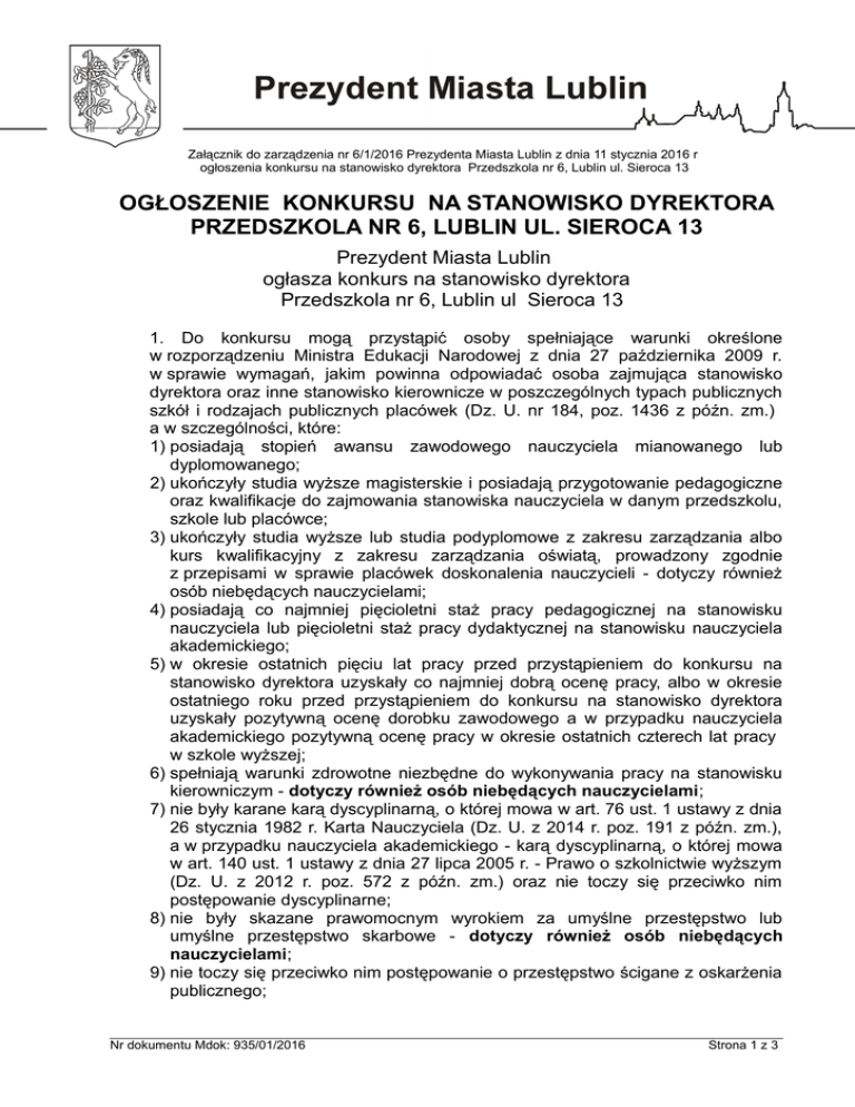 Załącznik do zarządzenia nr 6/1/2016 Prezydenta Miasta Lublin z dnia 11 stycznia 2016 r ogłoszenia konkursu na stanowisko dyrektora Przedszkola nr 6, Lublin ul. Sieroca 13 OGŁOSZENIE KONKURSU NA STANOWISKO DYREKTORA PRZEDSZKOLA NR 6, LUBLIN UL. SIEROCA 13 Prezydent Miasta Lublin ogłasza konkurs na stanowisko dyrektora Przedszkola nr 6, Lublin ul Sieroca 13 1. Do konkursu mogą przystąpić osoby spełniające warunki określone w rozporządzeniu Ministra Edukacji Narodowej z dnia 27 października 2009 r. w sprawie wymagań, jakim powinna odpowiadać osoba zajmująca stanowisko dyrektora oraz inne stanowisko kierownicze w poszczególnych typach publicznych szkół i rodzajach publicznych placówek (Dz. U. nr 184, poz. 1436 z późn. zm.) a w szczególności, które: 1) posiadają stopień awansu zawodowego nauczyciela mianowanego lub dyplomowanego; 2) ukończyły studia wyższe magisterskie i posiadają przygotowanie pedagogiczne oraz kwalifikacje do zajmowania stanowiska nauczyciela w danym przedszkolu, szkole lub placówce; 3) ukończyły studia wyższe lub studia podyplomowe z zakresu zarządzania albo kurs kwalifikacyjny z zakresu zarządzania oświatą, prowadzony zgodnie z przepisami w sprawie placówek doskonalenia nauczycieli - dotyczy również osób niebędących nauczycielami; 4) posiadają co najmniej pięcioletni staż pracy pedagogicznej na stanowisku nauczyciela lub pięcioletni staż pracy dydaktycznej na stanowisku nauczyciela akademickiego; 5) w okresie ostatnich pięciu lat pracy przed przystąpieniem do konkursu na stanowisko dyrektora uzyskały co najmniej dobrą ocenę pracy, albo w okresie ostatniego roku przed przystąpieniem do konkursu na stanowisko dyrektora uzyskały pozytywną ocenę dorobku zawodowego a w przypadku nauczyciela akademickiego pozytywną ocenę pracy w okresie ostatnich czterech lat pracy w szkole wyższej; 6) spełniają warunki zdrowotne niezbędne do wykonywania pracy na stanowisku kierowniczym - dotyczy również osób niebędących nauczycielami; 7) nie były karane karą dyscyplinarną, o której mowa w art. 76 ust. 1 ustawy z dnia 26 stycznia 1982 r. Karta Nauczyciela (Dz. U. z 2014 r. poz. 191 z późn. zm.), a w przypadku nauczyciela akademickiego - karą dyscyplinarną, o której mowa w art. 140 ust. 1 ustawy z dnia 27 lipca 2005 r. - Prawo o szkolnictwie wyższym (Dz. U. z 2012 r. poz. 572 z późn. zm.) oraz nie toczy się przeciwko nim postępowanie dyscyplinarne; 8) nie były skazane prawomocnym wyrokiem za umyślne przestępstwo lub umyślne przestępstwo skarbowe - dotyczy również osób niebędących nauczycielami; 9) nie toczy się przeciwko nim postępowanie o przestępstwo ścigane z oskarżenia publicznego; Nr dokumentu Mdok: 935/01/2016 Strona 1 z 3 10) nie były karane zakazem pełnienia funkcji związanych z dysponowaniem środkami publicznymi, o którym mowa w art. 31 ust. 1 pkt 4 ustawy z dnia 17 grudnia 2004 r. o odpowiedzialności za naruszenie dyscypliny finansów publicznych (Dz. U. z 2013 r. poz. 168 ) - dotyczy również osób niebędących nauczycielami; 11) posiadają obywatelstwo polskie, z tym że wymóg ten nie dotyczy obywateli państw członkowskich Unii Europejskiej, państw członkowskich Europejskiego Porozumienia o Wolnym Handlu (EFTA) - stron umowy o Europejskim Obszarze Gospodarczym oraz Konfederacji Szwajcarskiej - w przypadku osób niebędących nauczycielami; 12) ukończyły studia magisterskie - w przypadku osób niebędących nauczycielami; 13) posiadają co najmniej pięcioletni staż pracy, w tym co najmniej dwuletni staż pracy na stanowisku kierowniczym - w przypadku osób niebędących nauczycielami; 14) mają pełną zdolność do czynności prawnych i korzystają z praw publicznych w przypadku osób niebędących nauczycielami; 15) nie toczy się przeciwko nim postępowanie o przestępstwo ścigane z oskarżenia publicznego lub postępowanie dyscyplinarne - w przypadku osób niebędących nauczycielami. 2. Oferty osób przystępujących do konkursu powinny zawierać: 1) uzasadnienie przystąpienia do konkursu oraz koncepcję funkcjonowania i rozwoju publicznego przedszkola; 2) poświadczoną przez kandydata za zgodność z oryginałem kopię dowodu osobistego lub innego dokumentu potwierdzającego tożsamość oraz poświadczającego obywatelstwo kandydata; 3) życiorys z opisem przebiegu pracy zawodowej, zawierający w szczególności informację o: a) stażu pracy pedagogicznej - w przypadku nauczyciela, albo b) stażu pracy dydaktycznej - w przypadku nauczyciela akademickiego, albo c) stażu pracy, w tym stażu na stanowisku kierowniczym – w przypadku osoby niebędącej nauczycielem; 4) oryginały lub poświadczone przez kandydata za zgodność z oryginałem kopie dokumentów potwierdzających posiadanie wymaganego stażu pracy; 5) oryginały lub poświadczone przez kandydata za zgodność z oryginałem kopie dokumentów potwierdzających posiadanie wymaganego wykształcenia, w tym dyplomu ukończenia studiów wyższych lub świadectwa ukończenia studiów podyplomowych z zakresu zarządzania albo świadectwa ukończenia kursu kwalifikacyjnego z zakresu zarządzania oświatą; 6) oryginał lub poświadczoną przez kandydata za zgodność z oryginałem kopię aktu nadania stopnia nauczyciela mianowanego lub dyplomowanego wraz z jego uzasadnieniem - w przypadku nauczyciela; 7) oryginał lub poświadczoną przez kandydata za zgodność z oryginałem kopię karty oceny pracy lub oceny dorobku zawodowego – w przypadku nauczyciela i nauczyciela akademickiego; OGŁOSZENIE KONKURSU NA STANOWISKO DYREKTORA PRZEDSZKOLA NR 6, LUBLIN UL. SIEROCA 13 Załącznik do zarządzenia nr 6/1/2016 Prezydenta Miasta Lublin z dnia 11 stycznia 2016 r Nr dokumentu: 935/01/2016 Strona 2 z 3 8) zaświadczenie lekarskie o braku przeciwwskazań zdrowotnych do wykonywania pracy na stanowisku kierowniczym wydane przez lekarza medycyny pracy; 9) oświadczenie, że przeciwko kandydatowi nie toczy się postęp