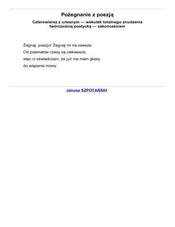 Pożegnanie z poezją Czterowiersz z urwanym — wskutek totalnego znudzenia twórczością poetycką — zakończeniem Żegnaj, poezjo! Żegnaj mi na zawsze. Od poematów czasy są ciekawsze, więc ci oświadczam, że już nie mam głowy do wiązania mowy. Janusz SZPOTAŃSKI