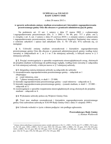 UCHWAŁA nr XX/142/13 RADY GMINY OSIE z dnia 20 marca 2013 r. w sprawie uchwalenia zmiany studium uwarunkowań i kierunków zagospodarowania przestrzennego gminy Osie dla obszaru w granicach administracyjnych gminy Na podstawie art. 12 ust. 1 ustawy z dnia 27 marca 2003 r. o planowaniu i zagospodarowaniu przestrzennym (Dz. U. z 2003 r. Nr 80, poz. 717 z późn. zm.1), w związku z art. 4, ust. 2 ustawy z dnia 25 czerwca 2010 r. o zmianie ustawy o planowaniu i zagospodarowaniu przestrzennym, ustawy o Państwowej Inspekcji Sanitarnej oraz ustawy o ochronie zabytków i opiece nad zabytkami (Dz. U. Nr 130 poz. 871) uchwala się, co następuje: § 1. Uchwalić zmianę studium uwarunkowań i kierunków zagospodarowania przestrzennego gminy Osie dla obszaru w granicach administracyjnych gminy według treści zawartej w załącznikach nr 1, nr 2 i nr 3 do niniejszej uchwały, o których mowa w § 3 niniejszej uchwały. § 2. Przyjąć rozstrzygnięcie o sposobie rozpatrzenia nieuwzględnionych uwag, złożonych do projektu studium wyłożonego do publicznego wglądu, według treści zawartej w załączniku nr 4 do niniejszej uchwały, o którym mowa w § 3 niniejszej uchwały. § 3. Integralną częścią niniejszej uchwały są załączniki do uchwały: 1) uwarunkowania zagospodarowania przestrzennego gminy – załącznik nr 1 obejmujący a) część tekstową, oraz b) 7 plansz tematycznych, w skali 1 : 25 000; 2) kierunki zagospodarowania przestrzennego gminy - część tekstowa – załącznik nr 2; 3) kierunki zagospodarowania przestrzennego gminy - rysunek studium, w skali 1 : 25 000 – załącznik nr 3; 4) rozstrzygnięcie o sposobie rozpatrzenia nieuwzględnionych uwag złożonych do projektu studium – załącznik nr 4. § 4. Wykonanie uchwały poleca się Wójtowi Gminy Osie. §5. Traci moc studium uwarunkowań i kierunków zagospodarowania przestrzennego gminy Osie uchwalone uchwałą nr X/63/99 Rady Gminy Osie z dnia 31 sierpnia 1999 r. § 6. Uchwała wchodzi w życie z dniem podjęcia i nie podlega ogłoszeniu. Przewodniczący Rady Gminy (-) Roman Waśkowski 1 Zmiany tekstu jednolitego wymienionej ustawy zostały ogłoszone w Dz. U. z 2003 r. Nr 80, poz.717, z 2004 r. Nr 6, poz. 41, Nr 141, poz. 1492, z 2005 r. Nr 113, poz. 954 i Nr 130, poz. 1087, z 2006 r. Nr 45, poz. 319 i Nr 225, poz. 1635, z 2008 r. Nr 123, poz. 803, Nr 199, poz. 1227, Nr 201, poz. 1237 i Nr 220, poz. 1413, oraz z 2010 r. Nr 24, poz. 124, Nr 75, poz. 474, Nr 106, poz. 675 i Nr 119, poz. 804 Uzasadnienie Rada Gminy Osie uchwałą nr XXVIII/174/10 z dnia 30 marca 2010 roku uchwaliła o przystąpieniu do sporządzenia zmiany Studium uwarunkowań i kierunków zagospodarowania przestrzennego gminy Osie dla obszaru w granicach administracyjnych, na podstawie uprzednio przeprowadzonej analizy zasadności przystąpienia do sporządzenia zmiany studium. Odstąpiono od analizy porównawczej części wstępnej opracowania sprzed 1999 r. Charakterystykę uwarunkowań przyrodniczo-krajobrazowych opracowano w oparciu o aktualnie dostępne źródła, znacznie obszerniejsze od tych sprzed ponad 12 laty. Analizie poddano wnioski złożone do przedmiotowej zmiany studium w odniesieniu do informacji o aktualnym stanie środowiska i aktualnych formach jego ochrony. Obszar gminy w całości jest objęty obszarem Natura 2000 PLB 220009 Bory Tucholskie, oraz obejmuje obszar Natura 2000 PLH 040017 Sandr Wdy, znaczną część Wdeckiego Parku Krajobrazowego, oraz część Śliwickiego Obszaru Chronionego Krajobrazu, sześć rezerwatów przyrody, trzy zespoły przyrodniczo-krajobrazowe, liczne użytki ekologiczne i pomniki przyrody; leży w centrum Leśnego Kompleksu Promocyjnego „Bory Tucholskie”. Charakterystyczną cechą gminy było, i jest nadal, wysokie zagęszczenie ludności na terenach nieleśnych i niski wskaźnik intensywności usług podstawowych. Głównym celem rozwoju gminy jest umacnianie dotychczasowej wiodącej funkcji turystyczno-wypoczynkowej i dążenie do poprawy jakości życia jej mieszkańców. W projekcie zmiany Studium uwzględniono większość wniosków indywidualnych oraz wytyczonych przez Radę Gminy a sprecyzowanych przez Wójta Gminy przy udziale Urzędu Gminy. Głównym kryterium przy rozpatrywaniu wniosków była ich zgodność z celami rozwoju przy zachowaniu uwarunkowań wynikających z potrzeby ochrony przyrody i walorów przyrodniczokrajobrazowych obszarów otwartych (rolniczych), leśnych, nadwodnych i zabudowanych. Za podstawowe ograniczenie rozwoju przestrzennego zabudowy uznano przede wszystkim ochronę krajobrazu i przyrody, która ją tworzy. Funkcje zabudowy wynikają z potrzeb mieszkańców a wśród nich właścicieli nielicznych zakładów produkcyjnych działających w poszanowaniu szczególnych cech środowiska naturalnego, częściowo z wykorzystaniem jego wytworów (zakłady drzewne). Ochrona dóbr kultury materialnej jest prowadzona poprzez działania zachowawcze w stosunku do zabudowy historycznej i jej otoczenia w formie ustanowionych stref ścisłej ochrony konserwatorskiej A, ochrony historycznych układów zabudowy wsi i zespołów zabudowy dworców kolejowych, zabudowy folwarcznej, elektrowni (ŻUR) z urządzeniami wodnymi, z zabudową pomocniczą oraz cmentarzy w formie ustanowionych stref ochrony konserwatorskiej B. Obszar gminy został w całości rozpoznany pod względem archeologicznym w trakcie badań powierzchniowych prowadzonych w ramach Archeologicznego Zdjęcia Polski. Wyznaczono strefy „W” ochrony archeologicznej, w których dopuszcza się działalność inwestycyjną pod warunkiem przeprowadzenia wyprzedzających badań archeologicznych. Na obszarze gminy brak jest czytelnych konfliktów funkcjonalno-przestrzennych, jej strukturę kształtują funkcje koegzystujące z wzajemną tolerancją przy poszanowaniu otaczającej przyrody. Spójnemu rozwojowi zagospodarowania przestrzennego w obszarach wskazanych do ewentualnego przekształcania pod zabudowę sprzyja