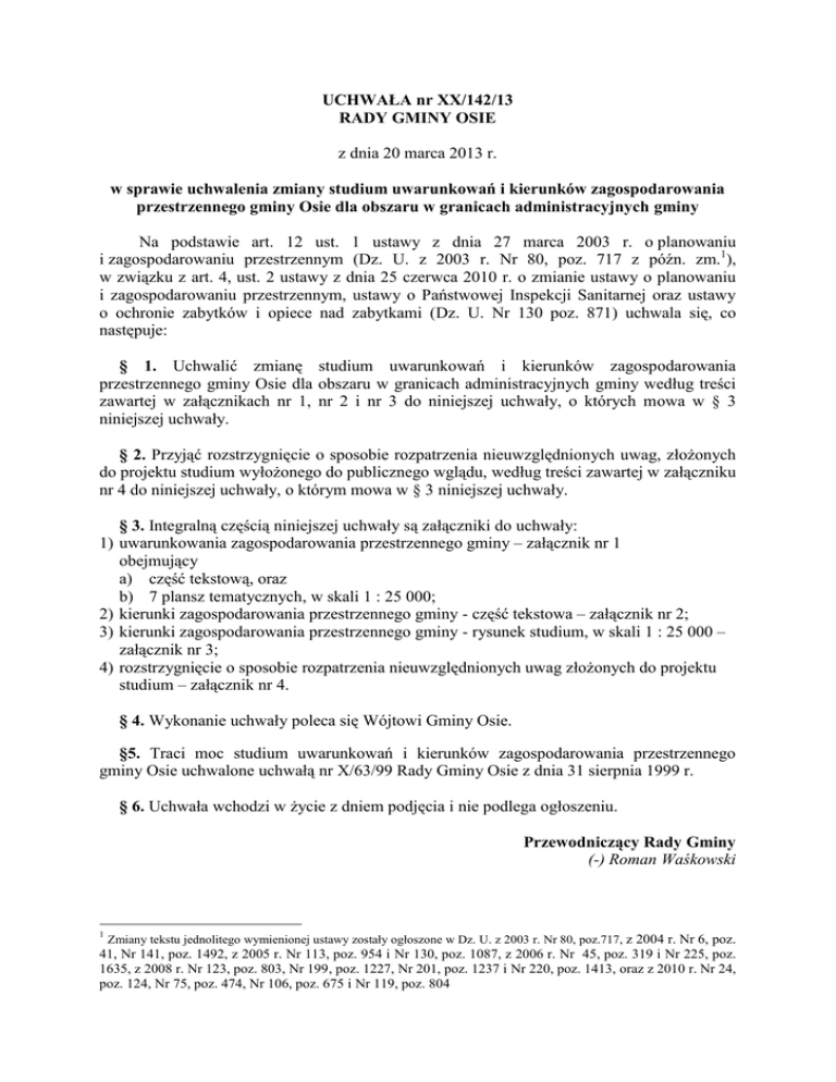 UCHWAŁA nr XX/142/13 RADY GMINY OSIE z dnia 20 marca 2013