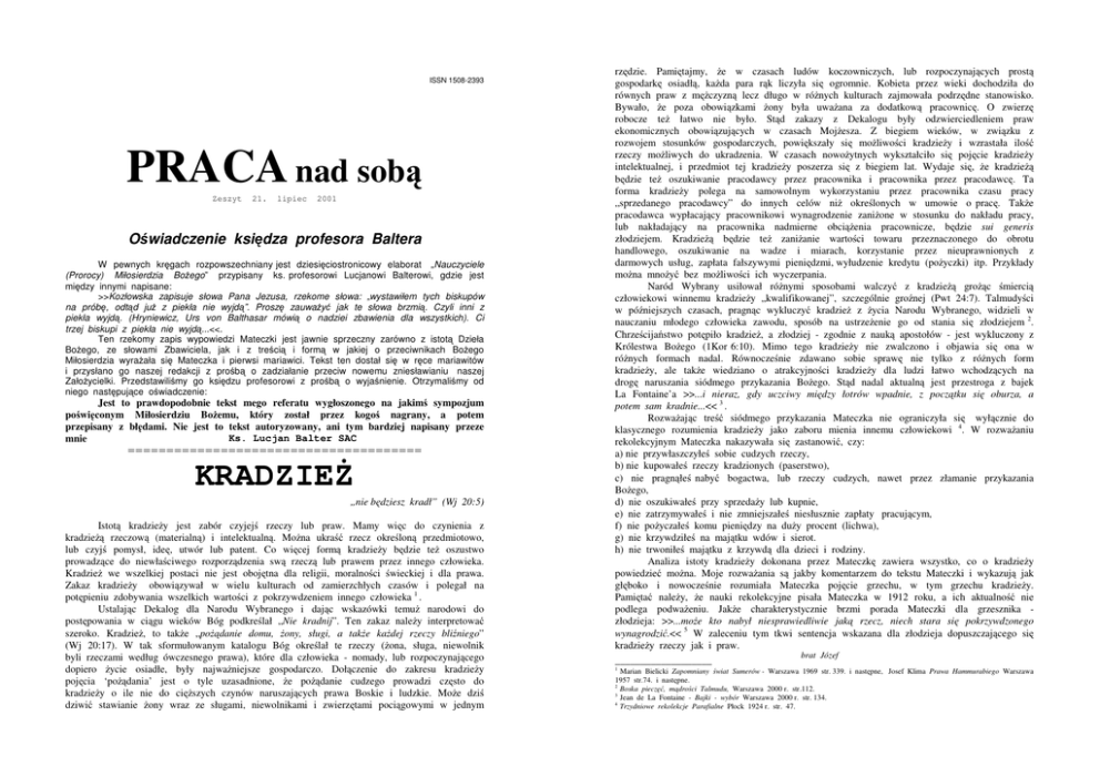 ISSN 1508-2393 PRACA nad sob Zeszyt 21. lipiec 2001 O wiadczenie ksi dza profesora Baltera W pewnych kr gach rozpowszechniany jest dziesi ciostronicowy elaborat „Nauczyciele (Prorocy) Miłosierdzia Bo ego” przypisany ks. profesorowi Lucjanowi Balterowi, gdzie jest mi dzy innymi napisane: >>Kozłowska zapisuje słowa Pana Jezusa, rzekome słowa: „wystawiłem tych biskupów na prób , odt d ju z piekła nie wyjd ”. Prosz zauwa y jak te słowa brzmi . Czyli inni z piekła wyjd . (Hryniewicz, Urs von Balthasar mówi o nadziei zbawienia dla wszystkich). Ci trzej biskupi z piekła nie wyjd ...<<. Ten rzekomy zapis wypowiedzi Mateczki jest jawnie sprzeczny zarówno z istot Dzieła Bo ego, ze słowami Zbawiciela, jak i z tre ci i form w jakiej o przeciwnikach Bo ego Miłosierdzia wyra ała si Mateczka i pierwsi mariawici. Tekst ten dostał si w r ce mariawitów i przysłano go naszej redakcji z pro b o zadziałanie przeciw nowemu zniesławianiu naszej Zało ycielki. Przedstawili my go ksi dzu profesorowi z pro b o wyja nienie. Otrzymali my od niego nast puj ce o wiadczenie: Jest to prawdopodobnie tekst mego referatu wygłoszonego na jakim sympozjum po wi conym Miłosierdziu Bo emu, który został przez kogo nagrany, a potem przepisany z bł dami. Nie jest to tekst autoryzowany, ani tym bardziej napisany przeze Ks. Lucjan Balter SAC mnie ====================================== KRADZIE „nie b dziesz kradł” (Wj 20:5) Istot kradzie y jest zabór czyjej rzeczy lub praw. Mamy wi c do czynienia z rzeczow (materialn ) i intelektualn . Mo na ukra rzecz okre lon przedmiotowo, kradzie lub czyj pomysł, ide , utwór lub patent. Co wi cej form kradzie y b dzie te oszustwo prowadz ce do niewła ciwego rozporz dzenia sw rzecz lub prawem przez innego człowieka. Kradzie we wszelkiej postaci nie jest oboj tna dla religii, moralno ci wieckiej i dla prawa. Zakaz kradzie y obowi zywał w wielu kulturach od zamierzchłych czasów i polegał na pot pieniu zdobywania wszelkich warto ci z pokrzywdzeniem innego człowieka 1 . Ustalaj c Dekalog dla Narodu Wybranego i daj c wskazówki temu narodowi do post powania w ci gu wieków Bóg podkre lał „Nie kradnij”. Ten zakaz nale y interpretowa szeroko. Kradzie , to tak e „po danie domu, ony, sługi, a tak e ka dej rzeczy bli niego” (Wj 20:17). W tak sformułowanym katalogu Bóg okre lał te rzeczy ( ona, sługa, niewolnik byli rzeczami według ówczesnego prawa), które dla człowieka - nomady, lub rozpoczynaj cego dopiero ycie osiadłe, były najwa niejsze gospodarczo. Doł czenie do zakresu kradzie y poj cia ‘po dania’ jest o tyle uzasadnione, e po danie cudzego prowadzi cz sto do kradzie y o ile nie do ci szych czynów naruszaj cych prawa Boskie i ludzkie. Mo e dzi dziwi stawianie ony wraz ze sługami, niewolnikami i zwierz tami poci gowymi w jednym rz dzie. Pami tajmy, e w czasach ludów koczowniczych, lub rozpoczynaj cych prost gospodark osiadł , ka da para r k liczyła si ogromnie. Kobieta przez wieki dochodziła do równych praw z m czyzn lecz długo w ró nych kulturach zajmowała podrz dne stanowisko. Bywało, e poza obowi zkami ony była uwa ana za dodatkow pracownic . O zwierz robocze te łatwo nie było. St d zakazy z Dekalogu były odzwierciedleniem praw ekonomicznych obowi zuj cych w czasach Moj esza. Z biegiem wieków, w zwi zku z rozwojem stosunków gospodarczych, powi kszały si mo liwo ci kradzie y i wzrastała ilo rzeczy mo liwych do ukradzenia. W czasach nowo ytnych wykształciło si poj cie kradzie y intelektualnej, i przedmiot tej kradzie y poszerza si z biegiem lat. Wydaje si , e kradzie b dzie te oszukiwanie pracodawcy przez pracownika i pracownika przez pracodawc . Ta forma kradzie y polega na samowolnym wykorzystaniu przez pracownika czasu pracy „sprzedanego pracodawcy” do innych celów ni okre lonych w umowie o prac . Tak e pracodawca wypłacaj cy pracownikowi wynagrodzenie zani one w stosunku do nakładu pracy, lub nakładaj cy na pracownika nadmierne obci enia pracownicze, b dzie sui generis b dzie te zani anie warto ci towaru przeznaczonego do obrotu złodziejem. Kradzie handlowego, oszukiwanie na wadze i miarach, korzystanie przez nieuprawnionych z darmowych usług, zapłata fałszywymi pieni dzmi, wyłudzenie kredytu (po yczki) itp. Przykłady mo na mno y bez mo liwo ci ich wyczerpania. gro c mierci Naród Wybrany usiłował ró nymi sposobami walczy z kradzie człowiekowi winnemu kradzie y „kwalifikowanej”, szczególnie gro nej (Pwt 24:7). Talmudy ci w pó niejszych czasach, pragn c wykluczy kradzie z ycia Narodu Wybranego, widzieli w nauczaniu młodego człowieka zawodu, sposób na ustrze enie go od stania si złodziejem 2. Chrze cija stwo pot piło kradzie , a złodziej - zgodnie z nauk apostołów - jest wykluczony z Królestwa Bo ego (1Kor 6:10). Mimo tego kradzie y nie zwalczono i objawia si ona w ró nych formach nadal. Równocze nie zdawano sobie spraw nie tylko z ró nych form kradzie y, ale tak e wiedziano o atrakcyjno ci kradzie y dla ludzi łatwo wchodz cych na drog naruszania siódmego przykazania Bo ego. St d nadal aktualn jest przestroga z bajek La Fontaine’a >>...i nieraz, gdy uczciwy mi dzy łotrów wpadnie, z pocz tku si oburza, a potem sam kradnie...<< 3 . siódmego przykazania Mateczka nie ograniczyła si wył cznie do Rozwa aj c tre klasycznego rozumienia kradzie y jako zaboru mienia innemu człowiekowi 4. W rozwa aniu rekolekcyjnym Mateczka nakazywała si zastanowi , czy: a) nie przywłaszczyłe sobie cudzych rzeczy, b) nie kupowałe rzeczy kradzionych (paserstwo), c) nie pragn łe naby bogactwa, lub rzeczy cudzych, nawet przez złamanie przykazania Bo ego, d) nie oszukiwałe przy sprzeda y lub kupnie, e) nie zatrzymywałe i nie zmniejszałe niesłusznie zapłaty pracuj cym, f) nie po yczałe komu pieni dzy na du y procent (lichwa), g) nie krzywdziłe na maj tku wdów i sierot. h) nie trwoniłe maj tku z krzywd dla dzieci i rodziny. Analiza istoty kradzie y dokonana przez Mateczk zawiera
