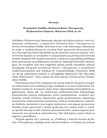 Recenzja Przemysław Osóbka, Parlament Bośni i Hercegowiny, Wydawnictwo Sejmowe, Warszawa 2010, ss. 44 Nakładem Wydawnictwa Sejmowego ukazała się kolejna pozycja z serii wydawniczej „Parlamenty”, a mianowicie Parlament Bośni i Hercegowiny autorstwa Przemysława Osóbki. Powinna to być o tyle interesująca informacja, że wciąż w polskiej literaturze wyraźny brak opracowań dotyczących Bośni i Hercegowiny, które odnosiłyby się do tematyki innej niż wojenna. Wiele bowiem książek czy artykułów w czasopismach jest poświęconych kwestii działań zbrojnych lub czystek etnicznych, a nieliczne są przykłady publikacji, które poświęcone są problematyce ustrojowej, skądinąd niezwykle interesującej. Do wyjątków pod tym względem można przede wszystkim zaliczyć monografię Europejski protektorat? Bośnia i Hercegowina w perspektywie środkowoeuropejskiej pod redakcją M. Gniazdowskiego (Warszawa 2008) czy też np. pojedyncze artykuły w „Przeglądzie Sejmowym” lub „Roczniku Nauk Politycznych”. Teraz można do nich zaliczyć również pracę Przemysława Osóbki. Omawianej pozycji bez wątpienia nie można zaliczyć do grona szczególnie obszernych, jest to jednak przyjęty standard w tej serii wydawniczej. Podzielona została na trzynaście części, które odpowiadają poszczególnym zagadnieniom, takim jak: rys historyczny parlamentaryzmu bośniackiego, konstytucyjna pozycja parlamentu, prawo parlamentarne, struktura parlamentu, system wyborczy, deputowani, grupy parlamentarne, organizacja wewnętrzna, funkcjonowanie parlamentu, funkcja ustawodawcza, uchwalenie budżetu, parlament a inne organy państwowe oraz organy pomocnicze. Ponadto Autor opracował w formie graficznej trzy aneksy, które w czytelny sposób ukazują wyniki wyborów parlamentarnych, system organów państwowych oraz procedurę ustawodawczą. Taki układ pracy uznać należy za logiczny i prawidłowy. Wypada zgodzić się z Autorem, że „Problemy, z którymi boryka się Bośnia i Hercegowina, znajdują swoje odzwierciedlenie w kształcie jej systemu 244 PRZEGLĄD PRAWA KONSTYTUCYJNEGO 2011/2 politycznego oraz w mechanizmach nim rządzących” (s. 5). Tym bardziej trzeba docenić wysiłek włożony w analizę obowiązujących w tym państwie rozwiązań, narzuconych zresztą w listopadzie 1995 r. przez wspólnotę międzynarodową w ramach porozumienia pokojowego z Dayton. Brak jest bowiem w Europie drugiego kraju, w którym za pomocą równie skomplikowanego porządku konstytucyjnego próbowano by wprowadzić trwały pokój między mocno zwaśnione narody – w tym przypadku Bośniaków, Serbów i Chorwatów. Ofiarą tego systemu stał się także organ legislatury – Skupština Parlamentarna Bośni i Hercegowiny, składająca się z Izby Reprezentantów1 oraz Izby Narodów. Autor starając się przedstawić możliwie dokładnie genezę obecnych rozwiązań, sięga do historii, ukazując kształtowanie się parlamentaryzmu na tym obszarze. Podkreśla rolę pierwszego Saboru Bośniackiego, powołanego jeszcze przez władze austro-węgierskie na początku XX w. Już wtedy skład parlamentu stanowił odwzorowanie składu religijnego społeczeństwa (s. 8). W następnych latach ten podział konfesyjny na muzułmanów, prawosławnych i katolików przerodził się w podział narodowy, co znalazło odbicie we wszystkich organach władzy. To zjawisko jest szczególnie widoczne w obecnie obowiązującym porządku prawnym, co często podkreśla autor (s. 11). Przy omawianiu procedury głosowania (s. 26), strukturze komisji parlamentarnych (s. 23–24), a przede wszystkim przy analizie prawa wyborczego (s. 16–19) wyraźne są cele, które przyświecały ustrojodawcy – zapewnienie równouprawnienia Bośniaków, Serbów i Chorwatów nawet kosztem sprawnego funkcjonowania parlamentu czy też naruszenia niektórych demokratycznych praw przedstawicieli innych narodów. Z podkreśleniem dominującej pozycji narodów konstytutywnych można się także spotkać przy dokonanej przez autora analizie składu izby wyższej parlamentu – Izby Narodów, gdzie nie mogą zasiadać przedstawiciele innych narodów niż wymienione powyżej, jak też przy omówieniu wymogów dotyczących kworum, w którym każdy z tych narodów musi mieć odpowiedni udział (s. 25). Przemysław Osóbka zwraca również uwagę na procedurę ochrony tzw. „żywotnych interesów każdego z trzech narodów” (s. 27), która to może doprowadzić do paraliżu prac parlamentarnych. Po przeprowadzonej analizie pozycji ustrojowej parlamentu oraz jego zakresu kompetencji i relacji z innymi organami władzy (kolegialnym Prezy1 W literaturze można też znaleźć określenie „Izba Przedstawicielska”. Recenzja • Parlament Bośni i Hercegowiny 245 dium, Radą Ministrów i Sądem Konstytucyjnym) autor słusznie zauważa, że rola Skupština Parlamentarnej w systemie politycznym jest w znacznym stopniu ograniczona. Na taki stan rzeczy wpływają zarówno prerogatywy 3-osobowego Prezydium Bośni i Hercegowiny (składającego się z Bośniaka, Serba i Chorwata), jak i szerokie kompetencje parlamentów dwóch jednostek składowych – Federacji Bośni i Hercegowiny oraz Republiki Serbskiej. Nie można zapomnieć także o tym, że Bośnia i Hercegowina stała się de facto protektoratem w następstwie działalności Urzędu Wysokiego Przedstawiciela (OHR), będącego reprezentantem wspólnoty międzynarodowej. Może on – na mocy nadanych w 1997 r. w Bonn kompetencji – dymisjonować osoby zajmujące nawet najwyższe stanowiska państwowe (w tym w Prezydium), jeśli tylko istnieje podejrzenie działania na szkodę procesu pokojowego (s. 13). Jest także w stanie narzucać ustawy, jeśli parlament nie potrafi samodzielnie podjąć decyzji2. Autor słusznie zauważa, że – mimo kontrowersyjności samej idei istnienia organu – podejmowane przez OHR działania i presja z jego strony wpłynęły na poprawę funkcjonalności organó