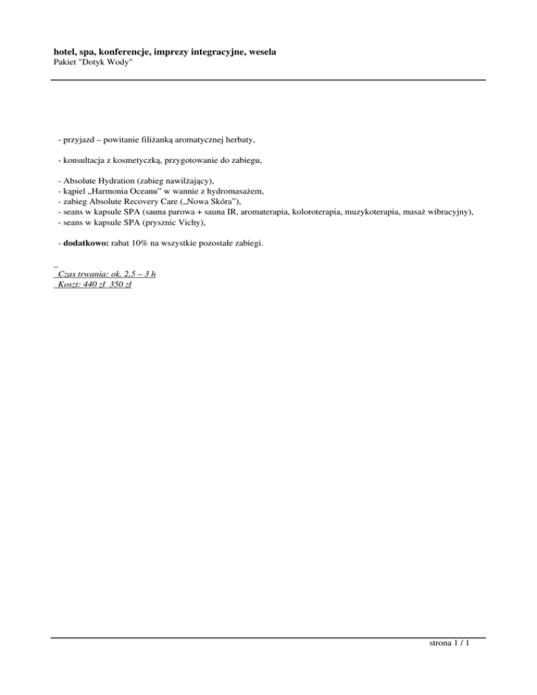 hotel, spa, konferencje, imprezy integracyjne, wesela Pakiet "Dotyk Wody" - przyjazd – powitanie filiżanką aromatycznej herbaty, - konsultacja z kosmetyczką, przygotowanie do zabiegu, - Absolute Hydration (zabieg nawilżający), - kąpiel „Harmonia Oceanu” w wannie z hydromasażem, - zabieg Absolute Recovery Care („Nowa Skóra”), - seans w kapsule SPA (sauna parowa + sauna IR, aromaterapia, koloroterapia, muzykoterapia, masaż wibracyjny), - seans w kapsule SPA (prysznic Vichy), - dodatkowo: rabat 10% na wszystkie pozostałe zabiegi. Czas trwania: ok. 2,5 – 3 h Koszt: 440 zł 350 zł strona 1 / 1