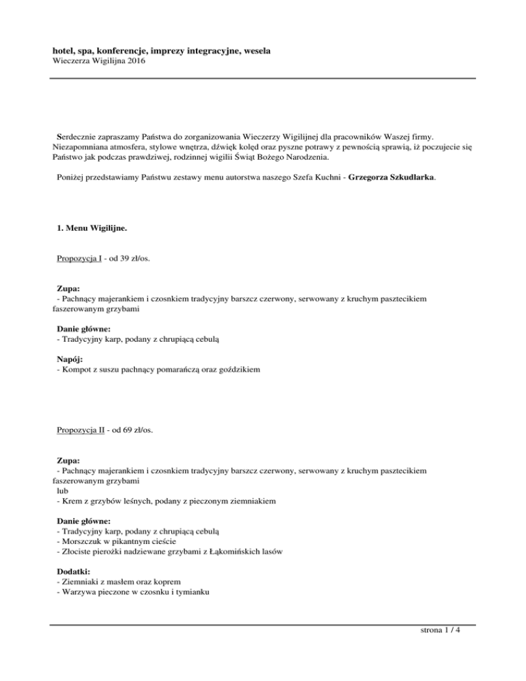 hotel, spa, konferencje, imprezy integracyjne, wesela Wieczerza Wigilijna 2016 Serdecznie zapraszamy Państwa do zorganizowania Wieczerzy Wigilijnej dla pracowników Waszej firmy. Niezapomniana atmosfera, stylowe wnętrza, dźwięk kolęd oraz pyszne potrawy z pewnością sprawią, iż poczujecie się Państwo jak podczas prawdziwej, rodzinnej wigilii Świąt Bożego Narodzenia. Poniżej przedstawiamy Państwu zestawy menu autorstwa naszego Szefa Kuchni - Grzegorza Szkudlarka. 1. Menu Wigilijne. Propozycja I - od 39 zł/os. Zupa: - Pachnący majerankiem i czosnkiem tradycyjny barszcz czerwony, serwowany z kruchym pasztecikiem faszerowanym grzybami Danie główne: - Tradycyjny karp, podany z chrupiącą cebulą Napój: - Kompot z suszu pachnący pomarańczą oraz goździkiem Propozycja II - od 69 zł/os. Zupa: - Pachnący majerankiem i czosnkiem tradycyjny barszcz czerwony, serwowany z kruchym pasztecikiem faszerowanym grzybami lub - Krem z grzybów leśnych, podany z pieczonym ziemniakiem Danie główne: - Tradycyjny karp, podany z chrupiącą cebulą - Morszczuk w pikantnym cieście - Złociste pierożki nadziewane grzybami z Łąkomińskich lasów Dodatki: - Ziemniaki z masłem oraz koprem - Warzywa pieczone w czosnku i tymianku strona 1 / 4 hotel, spa, konferencje, imprezy integracyjne, wesela Wieczerza Wigilijna 2016 Zakąski: - Śledź na trzy sposoby (z cebulą, z grzybami, w sosie musztardowym) - Deska serów francuskich podana z oliwkami, konfiturą oraz tłuczonymi orzechami - Groch z kapustą pachnący czosnkiem oraz natką - Dorsz w galarecie z jajkiem przepiórczym - Sałatka jarzynowa /ziemniak, marchew, seler, pietruszka, jajko, kukurydza, jabłko, groszek, ogórek konserwowy, majonez/ - Sałata z pieczonym camembertem /mix sałat, camembert, pomidorek koktajlowy, figa, szczypior, dressing miodowo-musztardowy/ Napój: - Kompot z suszu pachnący pomarańczą oraz goździkiem Propozycja III - od 89 zł/os. Zupa: - Pachnący majerankiem i czosnkiem tradycyjny barszcz czerwony, serwowany z kruchym pasztecikiem faszerowanym grzybami lub - Krem z grzybów leśnych, podany z pieczonym ziemniakiem Danie główne: - Tradycyjny karp, podany z chrupiącą cebulą - Pstrąg doprawiony koprem, solą morską oraz grubo mielonym pieprzem - Złociste pierożki nadziewane grzybami z Łąkomińskich lasów - Kapusta z grzybami doprawiona świeżo mielonym pieprzem, natką oraz czosnkiem Dodatki: - Ziemniaki z masłem oraz koprem - Pieczone ziemniaki w łupinie - Warzywa smażone w maśle Zakąski: - Śledź na trzy sposoby (z cebulą, z grzybami, w sosie musztardowym) - Jajka mollet w sosie na styl tatarski - Pszenica z makiem w miodzie - Tatar ze śledzia, podany z pieczoną papryką - Filet z dorsza w pikantnym sosie z warzywami -Sałatka z fasolą /fasola, por, papryka, szczypior, pomidorek koktajlowy, dressing majonezowo-śmietanowy/ - Sałata z krewetką /mix sałat, krewetka, śliwka wędzona, mango, cebula czerwona, vinegrette/ Napój: - Kompot z suszu pachnący pomarańczą oraz goździkiem strona 2 / 4 hotel, spa, konferencje, imprezy integracyjne, wesela Wieczerza Wigilijna 2016 Desery: - Sernik z dodatkiem słonego karmelu, serwowany z lodami korzennymi oraz kruszoną maliną - od 10 zł - Delikatny krem pomarańczowy, podany z orzechowym ciastkiem i sosem anyżowym - od 10 zł - Ciasta domowego wypieku - od 6 zł 2. Prezenty od Pałacyku Łąkomin z okazji nadchodzących Świąt Bożego Narodzenia.* - przy grupie min. 25 os.: dwa zestawy upominkowe, zawierające piwa z naszeog Browaru Rzemieślniczego (do rozdania/rozlosowania wśród uczestników), - przy grupie min. 35 os.: dwa zestawy upominkowe, zawierające piwa z naszeog Browaru Rzemieślniczego (do rozdania/rozlosowania wśród uczestników) + wypożyczenie fontanny czekoladowej - całkowicie GRATIS! * Przy zestawach Menu: II i III 3. Atrakcje Wigilijne (GRATIS!). - wspólne ubieranie choinki, - wspólnie śpiewanie kolęd (zapewniamy śpiewniki i płyty), - wypożyczenie sanek, - wspólne lepienie bałwana (zapewniamy akcesoria). 4. Noclegi (opcjonalnie). - MEGA rabat: już od 50 zł./os. (w zależności od ilości osób)! 5. Dodatkowe atrakcje (ocjonalnie). - np. przygotowanie prezentów dla uczestników, muzyka na żywo, kulig, wynajęcie Św. Mikołaja – ceny ustalane indywidualnie. strona 3 / 4 hotel, spa, konferencje, imprezy integracyjne, wesela Wieczerza Wigilijna 2016 5. Catering. Istnieje także możliwość zorganizowania Spotkania Wigilijnego u Państwa, w firmie - prosimy o zapytanie. Szczegóły pakietu i rezerwacje: e-mail: [email protected], telefon: +48 660438265 Oferta obowiązuje od 1.12.2016 r. do 30.12.2016 r. strona 4 / 4