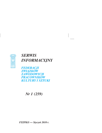SERWIS INFORMACYJNY FEDERACJI ZWI¥ZKÓW ZAWODOWYCH PRACOWNIKÓW KULTURY I SZTUKI Nr 1 (259) FZZPKiS — Styczeñ 2010 r. SPIS TREŒCI: 1. Motto . . . . . . . . . . . . . . . . . . . . . . . . . . . . . . . . . . . . . 1 2. Protest przeciwko projektowi ³¹czenia bibliotek publicznych z innymi instytucjami i bibliotekami szkolnymi . . . . . . . . . . . . . . . . . . . 2–4 3. Pytania Federacji i pozorowana odpowiedŸ Departamentu Prawnego G³ównego Inspektora Pracy w sprawie zasad wynagradzania pracowników zatrudnionych w instytucjach kultury . . . . . . . . . . . 5–9 4. Informacja ze œrodowiskowych spotkañ: instytucji artystycznych i bibliotek . . . . . . . . . . . . . . . . . . . . . . . . . . . . . . . . . . . 10 5. Potrzebna rzeczowa rozmowa . . . . . . . . . . . . . . . . . . . . . . . . 11 6. Zwi¹zek w Muzeum Orê¿a w Ko³obrzegu ma nowy Zarz¹d . . . . . . . 12 7. LABOR LEX: — Zakres uprawnieñ Zarz¹du Zwi¹zku wobec Pracowniczej Kasy Zapomogowo-Po¿yczkowej . . . . . . . . . . . . . . . . . . . . . . . 13–14 — Zw. Zw. Prac. Teatru Wielkiego w Poznaniu posiada status Reprezentatywnej Zak³adowej Organizacji Zwi¹zkowej . . . . . . . — Ile pracujemy w 2010 roku . . . . . . . . . . . . . . . . . . . . . . . 15 8. 60-lecie WFDiF w Warszawie . . . . . . . . . . . . . . . . . . . . . . . . 17 9. „By³ to dla mnie cudowny czas” — Ma³gorzata Hodyñska dziêkuje za wieloletni¹, ¿yczliw¹ wspó³pracê . . . . . . . . . . . . . . . . . . . . . 18–19 10. Podziêkowanie za Œwi¹teczno-Noworoczne ¿yczenia . . . . . . . . . . . 20 Dokumenty: — — — — Zielona wyspa ministra Zdrojewskiego. Jakie warunki powinien zapewniæ pracodawca? Czy za zwiêkszenie obowi¹zków nale¿y siê specjalny dodatek? Kiedy i kogo nie mo¿na zwolniæ. Serwis przeznaczony do u¿ytku zwi¹zków cz³onkowskich Federacji ZZPKiS Strona internetowa http://www.fzzpkis.pl e-mail: [email protected] Red. prowadz¹cy: Jan Budkiewicz; wspó³praca Urszula Wieczorek 00–660 Warszawa, ul. Lwowska 13 Telefony: centr. 0–22 629 40 81, Przew. 0–22 629 85 80, fax 0–22 628 90 39, dz. fin. 0–22 621–43–81, dz. org. 0–22 621 80 51, porady zwi¹zkowe i prawne 0–22 621–43–81 lub przez centralê 0–22 629–40–81 Konto bankowe: PKO Bank Polski SA XV Oddzia³ Centrum Nr 34 1020 1156 0000 7102 0060 1146 Nak³ad 200 egz. Oddano do druku 22.01.2010 r. Wydawca: FZZPKiS; Druk: Wydawnictwo STARDRUK 16 „Nie mo¿na byæ szczêœliwym pod przymusem” (Stanis³aw Lem) 2 SERWIS INFORMACYJNY FZPKIS — STYCZEÑ 2010 SERWIS INFORMACYJNY FZPKIS — STYCZEÑ 2010 3 4 SERWIS INFORMACYJNY FZPKIS — STYCZEÑ 2010 SERWIS INFORMACYJNY FZPKIS — STYCZEÑ 2010 5 6 SERWIS INFORMACYJNY FZPKIS — STYCZEÑ 2010 SERWIS INFORMACYJNY FZPKIS — STYCZEÑ 2010 7 8 SERWIS INFORMACYJNY FZPKIS — STYCZEÑ 2010 SERWIS INFORMACYJNY FZPKIS — STYCZEÑ 2010 9 INFORMACJA ze œrodowiskowych spotkañ: instytucji artystycznych i bibliotek W ostatnich miesi¹cach z inicjatywy Federacji ZZPKiS odby³y siê 2 zwi¹zkowe spotkania œrodowiskowe: • 7 grudnia 2009 r. — instytucji artystycznych na które przybyli przedstawiciele 3 zwi¹zków na 9 z tego œrodowiska: Opera Nowa — Bydgoszcz — Jerzy Doliñski Teatr Wielki — Poznañ — Krzysztof Kubasik Teatr Zag³êbia — Sosnowiec — Maciej Kêdzierski • 11 stycznia 2010 r. — bibliotek — w spotkaniu, ze wzglêdu na b. z³e warunki pogodowe uczestniczyli przedstawiciele z 6 zwi¹zków bibliotecznych na 30 zrzeszonych organizacji: Ostro³êka — Maria Ambroziak i Halina Kwiatkowska (z Bibl. Wyszków) Bydgoszcz — W³adys³aw Dudaczyk i Ewa Jakubik-Rosada Lublin — Katarzyna Cybulska Konin — Magdalena Mrozik-¯y³a S³upsk — Danuta Rakowska Rzeszów — Ma³gorzata Zaremba Spotkaniom przewodniczy³ Jan Budkiewicz. Omawiano m.in.: — funkcjonowanie zwi¹zków zawodowych tych œrodowisk, — propozycje zmian ustawowych dot. danego œrodowiska, — wymianê doœwiadczeñ w przygotowaniach regulaminów pracy, wynagrodzeñ oraz sposobach negocjacji z dyrekcj¹, — wstêpne przygotowania do VII Zjazdu Federacji ZZPKiS w 2010 roku. Na spotkaniu œrodowiskowym bibliotek zaakceptowano jednog³oœnie Protest przeciwko projektowi ³¹czenia bibliotek publicznych z innymi instytucjami i bibliotekami szkolnymi (tekst Protestu na stronach 2–4 Serwisu). L. Potapowicz 10 SERWIS INFORMACYJNY FZPKIS — STYCZEÑ 2010 SERWIS INFORMACYJNY FZPKIS — STYCZEÑ 2010 11 12 SERWIS INFORMACYJNY FZPKIS — STYCZEÑ 2010 SERWIS INFORMACYJNY FZPKIS — STYCZEÑ 2010 13 14 SERWIS INFORMACYJNY FZPKIS — STYCZEÑ 2010 SERWIS INFORMACYJNY FZPKIS — STYCZEÑ 2010 15 Ile pracujemy w 2010 r. Jak co roku, przedstawiamy liczbê godzin i dni do przepracowania w nowym 2010 r. W 2009 r. nie zasz³y ¿adne zmiany w przepisach kodeksu pracy, które mia³yby wp³yw na wymiar czasu pracy pracowników w 2010 r. W poni¿szej tabeli przedstawiono wymiar czasu pracy w jednomiesiêcznych okresach rozliczeniowych, obejmuj¹cych kolejne miesi¹ce kalendarzowe w 2010 r. dla pracowników zatrudnionych w pe³nym wymiarze czasu pracy, których obowi¹zuje 8-godzinna dobowa i przeciêtnie 40-godzinna tygodniowa norma czasu pracy. W 2010 r. wymiar czasu pracy wynosi w sumie 2024 godziny pracy, co przedk³ada siê na maksymalne 253 dni pracy w nastêpuj¹cy sposób. Miesi¹c 16 Wymiar czasu pracy Liczba dni pracy Komentarz Styczeñ 160 godzin 20 Luty 160 godzin 20 Marzec 184 godziny 23 Kwiecieñ 168 godzin 21 Wymiar czasu pracy zosta³ pomniejszony o 8 godzin z tytu³u œwiêta Wielkiej Nocy (5 kwietnia). Maj 152 godziny 19 Wymiar czasu pracy zosta³ pomniejszony o 16 godzin z tytu³u œwi¹t: Pañstwowego (1 maja) i Narodowego (3 maja). Czerwiec 168 godzin 21 Wymiar czasu pracy zosta³ pomniejszony o 8 godzin z tytu³u œwiêta Bo¿ego Cia³a (3 czerwca). Lipiec 176 godzin 22 Sierpieñ 176 godzin 22 Wrzesieñ 176 godzin 22 PaŸdziernik 168 godzin 21 Listopad 160 godzin 20 Wymiar czasu pracy zosta³ pom