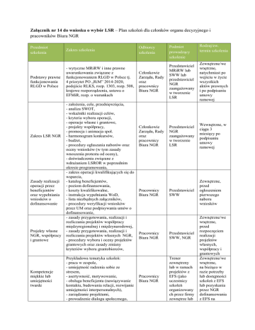 Załącznik nr 14 do wniosku o wybór LSR – Plan szkoleń dla członków organu decyzyjnego i pracowników Biura NGR Przedmiot szkolenia Zakres szkolenia Podstawy prawne funkcjonowania RLGD w Polsce - wytyczne MRiRW i inne prawne uwarunkowania związane z funkcjonowaniem RLGD w Polsce tj. 4 priorytet PO „RiM” 2014-2020, podejście RLKS, rozp. 1303, rozp. 508, krajowe rozporządzenia, ustawa o EFMiR, rozp. o warunkach Zakres LSR NGR Zasady realizacji operacji przez beneficjentów oraz wypełniania wniosków o dofinansowanie Projekty własne NGR, współpracy i grantowe Kompetencje miękkie lub umiejętności twarde - założenia, cele, przedsięwzięcia, - analiza SWOT, - wskaźniki realizacji celów, - kryteria wyboru operacji, - operacje własne i grantowe, - projekty współpracy, - promocja i animacja społ. - harmonogram konkursów, - budżet, - procedury ogłaszania naborów oraz oceny wniosków (w tym zasady wnoszenia protestu od oceny), - doświadczenia związane z wdrażaniem LSROR w poprzednim okresie programowania, - zakres operacji kwalifikujących się do wsparcia, - katalog beneficjentów, - poziom dofinansowania, - koszty kwalifikowalne, - instrukcja wypełniania WoD, - lista niezbędnych załączników, - procedury weryfikacji wniosków przez UM oraz podpisywania umów o dofinansowanie, - zasady przygotowania, realizacji i rozliczania projektów współpracy międzyregionalnej i międzynarodowej, - zasady przygotowania, realizacji i rozliczania projektów własnych NGR, - procedury wyboru i oceny projektów grantowych oraz zasady zmiany kryteriów wyboru grantobiorców, Przykładowa tematyka szkoleń: - praca w zespole, - umiejętność radzenia sobie ze stresem, - asertywność, motywowanie, - obsługa beneficjenta (nawiązywanie kontaktu, budowania relacji, rozwijanie umiejętności interpersonalnych), - zarządzanie projektami, - prowadzenie dialogu społecznego, Odbiorcy szkolenia Podmiot prowadzący szkolenie Rodzaj/ew. termin szkolenia Członkowie Zarządu, Rady oraz pracownicy Biura NGR Przedstawiciel MRiRW lub SWW lub przedstawiciel NGR zaangażowany w tworzenie LSR Zewnętrzne/we wnętrzne, natychmiast po wejściu w życie wszystkich aktów prawnych i po podpisaniu umowy ramowej Członkowie Zarządu, Rady oraz pracownicy Biura NGR Przedstawiciel NGR zaangażowany w tworzenie LSR Wewnętrzne, w ciągu 3 miesięcy po podpisaniu umowy ramowej Przedstawiciel SWW Zewnętrzne, przed ogłoszeniem pierwszego naboru wniosków Pracownicy Biura NGR Pracownicy Biura NGR Przedstawiciel SWW, NGR Pracownicy Biura NGR Trener zewnętrzny lub w ramach projektów z EFS (jako uczestnicy szkoleń organizowany ch przez firmy zewnętrze lub Zewnętrzne/we wnętrzne, przed rozpoczęciem realizacji projektów własnych, współpracy i grantowych Zewnętrzne/we wnętrzne, na bieżąco w razie potrzeby lub dostępności szkoleń z EFS lub pozyskania przez NGR dofinansowania z EFS na Podstawowe zagadnienia dotyczące akwakultury Możliwości i zasady uzyskania dofinansowania w ramach pozostałych priorytetów PO „RiM” (głównie prior. 2) Aspekty formalne prowadzenia działalności w sektorze akwakultury Praktyczne aspekty posiedzeń Rady oraz oceny wniosków Nowelizacja LSR, procedur wewnętrznych (ROR) lub przepisów prawa - języki obce, - podstawy prawne chowu i hodowli oraz przetwórstwa ryb, - zasady weterynaryjne i sanitarne, - podstawowe pojęcia, - technologie i rodzaje urządzeń i sprzęt, stosowane w chowie i hodowli ryb, - wyposażenie przetwórni, zasady przetwórstwa, - choroby ryb, - podstawy hodowli ryb w tym pstrąga i karpia, - certyfikacja produktów lokalnych w tym rybnych, - podstawy prawne, - zakres operacji kwalifikujących się do wsparcia, - katalog beneficjentów, - poziom dofinansowania, - koszty kwalifikowalne, - instrukcja wypełniania WoD, - lista niezbędnych załączników, - dokumenty weterynaryjne, - prowadzenie księgi stawowej i innych dokumentów, - sporządzanie RRW, - doradztwo koncepcyjne i technologiczne, - ogólne zasady funkcjonowania Rady, zgodnie z Regulaminem Organizacyjnym Rady, - parytety składu Rady, - zasady zwoływania, organizacji i prowadzenia posiedzeń Rady, - kryteria oceny wniosków w LSR, - procedury oceny wniosków, w tym wyłączenia z oceny operacji oraz sytuacje wyjątkowe, - odwołania od oceny – protest, - dokumentacja z posiedzeń, - aplikacja do elektronicznej oceny wniosków, - zasady wypłacania świadczeń członkom Rady, - zasada poufności i bezstronności, - rejestr interesów, - zasady ustalania kwoty wsparcia, - wzory dokumentów, Szkolenia przeprowadzone opcjonalnie, w sytuacji wystąpienia zmian w przepisach prawa lub w przypadku nowelizacji LSR lub procedur wewnętrznych, mających istotny wpływ na funkcjonowanie NGR przez NGR) szkolenie Pracownicy Biura NGR Przedstawiciel sektora rybackiego, ichtiolog lub doświadczony rybak Zewnętrzne/we wnętrzne, Cykl szkoleń Pracownicy Biura NGR Przedstawiciel ARiMR, szkolenia informacyjne organizowane przez ARiMR Zewnętrzne, cykl szkoleń, zgodnie z harmonograme m określonym przez ARiMR Pracownicy Biura NGR Przedstawiciel sektora rybackiego, ichtiolog lub doświadczony rybak Zewnętrzne/we wnętrzne I pół. 2017 Członkowie Rady NGR Przewodniczą cy Rady NGR lub przedstawiciel NGR Wewnętrzne, przed rozpoczęciem pierwszej oceny wniosków. Nowelizacja rozporządzeń, zmiana ROR lub kryteriów wyboru operacji – krótkie szkolenie na początku kolejnego posiedzenia. Członkowie Zarządu, Rady oraz pracownicy Biura NGR Przedstawiciel MRiRW lub SWW lub NGR Zewnętrzne/we wnętrzne, w razie potrzeby Rynek tradycyjnej żywności zasady tworzenia produktów turystycznych i lokalnych (opcjonalnie) Identyfikacja i ochrona produktów regionalnych i tradycyjnych: - promocja produktów regionalnych i tradycyjnych, - przykłady produktów regionalnych i tradycyjnych, - rejestracja produktów lokalnych na poziomie kraju, - lista produktów tradycyjnych i regionalnych, 