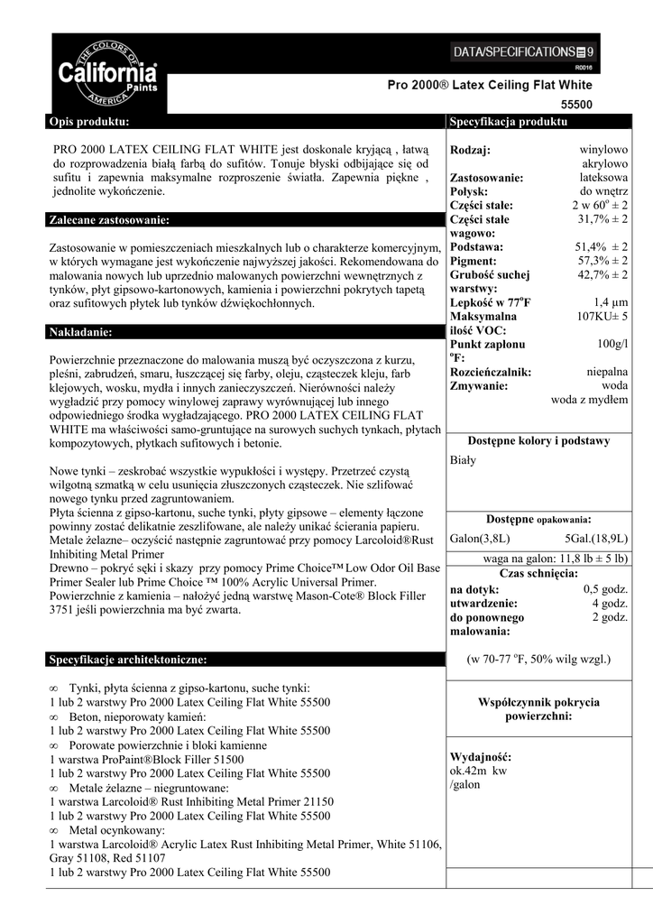 Opis produktu: PRO 2000 LATEX CEILING FLAT WHITE jest doskonale kryjącą , łatwą do rozprowadzenia białą farbą do sufitów. Tonuje błyski odbijające się od sufitu i zapewnia maksymalne rozproszenie światła. Zapewnia piękne , jednolite wykończenie. Specyfikacja produktu Rodzaj: winylowo akrylowo lateksowa do wnętrz 2 w 60o ± 2 31,7% ± 2 Zastosowanie: Połysk: Części stałe: Części stałe Zalecane zastosowanie: wagowo: 51,4% ± 2 Zastosowanie w pomieszczeniach mieszkalnych lub o charakterze komercyjnym, Podstawa: 57,3% ± 2 w których wymagane jest wykończenie najwyŜszej jakości. Rekomendowana do Pigment: 42,7% ± 2 Grubość suchej malowania nowych lub uprzednio malowanych powierzchni wewnętrznych z warstwy: tynków, płyt gipsowo-kartonowych, kamienia i powierzchni pokrytych tapetą 1,4 µm Lepkość w 77oF oraz sufitowych płytek lub tynków dźwiękochłonnych. 107KU± 5 Maksymalna ilość VOC: Nakładanie: 100g/l Punkt zapłonu o F: Powierzchnie przeznaczone do malowania muszą być oczyszczona z kurzu, niepalna Rozcieńczalnik: pleśni, zabrudzeń, smaru, łuszczącej się farby, oleju, cząsteczek kleju, farb woda Zmywanie: klejowych, wosku, mydła i innych zanieczyszczeń. Nierówności naleŜy woda z mydłem wygładzić przy pomocy winylowej zaprawy wyrównującej lub innego odpowiedniego środka wygładzającego. PRO 2000 LATEX CEILING FLAT WHITE ma właściwości samo-gruntujące na surowych suchych tynkach, płytach Dostępne kolory i podstawy kompozytowych, płytkach sufitowych i betonie. Biały Nowe tynki – zeskrobać wszystkie wypukłości i występy. Przetrzeć czystą wilgotną szmatką w celu usunięcia złuszczonych cząsteczek. Nie szlifować nowego tynku przed zagruntowaniem. Płyta ścienna z gipso-kartonu, suche tynki, płyty gipsowe – elementy łączone Dostępne opakowania: powinny zostać delikatnie zeszlifowane, ale naleŜy unikać ścierania papieru. 5Gal.(18,9L) Metale Ŝelazne– oczyścić następnie zagruntować przy pomocy Larcoloid®Rust Galon(3,8L) Inhibiting Metal Primer waga na galon: 11,8 lb ± 5 lb) Drewno – pokryć sęki i skazy przy pomocy Prime Choice™ Low Odor Oil Base Czas schnięcia: Primer Sealer lub Prime Choice ™ 100% Acrylic Universal Primer. 0,5 godz. na dotyk: Powierzchnie z kamienia – nałoŜyć jedną warstwę Mason-Cote® Block Filler 4 godz. utwardzenie: 3751 jeśli powierzchnia ma być zwarta. 2 godz. do ponownego malowania: Specyfikacje architektoniczne: (w 70-77 oF, 50% wilg wzgl.) • Tynki, płyta ścienna z gipso-kartonu, suche tynki: Współczynnik pokrycia 1 lub 2 warstwy Pro 2000 Latex Ceiling Flat White 55500 powierzchni: • Beton, nieporowaty kamień: 1 lub 2 warstwy Pro 2000 Latex Ceiling Flat White 55500 • Porowate powierzchnie i bloki kamienne Wydajność: 1 warstwa ProPaint®Block Filler 51500 ok.42m kw 1 lub 2 warstwy Pro 2000 Latex Ceiling Flat White 55500 /galon • Metale Ŝelazne – niegruntowane: 1 warstwa Larcoloid® Rust Inhibiting Metal Primer 21150 1 lub 2 warstwy Pro 2000 Latex Ceiling Flat White 55500 • Metal ocynkowany: 1 warstwa Larcoloid® Acrylic Latex Rust Inhibiting Metal Primer, White 51106, Gray 51108, Red 51107 1 lub 2 warstwy Pro 2000 Latex Ceiling Flat White 55500 • Drewno: 1 warstwa Prime Choice™ All Surface Acrylic Primer 50300 1 lub 2 warstwy Pro 2000 Latex Ceiling Flat White 55500 • Płytki dźwiękochłonne: 1 lub 2 warstwy Pro 2000 Latex Ceiling Flat White 55500 Pędzelsyntetyczny, nylonowy lub poliestrowy Środki ostroŜności: Wałek38/” meszek z syntetycznych włókien Nie dodawać rozpuszczalników, olejów ani barwników w oleju, ani teŜ nie mieszać z innymi rodzajami farb. Nie stosować gdy temperatura powietrza lub malowanej powierzchni spada poniŜej 10°C (50°F) ani przy kiepskich warunkach do wysychania. Zapobiegać zamarznięciu. Stosować właściwą wentylację Natryskiwanie bezpowietrznekońcówka 0,017 do 0,019 Informacje dotyczące bezpieczeństwa: Trzymać poza zasięgiem dzieci. Nie spoŜywać. Zamykać pojemnik po kaŜdym uŜyciu. California Paints · 150 Dascomb Rd. · Andover, MA · 01810 · www.californiapaints.com · 800-225-1141