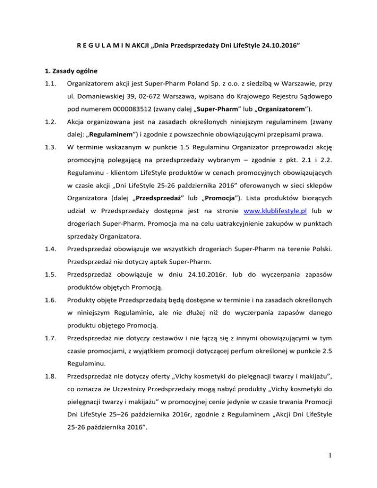 R E G U L A M I N AKCJI „Dnia Przedsprzedaży Dni LifeStyle 24.10.2016” 1. Zasady ogólne 1.1. Organizatorem akcji jest Super-Pharm Poland Sp. z o.o. z siedzibą w Warszawie, przy ul. Domaniewskiej 39, 02-672 Warszawa, wpisana do Krajowego Rejestru Sądowego pod numerem 0000083512 (zwany dalej „Super-Pharm” lub „Organizatorem”). 1.2. Akcja organizowana jest na zasadach określonych niniejszym regulaminem (zwany dalej: „Regulaminem”) i zgodnie z powszechnie obowiązującymi przepisami prawa. 1.3. W terminie wskazanym w punkcie 1.5 Regulaminu Organizator przeprowadzi akcję promocyjną polegającą na przedsprzedaży wybranym – zgodnie z pkt. 2.1 i 2.2. Regulaminu - klientom LifeStyle produktów w cenach promocyjnych obowiązujących w czasie akcji „Dni LifeStyle 25-26 października 2016” oferowanych w sieci sklepów Organizatora (dalej „Przedsprzedaż” lub „Promocja”). Lista produktów biorących udział w Przedsprzedaży dostępna jest na stronie www.klublifestyle.pl lub w drogeriach Super-Pharm. Promocja ma na celu uatrakcyjnienie zakupów w punktach sprzedaży Organizatora. 1.4. Przedsprzedaż obowiązuje we wszystkich drogeriach Super-Pharm na terenie Polski. Przedsprzedaż nie dotyczy aptek Super-Pharm. 1.5. Przedsprzedaż obowiązuje w dniu 24.10.2016r. lub do wyczerpania zapasów produktów objętych Promocją. 1.6. Produkty objęte Przedsprzedażą będą dostępne w terminie i na zasadach określonych w niniejszym Regulaminie, ale nie dłużej niż do wyczerpania zapasów danego produktu objętego Promocją. 1.7. Przedsprzedaż nie dotyczy zestawów i nie łączą się z innymi obowiązującymi w tym czasie promocjami, z wyjątkiem promocji dotyczącej perfum określonej w punkcie 2.5 Regulaminu. 1.8. Przedsprzedaż nie dotyczy oferty „Vichy kosmetyki do pielęgnacji twarzy i makijażu”, co oznacza że Uczestnicy Przedsprzedaży mogą nabyć produkty „Vichy kosmetyki do pielęgnacji twarzy i makijażu” w promocyjnej cenie jedynie w czasie trwania Promocji Dni LifeStyle 25–26 października 2016r, zgodnie z Regulaminem „Akcji Dni LifeStyle 25-26 października 2016”. 1 2. Warunki Promocji 2.1. Udział w Przedsprzedaży mogą wziąć wyłącznie wybrane osoby wskazane przez Super-Pharm będące członkami Klubu LifeStyle (dalej „Uczestnik Przedsprzedaży”), o czym zostaną poinformowani. 2.2. Super-Pharm zastrzega sobie wybór Uczestników Przedsprzedaży do udziału w Przedsprzedaży według własnych kryteriów i nie jest związany żadnymi zgłoszeniami chęci uczestnictwa w Promocji, jak również nie jest zobowiązany do ujawniania lub uzasadniania kryteriów wyboru Uczestników Przedsprzedaży do udziału w Promocji. 2.3. Warunkiem skorzystania przez Uczestników Przedsprzedaży z oferty objętej Przedsprzedażą jest okazanie smsa z zaproszeniem na Przedsprzedaż otrzymanego od Super-Pharm z nazwą w polu nadawcy „Super Pharm” oraz aktywnej karty LifeStyle lub podanie numeru PESEL w kasie przed rozpoczęciem skanowania produktów przez kasjera. 2.4. Rabat na produkty objęte Przedsprzedażą naliczany jest od cen regularnych, z wyjątkiem promocji dotyczącej perfum, gdzie rabat naliczany jest od cen promocyjnych. 2.5. W odniesieniu do promocji „Drugie perfumy -60%”, Uczestnik Przedsprzedaży ma prawo do nabycia drugiego tańszego lub w tej samej cenie flakonu perfum objętego promocją z rabatem -60%. Rabat 60% naliczany jest od aktualnie obowiązujących cen promocyjnych. Promocja nie dotyczy perfum w wyprzedaży 1+1 za grosz, oznaczonych naklejką z serduszkiem oraz gotowych zestawów. 2.6. Jednocześnie w ramach sprzedaży promocyjnej perfum wskazanej w punkcie 2.5, limit zakupowy produktów objętych promocją „Drugie perfumy -60%” wynosi 5 sztuk perfum, co oznacza, że Uczestnik Przedsprzedaży może kupić w ramach powyższego limitu maksymalnie 2 sztuki perfum tańszych lub w tej samej cenie z rabatem w wysokości 60% w łącznym okresie obowiązywania Przedsprzedaży i Promocji „Dni LifeStyle 25-26 października 2016”. 2.7. Z zastrzeżeniem odmiennych postanowień określonych w punkcie 2.6 i 2.9, limit zakupowy produktów objętych Przedsprzedaż z każdego modułu promocyjnego wskazanego w Załączniku nr 1, przypadający na jednego Uczestnika Przedsprzedaży (kartę LifeStyle), wynosi nie więcej niż po 5 sztuk produktów lub w przypadku 2 promocji „1+1 za grosz” po 5 zestawów promocyjnych, przez łączny okres obowiązywania Przedsprzedaży i Promocji „Dni LifeStyle 25-26 października 2016”. 2.8. Limit zakupowy jest ustawiony automatycznie i obowiązuje przez łączny okres Przedsprzedaży i Promocji „Dni LifeStyle 25-26 października 2016”, niezależnie od miejsca i czasu dokonania zakupów oraz ilości transakcji dokonanych przez Uczestnika Przedsprzedaży w trakcie obowiązywania Przedsprzedaży i Promocji „Dni LifeStyle 2526 października 2016”, co oznacza, że łącznie w okresie Przedsprzedaży i Promocji „Dni LifeStyle 25-26 października 2016” Uczestnik Przedsprzedaży może kupić maksymalnie 5 sztuk produktów lub w przypadku promocji „1+1 za grosz” po 5 zestawów promocyjnych. W przypadku zakupienia większej ilości niż 5 sztuk produktów objętych Promocją na kolejne produkty zostanie naliczona cena regularna. 2.9. W okresie obowiązywania Przedsprzedaży, Uczestnik Przedsprzedaży ma możliwość zakupu jednego produktu „LIFE AA baterie alkaliczne 8 szt.” w promocyjnej cenie 4,99 PLN, pod warunkiem dokonania w okresie obowiązywania Przedsprzedaży zakupów za min. 49zł na jednym paragonie (paragony nie ulegają sumowaniu). Przy wielokrotności zakupu produktów za min. 49zł – możliwy jest zakup kolejnych produktów „LIFE AA baterie alkaliczne 8 szt.” za 4,99 zł, z uwzględnieniem minimalnej wartość zakupów dla jednego produktu „LIFE AA baterie alkaliczne 8 szt.” za 4,99 zł. 2.10. Lista produktów objętych Przedsprzedażą stanowi Zał