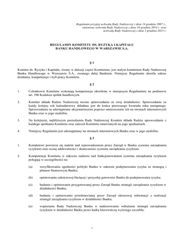 Regulamin przyjęty uchwałą Rady Nadzorczej z dnia 14 grudnia 2007 r., zmieniony uchwałą Rady Nadzorczej z dnia 18 grudnia 2014 r. oraz uchwałą Rady Nadzorczej z dnia 3 grudnia 2015 r. REGULAMIN KOMITETU DS. RYZYKA I KAPITAŁU BANKU HANDLOWEGO W WARSZAWIE S.A. §1 Komitet ds. Ryzyka i Kapitału, zwany w dalszej części Komitetem, jest stałym komitetem Rady Nadzorczej Banku Handlowego w Warszawie S.A., zwanego dalej Bankiem. Niniejszy Regulamin określa zakres działania, kompetencje i tryb pracy Komitetu. §2 1. Członkowie Komitetu wykonują kompetencje określone w niniejszym Regulaminie na podstawie art. 390 Kodeksu spółek handlowych. 2. Komitet składa Radzie Nadzorczej roczne sprawozdania ze swej działalności. Sprawozdanie za każdy kolejny rok kalendarzowy składane jest do końca pierwszego kwartału roku następnego. Sprawozdania są udostępniane akcjonariuszom poprzez umieszczenie ich na stronach internetowych Banku oraz w jego siedzibie. 3. Na kolejnym, najbliższym posiedzeniu Rady Nadzorczej Komitet składa Radzie sprawozdanie z każdego spotkania Komitetu oraz zaleceń Komitetu omawianych na jego spotkaniach. 4. Niniejszy Regulamin jest udostępniany na stronach internetowych Banku oraz w jego siedzibie. §3 1. Komitetowi powierza się nadzór nad wprowadzeniem przez Zarząd w Banku systemu zarządzania ryzykiem oraz ocenę adekwatności i skuteczności systemu zarządzania ryzykiem. 2. Kompetencje Komitetu w zakresie nadzoru nad funkcjonowaniem systemu zarządzania ryzykiem polegają w szczególności na: (a) weryfikowaniu zgodności polityki Banku w zakresie podejmowania ryzyka ze strategią i planem finansowym Banku; (b) opiniowaniu całościowej bieżącej i przyszłej gotowości Banku do podejmowania ryzyka; (c) badaniu i opiniowaniu przygotowanej przez Zarząd Banku strategii zarządzania ryzykiem w działalności Banku; (d) badaniu i opiniowaniu przedstawianej przez Zarząd okresowej informacji z realizacji strategii zarządzania ryzykiem w działalności Banku; (e) wspieraniu Rady Nadzorczej Banku w nadzorowaniu wdrażania strategii zarządzania ryzykiem w działalności Banku przez kadrę kierowniczą wyższego szczebla; 1 3. 4. (f) weryfikowaniu, czy ceny pasywów i aktywów oferowanych klientom w pełni uwzględniają model biznesowy Banku i jego strategię w zakresie ryzyka, a w przypadku, gdy ceny nie odzwierciedlają w odpowiedni sposób rodzajów ryzyka zgodnie z modelem biznesowym i strategią w zakresie ryzyka, przedstawianiu Zarządowi Banku propozycji mających na celu zapewnienie adekwatności cen pasywów i aktywów do tych rodzajów ryzyka; (g) wyrażaniu zgody na zatrudnienie i zwalnianie, przeprowadzaniu rozmów oceniających oraz ustalaniu wynagrodzenia Szefa Zespołu Fundamentalnej Oceny Ryzyka Kredytowego, na podstawie rekomendacji Szefa Sektora Zarządzania Ryzykiem; oraz (h) kwartalnym przeglądzie Raportów Zespołu Fundamentalnej Oceny Ryzyka Kredytowego. Kompetencje Komitetu w zakresie wskazanym w ustępie 2 powyżej będą realizowane na podstawie dokumentów i informacji przedstawionych przez Zarząd Banku i obejmujących w szczególności: (a) Zasady Zarządzania Ryzykiem w Banku; (b) Ogólny Poziom Ryzyka Banku; (c) Okresowe raporty zgodności z progami i limitami określonymi w Ogólnym Poziomie Ryzyka Banku; (d) Okresowe informacje z realizacji strategii zarządzania ryzykiem w działalności Banku, w tym przedstawiające rodzaje i wielkość ryzyka w działalności Banku; oraz; (e) Sprawozdania w sprawie zarządzania w Banku ryzykiem braku zgodności. Komitetowi powierza się nadzór nad procesem szacowania kapitału wewnętrznego i zarządzania kapitałowego. Kompetencje Komitetu w zakresie nadzoru nad funkcjonowaniem procesów szacowania kapitału wewnętrznego, zarządzania kapitałowego i planowania kapitałowego polegają na badaniu, zatwierdzaniu lub rekomendowaniu, w zakresie wymagającym uchwały Rady Nadzorczej do zatwierdzania polityk i procedur dotyczących procesu szacowania kapitału wewnętrznego, zarządzania kapitałowego oraz planowania kapitałowego. §4 1. W skład Komitetu wchodzi co najmniej czterech członków Rady Nadzorczej, z których jeden jest Przewodniczącym Komitetu. 2. Członkowie Komitetu, w tym jego Przewodniczący i Zastępca Przewodniczącego, wybierani są przez Radę Nadzorczą. 3. Aby uchwały Komitetu były ważne, w spotkaniu musi uczestniczyć co najmniej trzech jego członków. §5 1. Posiedzenia Komitetu zwołuje Przewodniczący Komitetu z własnej inicjatywy lub na wniosek członka Komitetu. Gdyby Przewodniczący Komitetu nie mógł z jakichkolwiek przyczyn zwołać posiedzenia, zwołuje je Zastępca Przewodniczącego. Posiedzenia zwoływane są też na wniosek Przewodniczącego Rady Nadzorczej. 2. Posiedzenia Komitetu odbywają się co najmniej raz na pół roku w terminach ustalonych przez Przewodniczącego Komitetu w porozumieniu z Zastępcą Przewodniczącego Komitetu. 2 3. Zawiadomienie o zwołaniu posiedzenia, zawierające porządek obrad i materiały będące przedmiotem obrad przesyła członkom Komitetu Sekretarz Komitetu, którym jest Sekretarz Rady Nadzorczej. Zawiadomienie powinno zawierać porządek obrad oraz materiały dotyczące tematów omawianych na posiedzeniu. §6 1. Porządek obrad Komitetu obejmuje punkty stałe oraz sprawy rozpatrywane na wniosek. 2. Lista stałych punktów rozpatrywanych na posiedzeniach Komitetu ustalana jest w drodze uchwały Komitetu. 3. Prawo wnoszenia spraw na posiedzenia Komitetu przysługuje Radzie Nadzorczej oraz poszczególnym członkom Komitetu i pozostałym członkom Rady Nadzorczej. §7 1. Sekretarz Komitetu, na podstawie otrzymanych materiałów opracowuje projekt porządku posiedzenia wraz z listą osób zaproszonych i przekazuje go Przewodniczącemu Komitetu i Zastępcy Przewodniczącego do akceptacji. 2. Zaakceptowany przez Przewodniczącego Komitetu i Zastępcę Przewodniczącego projekt porządku posiedzenia przekazywany j
