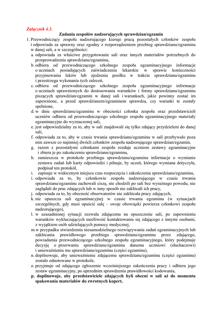 Załącznik 4.3. Zadania zespołów nadzorujących sprawdzian/egzamin 1. Przewodniczący zespołu nadzorującego kieruje pracą pozostałych członków zespołu i odpowiada za sprawny oraz zgodny z rozporządzeniem przebieg sprawdzianu/egzaminu w danej sali, a w szczególności: a. odpowiada za właściwe przygotowanie sali oraz innych materiałów potrzebnych do przeprowadzenia sprawdzianu/egzaminu, b. odbiera od przewodniczącego szkolnego zespołu egzaminacyjnego informacje o uczniach posiadających zaświadczenia lekarskie w sprawie konieczności przyjmowania leków lub zjedzenia posiłku w trakcie sprawdzianu/egzaminu i przestrzega wykonania tych zaleceń, c. odbiera od przewodniczącego szkolnego zespołu egzaminacyjnego informacje o uczniach uprawnionych do dostosowania warunków i formy sprawdzianu/egzaminu piszących sprawdzian/egzamin w danej sali i warunkach, jakie powinny zostać im zapewnione, a przed sprawdzianem/egzaminem sprawdza, czy warunki te zostały spełnione, d. w dniu sprawdzianu/egzaminu w obecności członka zespołu oraz przedstawicieli uczniów odbiera od przewodniczącego szkolnego zespołu egzaminacyjnego materiały egzaminacyjne do wyznaczonej sali, e. jest odpowiedzialny za to, aby w sali znajdowali się tylko zdający przydzieleni do danej sali, f. odpowiada za to, aby w czasie trwania sprawdzianu/egzaminu w sali przebywało poza nim zawsze co najmniej dwóch członków zespołu nadzorującego sprawdzian/egzamin, g. razem z pozostałymi członkami zespołu rozdaje uczniom zestawy egzaminacyjne i zbiera je po zakończeniu sprawdzianu/egzaminu, h. zamieszcza w protokole przebiegu sprawdzianu/egzaminu informacje o wymianie zestawu zadań lub karty odpowiedzi i pilnuje, by uczeń, którego wymiana dotyczyła, podpisał ten protokół, i. zapisuje w widocznym miejscu czas rozpoczęcia i zakończenia sprawdzianu/egzaminu, i. odpowiada za to, by członkowie zespołu nadzorującego w czasie trwania sprawdzianu/egzaminu zachowali ciszę, nie chodzili po sali bez wyraźnego powodu, nie zaglądali do prac zdających lub w inny sposób nie zakłócali ich pracy, j. odpowiada za to, by obecność obserwatorów nie zakłócała pracy zdających, k. nie opuszcza sali egzaminacyjnej w czasie trwania egzaminu (w sytuacjach szczególnych, gdy musi opuścić salę – swoje obowiązki powierza członkowi zespołu nadzorującego), l. w uzasadnionej sytuacji zezwala zdającemu na opuszczenie sali, po zapewnieniu warunków wykluczających możliwość kontaktowania się zdającego z innymi osobami, z wyjątkiem osób udzielających pomocy medycznej, m.w przypadku stwierdzenia niesamodzielnego rozwiązywania zadań egzaminacyjnych lub zakłócania prawidłowego przebiegu sprawdzianu/egzaminu przez zdającego, powiadamia przewodniczącego szkolnego zespołu egzaminacyjnego, który podejmuje decyzję o przerwaniu sprawdzianu/egzaminu danemu uczniowi (słuchaczowi) i unieważnieniu mu sprawdzianu/egzaminu (części egzaminu), n. dopilnowuje, aby unieważnienie zdającemu sprawdzianu/egzaminu (części egzaminu) zostało odnotowane w protokole, o. przyjmuje od zdającego zgłoszenie wcześniejszego zakończenia pracy i odbiera jego zestaw egzaminacyjny, po uprzednim sprawdzeniu prawidłowości kodowania, p. dopilnowuje, aby przedstawiciele zdających byli obecni w sali aż do momentu spakowania materiałów do zwrotnych kopert, q. razem z pozostałymi członkami zespołu przykleja kartki z kodami kreskowymi w odpowiednich miejscach zestawów egzaminacyjnych, wypełnia odpowiednie matryce znaków na kartach odpowiedzi, porządkuje i pakuje wypełnione zestawy według zaleceń właściwej okręgowej komisji egzaminacyjnej, r. dopilnowuje, aby lista uczniów i protokół przeprowadzenia sprawdzianu/egzaminu zostały dokładnie wypełnione i podpisane przez wszystkich członków zespołu nadzorującego i obserwatorów, s. po zakończeniu sprawdzianu/egzaminu, uzupełnieniu kodowania prac uczniów, przekazuje przewodniczącemu szkolnego zespołu egzaminacyjnego spakowane zestawy egzaminacyjne i dokumentację, t. razem z przewodniczącym szkolnego zespołu egzaminacyjnego pakuje zestawy egzaminacyjne i opisuje zgodnie z instrukcją OKE. 2. Członkowie zespołu nadzorującego sprawdzian/egzamin w danej sali współpracują z przewodniczącym, a w szczególności: a. przygotowują odpowiednio salę do sprawdzianu/egzaminu, zapewniając: • prawidłowe ustawienie stolików (podczas sprawdzianu/egzaminu każdy uczeń pracuje przy osobnym stoliku, stoliki ustawione są w jednym kierunku, w odległości zapewniającej samodzielność pracy zdających), • właściwą liczbę krzeseł, • zegar widoczny dla wszystkich zdających, • tablicę (planszę) do zapisania godziny rozpoczęcia i zakończenia sprawdzianu/egzaminu, • kartki z imieniem, nazwiskiem, trzyznakowym kodem ucznia (słuchacza) i jego datą urodzenia, • zapasowe przybory piśmienne, b. dopilnowują, aby uczniowie (słuchacze) przed rozpoczęciem rozwiązywania zadań sprawdzili kompletność zestawów egzaminacyjnych; w razie potrzeby wymieniają materiały na kompletne lub za zgodą przewodniczącego szkolnego zespołu egzaminacyjnego wykonują kopie brakujących stron/zestawów, c. odpowiadają za umieszczenie przez zdających ich trzyznakowych kodów i dat urodzenia we wszystkich przeznaczonych na to miejscach, a w przypadku uczniów korzystających z dostosowania warunków i formy egzaminu umieszczają je sami d. odpowiadają za to, by zdający pracowali samodzielnie i nie zakłócali pracy innym uczniom (słuchaczom) oraz nie używali korektorów, kalkulatorów oraz innych niedozwolonych na sprawdzianie/egzaminie przyborów, e. zgłaszają przewodniczącemu zespołu nadzorującego przypadki niesamodzielnej pracy zdającego lub zakłócania przebiegu sprawdzianu/egzaminu, f. nie udzielają zdającym żadnych wyjaśnień dotyczących zadań egzaminacyjnych ani ich nie komentują, g. nie opuszczają sali egzaminacyjnej 
