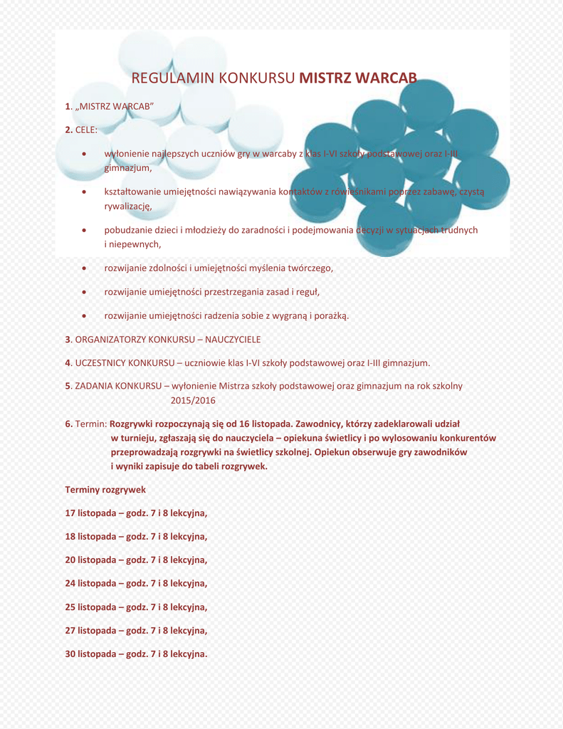 REGULAMIN KONKURSU MISTRZ WARCAB 1. „MISTRZ WARCAB” 2. CELE: wyłonienie najlepszych uczniów gry w warcaby z klas I-VI szkoły podstawowej oraz I-III gimnazjum, kształtowanie umiejętności nawiązywania kontaktów z rówieśnikami poprzez zabawę, czystą rywalizację, pobudzanie dzieci i młodzieży do zaradności i podejmowania decyzji w sytuacjach trudnych i niepewnych, rozwijanie zdolności i umiejętności myślenia twórczego, rozwijanie umiejętności przestrzegania zasad i reguł, rozwijanie umiejętności radzenia sobie z wygraną i porażką. 3. ORGANIZATORZY KONKURSU – NAUCZYCIELE 4. UCZESTNICY KONKURSU – uczniowie klas I-VI szkoły podstawowej oraz I-III gimnazjum. 5. ZADANIA KONKURSU – wyłonienie Mistrza szkoły podstawowej oraz gimnazjum na rok szkolny 2015/2016 6. Termin: Rozgrywki rozpoczynają się od 16 listopada. Zawodnicy, którzy zadeklarowali udział w turnieju, zgłaszają się do nauczyciela – opiekuna świetlicy i po wylosowaniu konkurentów przeprowadzają rozgrywki na świetlicy szkolnej. Opiekun obserwuje gry zawodników i wyniki zapisuje do tabeli rozgrywek. Terminy rozgrywek 17 listopada – godz. 7 i 8 lekcyjna, 18 listopada – godz. 7 i 8 lekcyjna, 20 listopada – godz. 7 i 8 lekcyjna, 24 listopada – godz. 7 i 8 lekcyjna, 25 listopada – godz. 7 i 8 lekcyjna, 27 listopada – godz. 7 i 8 lekcyjna, 30 listopada – godz. 7 i 8 lekcyjna. 7. KRYTERIA OCENY: 1. a) Gra w warcaby toczy się pomiędzy dwoma osobami nazywanymi warcabistami. Zawodnicy grają systemem par (dobór losowy), zwycięzca przechodzi do dalszego pojedynku. b) Gra się 12 pionkami na czarnych polach, ustawia się je w 3 rzędach, 2 rzędy pól na środku planszy pozostają wolne. c) Zaczyna gracz z białymi pionkami. d) Gracze wykonują kolejno po jednym ruchu, na przemian, własnymi pionkami. e) W jednym ruchu dowolnie wybrany pionek może zostać przesunięty o jedno pole naprzód po przekątnej (na ukos). Nie wolno wchodzić na białe pola ani na pola zajmowane przez inne pionki. f) Bicie pionków przeciwnika odbywa się przez przeskoczenie przez bity pionek na następne pole za nim, o ile jest ono wolne. Jeżeli pionek, po przeskoczeniu pionka przeciwnika, ma możliwość bicia następnego pionka, to musi je wykonać. g) Bicie jest obowiązkowe i ma pierwszeństwo przed wykonaniem innego ruchu (zasada przymusu bicia). W przeciwnym razie traci się pionka. h) Zbicie może być wykonywane do przodu lub do tyłu. i) Gdy pionek dojdzie do ostatniego rzędu szachownicy, zmienia się w damkę. j) Pionek, który został damką jest odwrócony i w ten sposób porusza się po polach. k) Damka porusza się po przekątnych (ciemnych polach) we wszystkich kierunkach (do przodu i do tyłu) na dowolnie wybrane pole. l) W przypadku, gdy istnieje wybór pomiędzy zbiciem różnych ilości pionków przeciwnika, to obowiązkiem jest bicie większej ilości (zasada bicia większości). Przy czym damka nie ma obowiązku pierwszeństwa wykonania bicia. m) Gra jest przegrana, gdy gracz stracił wszystkie pionki lub nie ma możliwości wykonania ruchu, ponieważ jego warcaby zostały zablokowane. 2. W Turnieju Warcabowym bierze udział dowolna ilość uczestników. 3. Wynik wpisywany jest do tabeli rozgrywek (zwycięstwo - 1 pkt, remis - 0,5 pkt, porażka - 0 pkt) 4. Za niestosowne zachowania, tzn. niesamodzielne rozgrywanie partii, przeszkadzanie innym lub inne zachowania budzące zastrzeżenia organizatora, uczestnik może zostać wykluczony z Turnieju. 5. Obowiązuje zasada „dotknięta idzie, postawiona stoi”. 8. Zgłoszenia prowadzone są do 13 listopada 2015 r. u wychowawców świetlicy 9. KALENDARZ KONKURSU: Rozpoczęcie rozgrywek 16.11.2015 r., zakończenie 3.12.2015 r.