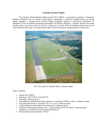 Lotnisko Kamień Śląski Port lotniczy Opole-Kamień Śląski (kod ICAO: EPKN) - powojskowe lotnisko w Kamieniu Śląskim, położone jest na terenie województwa opolskiego w powiecie krapkowickim na terenie gminy Gogolin, w miejscowości Kamień Śląski, pomiędzy Opolem a Strzelcami Opolskimi. W odległości 8 km od lotniska przebiega autostrada A4 (Drezno–Kraków). Lotnisko obecnie ma status innego miejsca przeznaczonego do startów i lądowań, a od roku 2010 na lotnisku użytkowane jest na cele szkolenia lotniczego oraz organizacji imprez motoryzacyjnych, integracyjnych i masowych. Rys. Pas startowy lotniska Opole- Kamień śląski Dane o lotnisku: • • • • • • • • Kod ICAO: EPKN Położenie: 50°31'45"N, 018°05'07"E Elewacja: 208 m (n.p.m.) Utwardzona (asfaltobeton) droga startowa o wymiarach 2300 m x 60 m w dobrym stanie Sieć dróg kołowania o szerokości 30, 14 i 12 m w dobrym stanie 3 płyty postojowe dla statków powietrznych w dobrym stanie Nośność nawierzchni lotniskowych - wg klasyfikacji PCN 19 F/B/X/T (nawierzchnie asfaltowe) i 22 R/B/X/T (nawierzchnie betonowe) Powierzchnia terenu lotniska: 285 ha