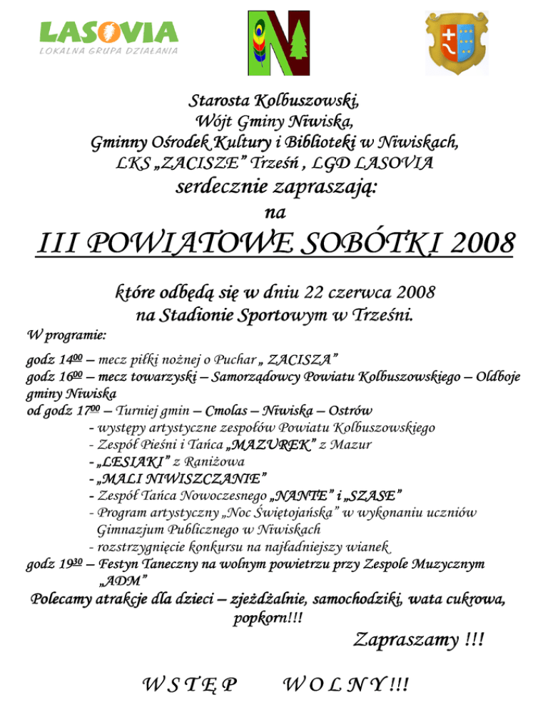 Starosta Kolbuszowski, Wójt Gminy Niwiska, Gminny Ośrodek Kultury i Biblioteki w Niwiskach, Niwiskach, LKS „ZACISZE” Trześń , LGD LGD LASOVIA serdecznie zapraszają: zapraszają: na III POWIATOWE SOBÓTKI 2008 które odbędą się w dniu 22 czerwca czerwca 2008 na Stadionie Sportowym w Trześni. W programie: godz 1400 – mecz piłki noŜnej o Puchar „ ZACISZA” godz 1600 – mecz towarzyski – Samorządowcy Samorządowcy Powiatu Kolbuszowskiego – Oldboje gminy Niwiska Niwiska od godz 1700 – Turniej gmin – Cmolas – Niwiska – Ostrów - występy artystyczne zespołów Powiatu Kolbuszowskiego - Zespół Pieśni i Tańca „MAZUREK” z Mazur - „LESIAKI” z RaniŜowa - „MALI NIWISZCZANIE” - Zespół Tańca Nowoczesnego „NANTE” NANTE” i „SZASE” SZASE” - Program artystyczny „Noc Świętojańska” w wykonaniu uczniów Gimnazjum Publicznego w Niwiskach - rozstrzygnięcie konkursu na najładniejszy wianek godz godz 1930 – Festyn Taneczny na wolnym powietrzu przy Zespole Muzycznym „ADM „ADM” DM” Polecamy atrakcje dla dzieci – zjeŜdŜalnie, zjeŜdŜalnie, samochodziki, wata cukrowa, popkorn!!! popkorn!!! Zapraszamy !!! WSTĘP W O L N Y !!!