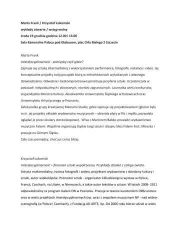 Marta Frank / Krzysztof Łukomski wykłady otwarte / wstęp wolny środa 19 grudnia godzina 12.00 i 13.00 Sala Kameralna Pałacu pod Globusem, plac Orła Białego 2 Szczecin Marta Frank Interdyscyplinarność -‐ pomiędzy czyli gdzie? Zajmuje się sztuką intermedialną z wykorzystaniem performance, fotografii, instalacji i video. Jej konceptualne projekty swój początek biorą w mikrohistoriach wyłuskanych z własnego doświadczenia. Odważnie i bezkompromisowo penetruje peryferia sztuki. Uczestniczyła w pokazach indywidualnych i zbiorowych, również zagranicznych. Laureatka wielu konkursów, stypendystka Ministra Kultury. Absolwentka Uniwersytetu Śląskiego w Katowicach oraz Uniwersytetu Artystycznego w Poznaniu. Założycielka grupy kreatywnej Mamami Studio, gdzie zajmuje się projektowaniem (głośne były m.in. jej projekty okładek wydawnictw muzycznych – ubierała płyty w filc i mydło, pozwalała oglądać je przez okulary stereoskopowe). Wraz z Marcinem Babko prowadzi wydawnictwo muzyczne Falami. Wspólnie organizują śląskie targi sztuki i dizajnu Silos Falami Fest. Mieszka i pracuje na Górnym Śląsku. Cały czas pomiędzy, choć już coraz bliżej. Krzysztof Łukomski Interdyscyplinarność = fenomen sztuki współczesnej. Przykłady działań z całego świata. Artysta multimedialny, twórca fotografii i wideo, projektant wydawnictw z dziedziny kultury i sztuki, autor wideoklipów. Promotor sztuki -‐ organizator kilkudziesięciu wystaw w Polsce, Francji, Czechach, na Litwie, w Niemczech, a także autor tekstów o sztuce. W latach 2008-‐ 2011 odpowiedzialny za program Galerii ON w Poznaniu. Pracuje w teamie kuratorskim OBScurators oraz w wielu projektach interdyscyplinarnych (np. wraz z zespołem muzycznym NP -‐ nad wideo-‐ scenografią (w Polsce i Czechach), z Fundacją AD ARTE, itp. Od 2006 roku bierze udział w wielu multi-‐dyscyplinarnych projektach jako kurator i dyrektor kreatywny. Od 2009-‐2011 r był Prezesem Fundacji ASP w Poznaniu. Studia w ASP w Poznaniu w latach 1999-‐2005. W roku 2004 stypendium naukowe w ENBA Lyon, Francja. Dyplom w ASP w Poznaniu w 2 zakresach: Krytyki i Promocji Sztuki oraz Intermediów. Obecnie asystent w Pracowni Działań Intermedialnych i Fotografii w Katedrze Intermediów UAP. Laureat Stypendium Artystycznego Miasta Poznania w 2006 roku za osiągniecia twórcze i promocję młodych artystów środowiska poznańskiego. W roku 2008 otrzymał stypendium ,,Młoda Polska” Ministerstwa Kultury i Dziedzictwa Narodowego RP na realizację projektu wideo w USA. W 2011 nagrodzony Medalem ZASŁUŻONY DLA KULTURY POLSKIEJ / MKIDN RP. Mieszka i pracuje w Poznaniu. Kiedy nie mieszka, podróżuje. Wstęp wolny. Zapraszamy.