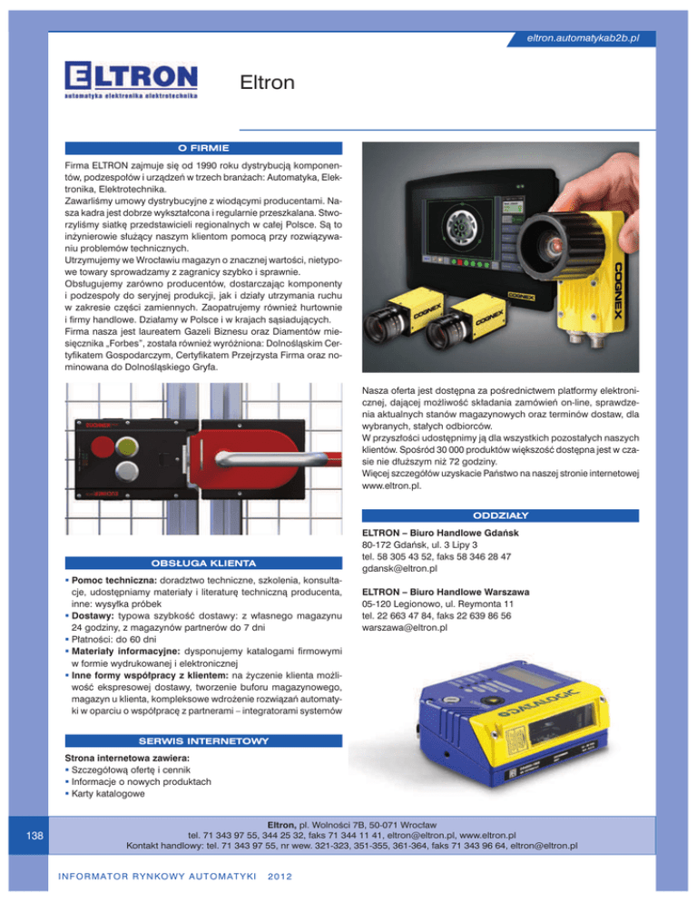 eltron.automatykab2b.pl Eltron O FIRMIE Firma ELTRON zajmuje si od 1990 roku dystrybucj! komponentów, podzespo"ów i urz!dze# w trzech bran$ach: Automatyka, Elektronika, Elektrotechnika. Zawarli%my umowy dystrybucyjne z wiod!cymi producentami. Nasza kadra jest dobrze wykszta"cona i regularnie przeszkalana. Stworzyli%my siatk przedstawicieli regionalnych w ca"ej Polsce. S! to in$ynierowie s"u$!cy naszym klientom pomoc! przy rozwi!zywaniu problemów technicznych. Utrzymujemy we Wroc"awiu magazyn o znacznej warto%ci, nietypowe towary sprowadzamy z zagranicy szybko i sprawnie. Obs"ugujemy zarówno producentów, dostarczaj!c komponenty i podzespo"y do seryjnej produkcji, jak i dzia"y utrzymania ruchu w zakresie cz %ci zamiennych. Zaopatrujemy równie$ hurtownie i Þrmy handlowe. Dzia"amy w Polsce i w krajach s!siaduj!cych. Firma nasza jest laureatem Gazeli Biznesu oraz Diamentów miesi cznika „Forbes”, zosta"a równie$ wyró$niona: Dolno%l!skim CertyÞkatem Gospodarczym, CertyÞkatem Przejrzysta Firma oraz nominowana do Dolno%l!skiego Gryfa. Nasza oferta jest dost pna za po%rednictwem platformy elektronicznej, daj!cej mo$liwo%& sk"adania zamówie# on-line, sprawdzenia aktualnych stanów magazynowych oraz terminów dostaw, dla wybranych, sta"ych odbiorców. W przysz"o%ci udost pnimy j! dla wszystkich pozosta"ych naszych klientów. Spo%ród 30 000 produktów wi kszo%& dost pna jest w czasie nie d"u$szym ni$ 72 godziny. Wi cej szczegó"ów uzyskacie Pa#stwo na naszej stronie internetowej www.eltron.pl. ODDZIA!Y ELTRON – Biuro Handlowe Gda!sk 80-172 Gda#sk, ul. 3 Lipy 3 tel. 58 305 43 52, faks 58 346 28 47 [email protected] OBS!UGA KLIENTA Pomoc techniczna: doradztwo techniczne, szkolenia, konsultacje, udost pniamy materia"y i literatur techniczn! producenta, inne: wysy"ka próbek Dostawy: typowa szybko%& dostawy: z w"asnego magazynu 24 godziny, z magazynów partnerów do 7 dni P"atno%ci: do 60 dni Materia y informacyjne: dysponujemy katalogami firmowymi w formie wydrukowanej i elektronicznej Inne formy wspó pracy z klientem: na $yczenie klienta mo$liwo%& ekspresowej dostawy, tworzenie buforu magazynowego, magazyn u klienta, kompleksowe wdro$enie rozwi!za# automatyki w oparciu o wspó"prac z partnerami – integratorami systemów ELTRON – Biuro Handlowe Warszawa 05-120 Legionowo, ul. Reymonta 11 tel. 22 663 47 84, faks 22 639 86 56 [email protected] SERWIS INTERNETOWY Strona internetowa zawiera: Szczegó"ow! ofert i cennik Informacje o nowych produktach Karty katalogowe 138 Eltron, pl. Wolno%ci 7B, 50-071 Wroc"aw tel. 71 343 97 55, 344 25 32, faks 71 344 11 41, [email protected], www.eltron.pl Kontakt handlowy: tel. 71 343 97 55, nr wew. 321-323, 351-355, 361-364, faks 71 343 96 64, [email protected] I N F O R M AT O R R Y N KO W Y AU T O M AT Y K I 2012 PRODUKTY IMPORTOWANE OFEROWANE PRODUKTY Eltron jest autoryzowanym dystrybutorem Þrm: AUTONICS www.autonics.com BALLUFF www.balluff.com BEI DUNCAN www.beiduncan.com CARLO GAVAZZI www.carlogavazzi.com COGNEX www.cognex.com CONTELEC www.contelec.ch DATALOGIC www.automation.datalogic.com DEEGEE www.deegee.com DENSITRON DIOTEC www.densitron.com www.diotec.com DOLD www.dold.com EAO www.eao.com ELEKTRA TAILFINGEN www.elektra-tailÞngen.de EUCHNER FERRAZ www.euchner.com www.ferrazshawmut.com FLUKE www.ßuke.pl HENGSTLER www.hengstler.com HONEYWELL www.honeywell.com KNICK www.knick.de LAMINA SI www.laminasi.com.pl MEAN WELL www.meanwell.com MEDER www.meder.com MOELLER www.moeller.net MYRRA www.myrra.fr NOVOTECHNIK www.novotechnik.de OMRON www.omron.com.pl PARTEX www.partex.se PEPPERL+FUCHS www.pepperl+fuchs.com PHOENIX CONTACT www.phoenixcontact.pl PILZ RECHNER SALZER SCHROFF SEMIKRON www.pilz.com www.rechner.de www.salzer-electric.com www.schroff.pl www.semikron.com WALDMANN www.waldmann.de Eltron jest partnerem handlowym Þrm: CML www.chml.com EBM-PAPST www.ebmpapst.com EUPEC www.eupec.com FUJI ELECTRIC www.fujielectric.co.jp GOLDENTEK DISPLAY CORP. www.goldentek.com.tw IXYS www.ixys.com MITSUBISHI www.mitsubishichips.com REFOND www.refond.com ST MICROELECTRONICS www.stm.com WIMA www.wima.com Podzespo y pó przewodnikowe: Diody: prostownicze, uniwersalne, Zenera, pojemno%ciowe, Schottky’ego Elementy mocy: tranzystory mocy, diody i' mostki prostownicze, tyrystory, triaki, IGBT, przeka(niki pó"przewodnikowe (SSR) Uk ady scalone: analogowe i'mieszane, cyfrowe logiczne, programowalne, mikrokontrolery Podzespo y optoelektroniczne: Fotoelementy: LED, fotorezystory, fotodiody, fototranzystory Wy"wietlacze: LCD, LED, VFD, matryce punktowe Podzespo y pasywne: Rezystory: standardowe, mocy, potencjometry, termistory, warystory, drabinki Kondensatory: elektrolityczne, ceramiczne, monolityczne, przeciwzak"óceniowe, foliowe Elementy indukcyjne: cewki i' d"awiki, transformatory, rdzenie ferrytowe i'proszkowe, karkasy, filtry EMC Elementy piezoelektroniczne: oscylatory kwarcowe, rezonatory, filtry, buzzery Elementy automatyki: Czujniki: optoelektroniczne, pojemno%ciowe, indukcyjne, ultrad(wi kowe, pola magnetycznego, temperatury, czynników %rodowiskowych Przetworniki: programowalne, uniwersalne, czynników %rodowiskowych Sterowniki: programowalne PLC, numeryczne CNC, silników krokowych, osprz t do sterowników Enkodery: miniaturowe, inkrementalne (przyrostowe), absolutne, akcesoria do enkoderów Zadajniki: nastawniki, panele steruj!ce, klawiatury Liczniki: impulsów, obrotomierze, czasu pracy, programowalne Regulatory: typu P, typu PI, typu PD, typu PID, adaptacyjne, optymalne Skanery kodów kreskowych: przemys"owe skanery kodów kreskowych oraz 2D (Datamatrix), firmy Datalogic O"wietlenie przemys owe: lampy diodowe, oprawy o%wietleniowe, lupy, oprawy rurowe maszynowe Systemy wizyjne do kontroli jako%ci monta$u, wykonania i'po"o$enia otworów oraz oznakowania produktów Podzespo y elektromechaniczne: Przeka#niki: czasowe, kontrolne, przemys"owe, styczniki Bezpieczniki: jednorazowe, automatyczne, powtarzalne, termiczne Prze $czniki: mikroprze"!czniki, p