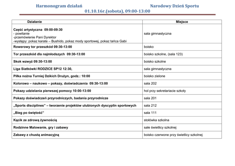 Harmonogram działań Narodowy Dzień Sportu 01.10.16r.(sobo