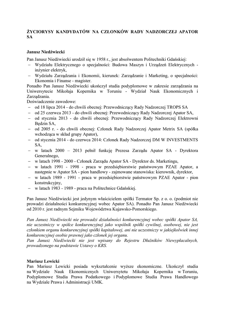 ŻYCIORYSY KANDYDATÓW NA CZŁONKÓW RADY NADZORCZEJ APATOR SA Janusz Niedźwiecki Pan Janusz Niedźwiecki urodził się w 1958 r., jest absolwentem Politechniki Gdańskiej: Wydziału Elektrycznego o specjalności: Budowa Maszyn i Urządzeń Elektrycznych inżynier elektryk, Wydziału Zarządzania i Ekonomii, kierunek: Zarządzanie i Marketing, o specjalności: Ekonomia i Finanse - magister. Ponadto Pan Janusz Niedźwiecki ukończył studia podyplomowe w zakresie zarządzania na Uniwersytecie Mikołaja Kopernika w Toruniu - Wydział Nauk Ekonomicznych i Zarządzania. Doświadczenie zawodowe: od 18 lipca 2014 - do chwili obecnej: Przewodniczący Rady Nadzorczej TROPS SA od 25 czerwca 2013 - do chwili obecnej: Przewodniczący Rady Nadzorczej Apator SA, od stycznia 2013 - do chwili obecnej: Przewodniczący Rady Nadzorczej Elektrowni Będzin SA, od 2005 r. - do chwili obecnej: Członek Rady Nadzorczej Apator Metrix SA (spółka wchodząca w skład grupy Apator), od stycznia 2014 - do czerwca 2014: Członek Rady Nadzorczej DM W INVESTMENTS SA, w latach 2000 – 2013 pełnił funkcję Prezesa Zarządu Apator SA - Dyrektora Generalnego, w latach 1998 - 2000 - Członek Zarządu Apator SA - Dyrektor ds. Marketingu, w latach 1991 - 1998 - praca w przedsiębiorstwie państwowym PZAE Apator, a następnie w Apator SA - pion handlowy - zajmowane stanowiska: kierownik, dyrektor, w latach 1989 - 1991 - praca w przedsiębiorstwie państwowym PZAE Apator - pion konstrukcyjny, w latach 1983 - 1989 - praca na Politechnice Gdańskiej. Pan Janusz Niedźwiecki jest jedynym właścicielem spółki Termator Sp. z o. o. (podmiot nie prowadzi działalności konkurencyjnej wobec Apator SA). Ponadto Pan Janusz Niedźwiecki od 2010 r. jest radnym Sejmiku Województwa Kujawsko-Pomorskiego. Pan Janusz Niedźwiecki nie prowadzi działalności konkurencyjnej wobec spółki Apator SA, nie uczestniczy w spółce konkurencyjnej jako wspólnik spółki cywilnej, osobowej, nie jest członkiem organu konkurencyjnej spółki kapitałowej, ani nie uczestniczy w jakiejkolwiek innej konkurencyjnej osobie prawnej jako członek jej organu. Pan Janusz Niedźwiecki nie jest wpisany do Rejestru Dłużników Niewypłacalnych, prowadzonego na podstawie Ustawy o KRS. Mariusz Lewicki Pan Mariusz Lewicki posiada wykształcenie wyższe ekonomiczne. Ukończył studia na Wydziale Nauk Ekonomicznych Uniwersytetu Mikołaja Kopernika w Toruniu, Podyplomowe Studia Prawa Podatkowego i Podyplomowe Studia Prawa Handlowego na Wydziale Prawa i Administracji UMK. Pan Mariusz Lewicki pracował jako księgowy w firmie Spomasz, następnie w latach 1991 1999 był związany zawodowo z przedsiębiorstwem państwowym PZAE Apator, a następnie ze spółką Apator SA, gdzie kierował Działem Księgowości. W okresie od 1994 do 2001 roku pracował jako Główny Księgowy najpierw w spółce Reuther Polska Sp. z o.o., następnie w Rotar Poland Sp. z o.o. W latach 2001 - 2007 roku pracował w spółce Apator Control Sp. z o.o. na stanowisku Dyrektora Finansowego i pełnił funkcję Prokurenta. Od 1993 roku do lutego 2013 roku Pan Mariusz Lewicki pracował na stanowisku Głównego Księgowego w firmie ZPDZ "Nagro". Od kwietnia 2007 roku pełni funkcję doradcy finansowego w Z.P.H.U. Walter (podmiot nie prowadzi działalności konkurencyjnej wobec Apator SA). Od listopada 2010 roku Pan Mariusz Lewicki pełnił funkcję doradcy zarządu i Dyrektora Rozwoju Biznesu w Więcborskich Zakładach Metalowych "Wizamor" Sp. z o.o. (podmiot nie prowadzi działalności konkurencyjnej wobec Apator SA). Od listopada 2014 r. pełni funkcję doradcy finansowego oraz Członka Rady Nadzorczej Zakładów Metalowych "Wizamor" Sp. z o.o. Od stycznia 2012 roku pełni funkcję doradcy finansowego w firmie "Wimplast" Sp. z o.o. (podmiot nie prowadzi działalności konkurencyjnej wobec Apator SA). Pan Mariusz Lewicki posiada wieloletnie doświadczenie w pełnieniu funkcji nadzorczych: od 2000 roku jest Członkiem Rady Nadzorczej Apator SA, jednocześnie od 2010 roku pełni funkcję Zastępcy Przewodniczącego Rady Nadzorczej spółki Apator SA, od 2005 roku pełni funkcję Przewodniczącego Rady Nadzorczej spółki Apator Mining Sp. z o. o. (spółka wchodząca w skład grupy Apator), od 2007 r. jest Przewodniczącym Rady Nadzorczej spółki Apator Metrix SA (spółka wchodząca w skład grupy Apator), od kwietnia 2014 r. wchodzi w skład Rady Nadzorczej spółki Apator Elkomtech SA (spółka wchodząca w skład grupy Apator). Pan Mariusz Lewicki jest także Przewodniczącym Komitetu Audytu w Spółce Apator SA. Ponadto Pan Mariusz Lewicki jest Przewodniczącym Rady Nadzorczej i Komitetu Audytu Przedsiębiorstwa Hydrauliki Siłowej Hydrotor SA (podmiot nie prowadzi działalności konkurencyjnej wobec Apator SA). Pan Mariusz Lewicki nie prowadzi działalności konkurencyjnej wobec spółki Apator SA, nie uczestniczy w spółce konkurencyjnej jako wspólnik spółki cywilnej, osobowej, nie jest członkiem organu konkurencyjnej spółki kapitałowej, ani nie uczestniczy w jakiejkolwiek innej konkurencyjnej osobie prawnej jako Członek jej organu. Pan Mariusz Lewicki nie jest wpisany do Rejestru Dłużników Niewypłacalnych, prowadzonego na podstawie Ustawy o KRS. Janusz Marzygliński Pan Janusz Marzygliński posiada wykształcenie wyższe techniczne. Ukończył studia na Wydziale Elektrycznym Politechniki Gdańskiej, Podyplomowe Studium Organizacji i Zarządzania dla Kadry Kierowniczej Przedsiębiorstw oraz kurs Zarządzania i Marketingu w Chicago (USA). Pan Janusz Marzygliński od 1971 roku związany jest z Apatorem. Pracował między innymi jako Kierownik działu konstrukcyjnego, zastępca Dyrektora ds. produkcji, zastępca Dyrektora ds. handlu, Dyrektor przedsiębiorstwa i Prezes Zarządu. Pan Janusz Marzygliński posiada doświadczenie w pełnieniu funkcji nadzorczych i zarządczych: od 2000 r. jest Członkiem Rady Nadzorczej Apator SA, jednocześnie w okresie od czerwca 2003 roku do czer