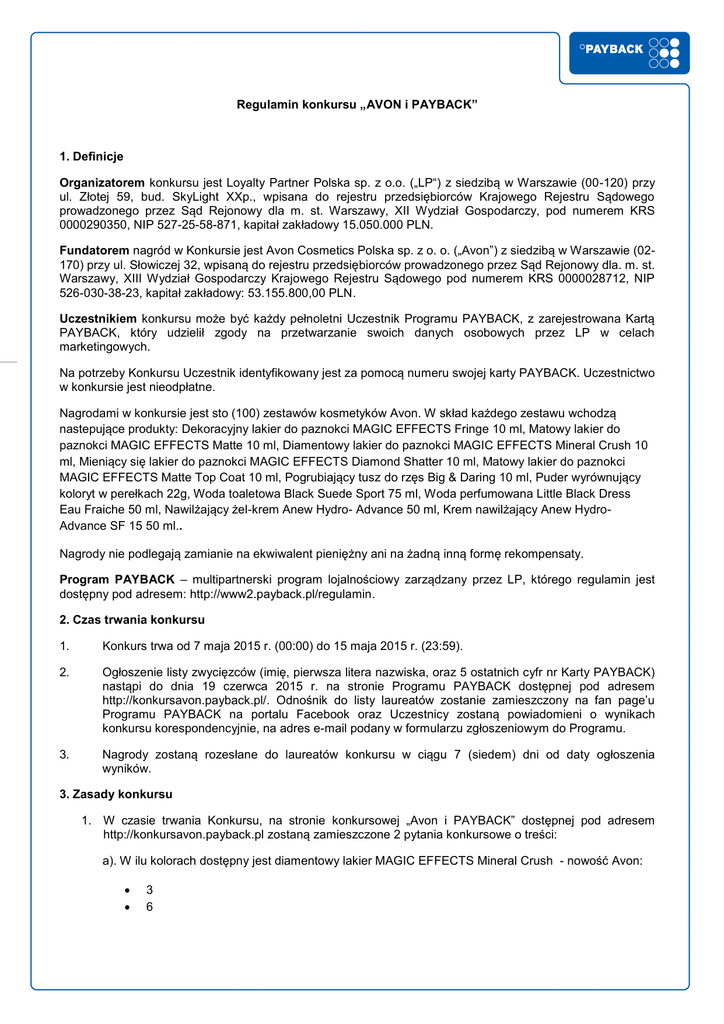 Regulamin konkursu „AVON i PAYBACK” 1. Definicje Organizatorem konkursu jest Loyalty Partner Polska sp. z o.o. („LP“) z siedzibą w Warszawie (00-120) przy ul. Złotej 59, bud. SkyLight XXp., wpisana do rejestru przedsiębiorców Krajowego Rejestru Sądowego prowadzonego przez Sąd Rejonowy dla m. st. Warszawy, XII Wydział Gospodarczy, pod numerem KRS 0000290350, NIP 527-25-58-871, kapitał zakładowy 15.050.000 PLN. Fundatorem nagród w Konkursie jest Avon Cosmetics Polska sp. z o. o. („Avon”) z siedzibą w Warszawie (02170) przy ul. Słowiczej 32, wpisaną do rejestru przedsiębiorców prowadzonego przez Sąd Rejonowy dla. m. st. Warszawy, XIII Wydział Gospodarczy Krajowego Rejestru Sądowego pod numerem KRS 0000028712, NIP 526-030-38-23, kapitał zakładowy: 53.155.800,00 PLN. Uczestnikiem konkursu może być każdy pełnoletni Uczestnik Programu PAYBACK, z zarejestrowana Kartą PAYBACK, który udzielił zgody na przetwarzanie swoich danych osobowych przez LP w celach marketingowych. Na potrzeby Konkursu Uczestnik identyfikowany jest za pomocą numeru swojej karty PAYBACK. Uczestnictwo w konkursie jest nieodpłatne. Nagrodami w konkursie jest sto (100) zestawów kosmetyków Avon. W skład każdego zestawu wchodzą nastepujące produkty: Dekoracyjny lakier do paznokci MAGIC EFFECTS Fringe 10 ml, Matowy lakier do paznokci MAGIC EFFECTS Matte 10 ml, Diamentowy lakier do paznokci MAGIC EFFECTS Mineral Crush 10 ml, Mieniący się lakier do paznokci MAGIC EFFECTS Diamond Shatter 10 ml, Matowy lakier do paznokci MAGIC EFFECTS Matte Top Coat 10 ml, Pogrubiający tusz do rzęs Big & Daring 10 ml, Puder wyrównujący koloryt w perełkach 22g, Woda toaletowa Black Suede Sport 75 ml, Woda perfumowana Little Black Dress Eau Fraiche 50 ml, Nawilżający żel-krem Anew Hydro- Advance 50 ml, Krem nawilżający Anew HydroAdvance SF 15 50 ml.. Nagrody nie podlegają zamianie na ekwiwalent pieniężny ani na żadną inną formę rekompensaty. Program PAYBACK – multipartnerski program lojalnościowy zarządzany przez LP, którego regulamin jest dostępny pod adresem: http://www2.payback.pl/regulamin. 2. Czas trwania konkursu 1. Konkurs trwa od 7 maja 2015 r. (00:00) do 15 maja 2015 r. (23:59). 2. Ogłoszenie listy zwycięzców (imię, pierwsza litera nazwiska, oraz 5 ostatnich cyfr nr Karty PAYBACK) nastąpi do dnia 19 czerwca 2015 r. na stronie Programu PAYBACK dostępnej pod adresem http://konkursavon.payback.pl/. Odnośnik do listy laureatów zostanie zamieszczony na fan page’u Programu PAYBACK na portalu Facebook oraz Uczestnicy zostaną powiadomieni o wynikach konkursu korespondencyjnie, na adres e-mail podany w formularzu zgłoszeniowym do Programu. 3. Nagrody zostaną rozesłane do laureatów konkursu w ciągu 7 (siedem) dni od daty ogłoszenia wyników. 3. Zasady konkursu 1. W czasie trwania Konkursu, na stronie konkursowej „Avon i PAYBACK” dostępnej pod adresem http://konkursavon.payback.pl zostaną zamieszczone 2 pytania konkursowe o treści: a). W ilu kolorach dostępny jest diamentowy lakier MAGIC EFFECTS Mineral Crush - nowość Avon: 3 6 9 12 b). Czego będziesz życzyć swojej mamie w dniu jej święta? 2. Odpowiedzi na pytania konkursowe można udzielać na stronie konkursowej http://konkursavon.payback.pl. Wraz z odpowiedzią na pytania konkursowe, należy podać numer posiadanej Karty PAYBACK. Zgłoszone odpowiedzi zostaną ocenione przez komisję konkursową, składającą się z osób wybranych przez Organizatora. Komisja oceni zgłoszone odpowiedzi jako kryterium przyjmując poprawność odpowiedzi, kreatywność Uczestników, racjonalność uzasadnienia oraz unikatowość zgłoszeń, a następnie wybierze 100 (stu) Laureatów, którym przyznane zostaną Nagrody. 3. W przypadku niemożliwości wydania Nagrody spowodowanej nieprawdziwością danych identyfikacyjnych, ustalanych na podstawie informacji podanych w formularzu zgłoszeniowym do Konkursu z danymi znajdującymi się w bazie danych Programu PAYBACK (uprzednio podanych przez Laureata w procesie rejestracji do Programu PAYBACK), co uniemożliwia ustalenie tożsamości Laureata, Organizator przyzna Nagrodę kolejnemu co do wysokości punktacji przyznanej przez Komisję Uczestnikowi. 4. Czas przyjęcia odpowiedzi (data dzienna i godzina) rozstrzygany jest zgodnie z rejestracją odpowiedzi w systemie informatycznym Organizatora. Organizator zobowiązuje się dochować należytej staranności, nie odpowiada jednak za niezależne od niego zakłócenia pracy infrastruktury technicznej wykorzystywanej do zgłaszania odpowiedzi. 5. Podanie nr Karty PAYBACK oraz udzielenie odpowiedzi na pytanie konkursowe jest równoznaczne z akceptacją niniejszego Regulaminu oraz udzieleniem na rzecz Organizatora niewyłącznej, nieodpłatnej, nieograniczonej terytorialnie ani czasowo licencji na komercyjne posługiwanie się udzielonymi na pytanie konkursowe odpowiedziami na następujących polach eksploatacji: utrwalanie, powielanie (bez ograniczeń dotyczących liczby kopii ani nośników danych), wprowadzenie do pamięci komputerów, sieci (zewnętrznych lub wewnętrznych, w tym sieci Internet), publiczne prezentowanie lub udostępnienie (odpłatne lub wolne od opłat), także na stronie (lub podstronach) www.payback.pl, w reklamach drukowanych, lub w formie elektronicznej (w tym dystrybuowanej wśród Uczestników Programu PAYBACK, lub serwisach społecznościowych takich jak www.facebook.com, lub serwisach www.youtube.com, www.vimeo.com itp., udzielenia licencji osobom trzecim, dostosowanie, modyfikowanie oraz rozwijanie (w tym: formatowanie, łączenie z innymi utworami, komentowanie), oraz tworzenie praw zależnych. 6. Odpowiedzi zawierające treści dyskryminujące, mogące naruszyć uczucia religijne lub poczucie przynależności narodowej lub etnicznej, a także zawierające treści wulgarne lub odnoszące się do tożsamości konkretnych osób poprzez dane identyfikujące te osoby, są wyłączone z udziału w Konku