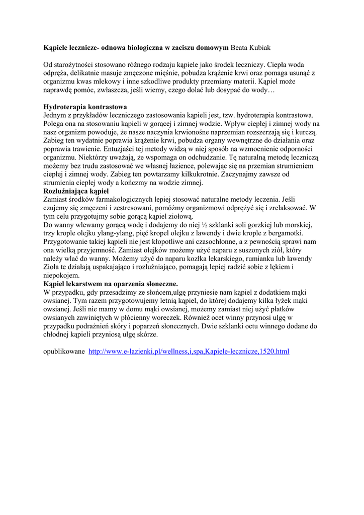 Kąpiele lecznicze- odnowa biologiczna w zaciszu domowym Beata Kubiak Od starożytności stosowano różnego rodzaju kąpiele jako środek leczniczy. Ciepła woda odpręża, delikatnie masuje zmęczone mięśnie, pobudza krążenie krwi oraz pomaga usunąć z organizmu kwas mlekowy i inne szkodliwe produkty przemiany materii. Kąpiel może naprawdę pomóc, zwłaszcza, jeśli wiemy, czego dolać lub dosypać do wody… Hydroterapia kontrastowa Jednym z przykładów leczniczego zastosowania kąpieli jest, tzw. hydroterapia kontrastowa. Polega ona na stosowaniu kąpieli w gorącej i zimnej wodzie. Wpływ ciepłej i zimnej wody na nasz organizm powoduje, że nasze naczynia krwionośne naprzemian rozszerzają się i kurczą. Zabieg ten wydatnie poprawia krążenie krwi, pobudza organy wewnętrzne do działania oraz poprawia trawienie. Entuzjaści tej metody widzą w niej sposób na wzmocnienie odporności organizmu. Niektórzy uważają, że wspomaga on odchudzanie. Tę naturalną metodę leczniczą możemy bez trudu zastosować we własnej łazience, polewając się na przemian strumieniem ciepłej i zimnej wody. Zabieg ten powtarzamy kilkukrotnie. Zaczynajmy zawsze od strumienia ciepłej wody a kończmy na wodzie zimnej. Rozluźniająca kąpiel Zamiast środków farmakologicznych lepiej stosować naturalne metody leczenia. Jeśli czujemy się zmęczeni i zestresowani, pomóżmy organizmowi odprężyć się i zrelaksować. W tym celu przygotujmy sobie gorącą kąpiel ziołową. Do wanny wlewamy gorącą wodę i dodajemy do niej ½ szklanki soli gorzkiej lub morskiej, trzy krople olejku ylang-ylang, pięć kropel olejku z lawendy i dwie krople z bergamotki. Przygotowanie takiej kąpieli nie jest kłopotliwe ani czasochłonne, a z pewnością sprawi nam ona wielką przyjemność. Zamiast olejków możemy użyć naparu z suszonych ziół, który należy wlać do wanny. Możemy użyć do naparu kozłka lekarskiego, rumianku lub lawendy Zioła te działają uspakajająco i rozluźniająco, pomagają lepiej radzić sobie z lękiem i niepokojem. Kąpiel lekarstwem na oparzenia słoneczne. W przypadku, gdy przesadzimy ze słońcem,ulgę przyniesie nam kąpiel z dodatkiem mąki owsianej. Tym razem przygotowujemy letnią kąpiel, do której dodajemy kilka łyżek mąki owsianej. Jeśli nie mamy w domu mąki owsianej, możemy zamiast niej użyć płatków owsianych zawiniętych w płócienny woreczek. Również ocet winny przynosi ulgę w przypadku podrażnień skóry i poparzeń słonecznych. Dwie szklanki octu winnego dodane do chłodnej kąpieli przyniosą ulgę skórze. opublikowane http://www.e-lazienki.pl/wellness,i,spa,Kapiele-lecznicze,1520.html