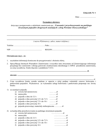 Załącznik Nr 1 Data: ................................ Formularz ofertowy dotyczący postępowania o udzielenie zamówienia pn.,, Usuwanie i przechowywanie na parkingu strzeżonym pojazdów drogowych usuniętych z dróg Powiatu Choszczeńskiego” .................................................................................................................................................................................... .................................................................................................................................................................................... ( nazwa Wykonawcy, adres, numer telefonu ). Telefon: ……………………………………….. Faks:......................................................... NIP: .............................................................. REGON:................................................... Oświadczam (my) , że: 1. uzyskałem informacje konieczne do przygotowania i złożenia oferty, 2. Specyfikację Istotnych Warunków Zamówienia i wszystkie inne otrzymane od Zamawiającego informacje przyjmuję bez zastrzeżeń i oferuję gotowość zrealizowania określonego w SIWZ przedmiotu zamówienia, za cenę ryczałtową brutto (łącznie z podatkiem VAT): ........................................................................................................................................................... zł. słownie: .......................................................................................................................................................... ........................................................................................................................................................................ zł 3. Cena ryczałtowa brutto została ustalona w oparciu o niżej podane wskaźniki cenowe holowania i parkowania pojazdów. Wykonawca za wykonanie usługi holowania i parkowania proponuje nst. kwoty brutto: 1) za usunięcie pojazdu: a) roweru lub motoroweru …… ….zł b) motocykla ………. zł c) pojazdu o dmc do 3,5 t ………. zł d) pojazdu o dmc powyżej 3,5 t do 7,5 t ……….zł e) pojazdu o dmc powyżej 7,5 t do 16 t ……… zł f) pojazdu o dmc powyżej 16 t ……….zł g) pojazdu przewożący materiały niebezpieczne ……….. zł 2) za każdą dobę przechowywania na parkingu strzeżonym pojazdu: a) roweru lub motoroweru …………….. zł b) motocykla ………………zł c) pojazdu o dmc do 3,5 t ……………... zł d) pojazdu o dmc powyżej 3,5 t do 7,5 t ……………... zł e) pojazdu o dmc powyżej 7,5 t do 16 t ………………zł f) pojazdu o dmc powyżej 16 t ……………... zł g) pojazdu przewożącego materiały niebezpieczne …………zł 4) za odstąpienie od usunięcia pojazdu: h) i) j) k) l) m) roweru lub motoroweru motocykla pojazdu o dmc do 3,5 t pojazdu o dmc powyżej 3,5 t do 7,5 t pojazdu o dmc powyżej 7,5 t do 16 t pojazdu o dmc powyżej 16 t ……………. ..zł …………….....zł ……………… zł ……………....zł ………………zł ………………zł n) pojazdu przewożącego materiały niebezpieczne ………..…zł 4. zobowiązuję się do realizacji zamówienia w terminie 25 miesięcy licząc od dnia 01.12.2013r. do dnia 31.12.2015r. 5. uważam się związany ofertą przez 30 dni od daty złożenia oferty, a w przypadku wygrania przetargu przez cały czas trwania umowy. 6. jestem uprawniony do wykonywania działalności i posiadam aktualną licencję na wykonywanie krajowego transportu drogowego rzeczy lub zezwolenie na wykonywanie zawodu przewoźnika drogowego zgodnie z ustawą z dnia 06 września 2001 r. o transporcie drogowym. (tekst jedn. Dz.U. 2012 poz. 1265 z późn. zm), 7. dysponuję co najmniej dwoma pojazdami specjalnymi typu laweta do przewozu pojazdów do 3,5 tony, jednym pojazdem do holowania pojazdów do 7,5 tony i jednym pojazdem do holowania pojazdów powyżej 16 ton odpowiednio przystosowanym i wyposażonym w wyciągarkę, 8. posiadam/dysponuję parkingiem odpowiednio ogrodzonym, oświetlonym, strzeżonym z całodobowym dozorem, posiadającym wydzielone miejsce do przetrzymywania pojazdów z wyciekiem oleju oraz innych płynów eksploatacyjnych, z wydzielonym miejscem oświetlonym i zabezpieczonym przed negatywnym wpływem warunków atmosferycznych oraz wydzielonymi 2 miejscami na postój pojazdów przewożących ładunki niebezpieczne, 9. spełniam wszystkie warunki udziału w postępowaniu i nie podlegam wykluczeniu, 10. zobowiązuję się do realizacji każdego zlecenia usunięcia pojazdu z drogi i umieszczenia pojazdu na parkingu strzeżonym, 11. akceptuję warunki przyszłej umowy, 12. upoważniam Zamawiającego bądź upoważnionych przez niego przedstawicieli do przeprowadzenia wszelkich badań mających na celu sprawdzenie dokumentów i przedłożonych informacji oraz wyjaśnienia formalnych i technicznych aspektów naszej oferty. Do tych celów upoważniamy każdą osobę publiczną, bank lub przedsiębiorstwo wymienione w mojej(-naszej) ofercie do dostarczenia stosownej informacji uznanej przez Zamawiającego za konieczną i wymaganą w celu sprawdzenia dokumentów i oświadczeń zawartych w naszej ofercie, 13. zobowiązuję się na każdy kolejny rok trwania umowy, aż do jej rozwiązania, przedkładać dokument potwierdzający ubezpieczenie od odpowiedzialności cywilnej na warunkach opisanych w siwz. 14. na niniejszą ofertę składa się ...... kolejno ponumerowanych stron. ...................................................................................................... (podpis i pieczęć upoważnionego (-nych) przedstawiciela (-li) Wykonawcy) Wykaz załączników: 1. oświadczenie o spełnieniu warunków w postępowaniu( art. 22 ust. 1 PZP) , wg załącznika nr 1a, 2. oświadczenie wykonawcy, że nie podlega wykluczeniu z postępowania( art. 24 ust. 1 PZP), wg załącznika nr 1b, 3. oświadczenie o dysponowaniu pojazdami, wg